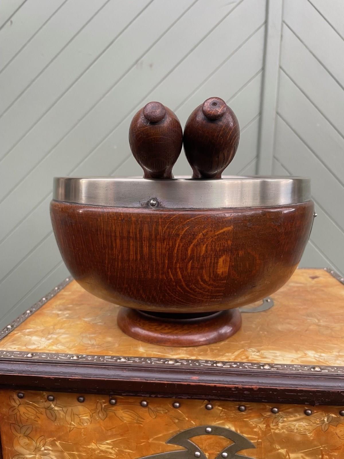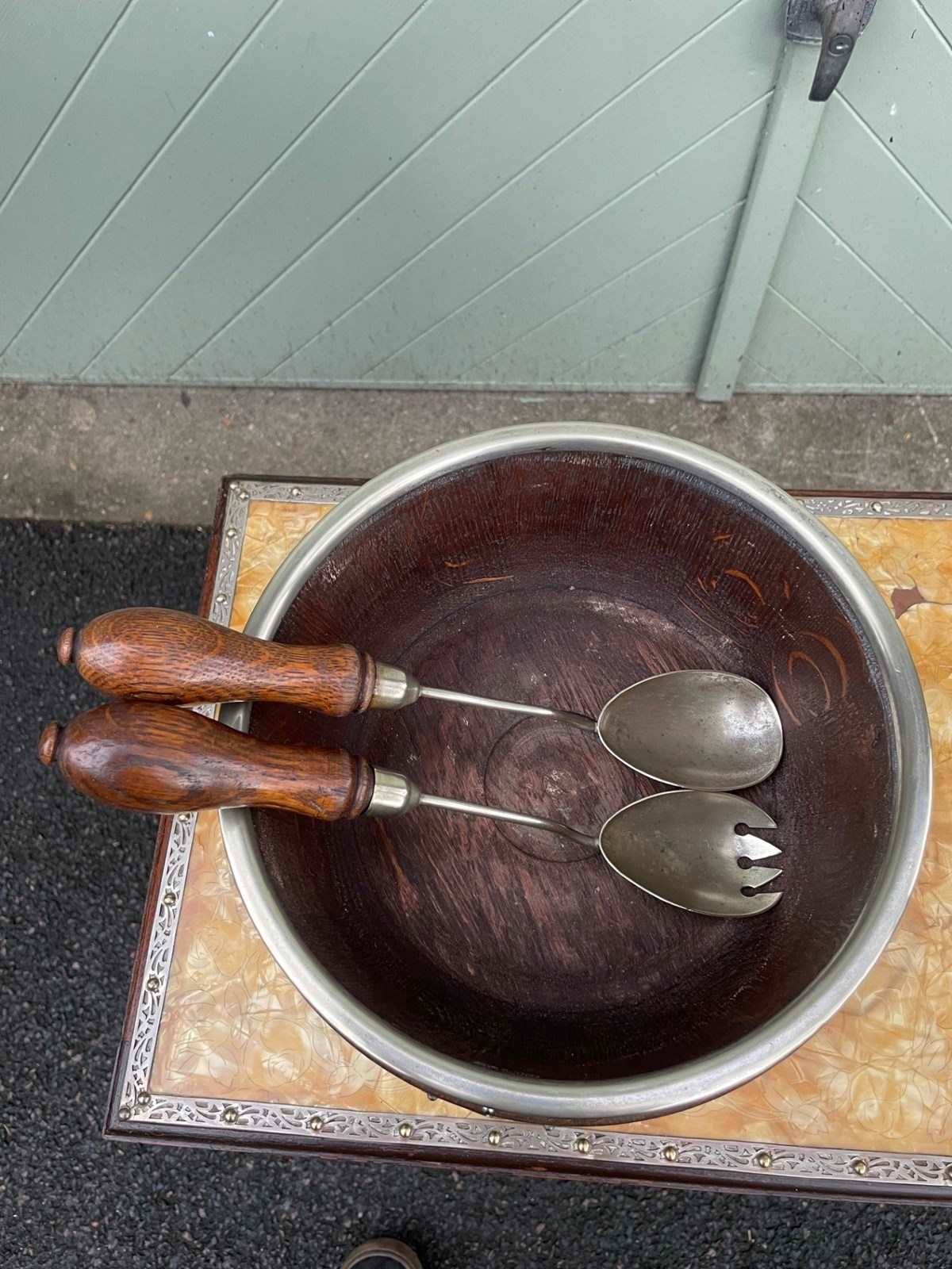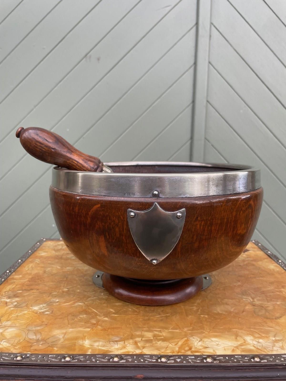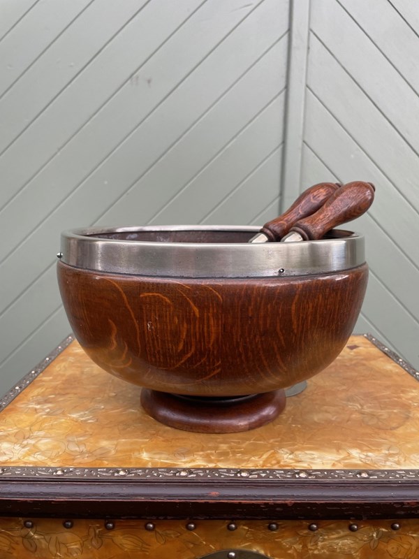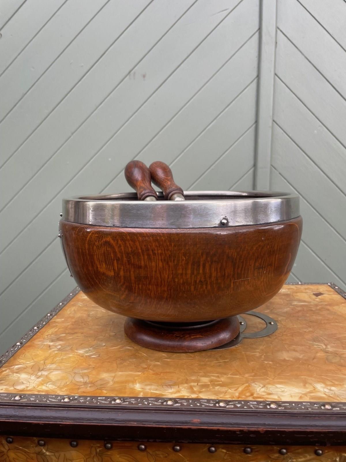 Round oak bowl with silver plated rim & shield motif. Pair of matching servers