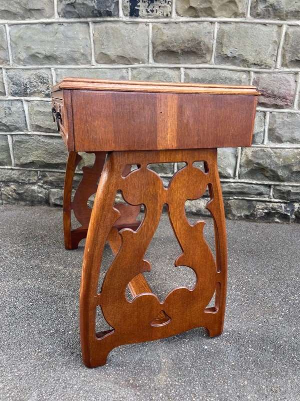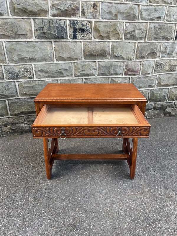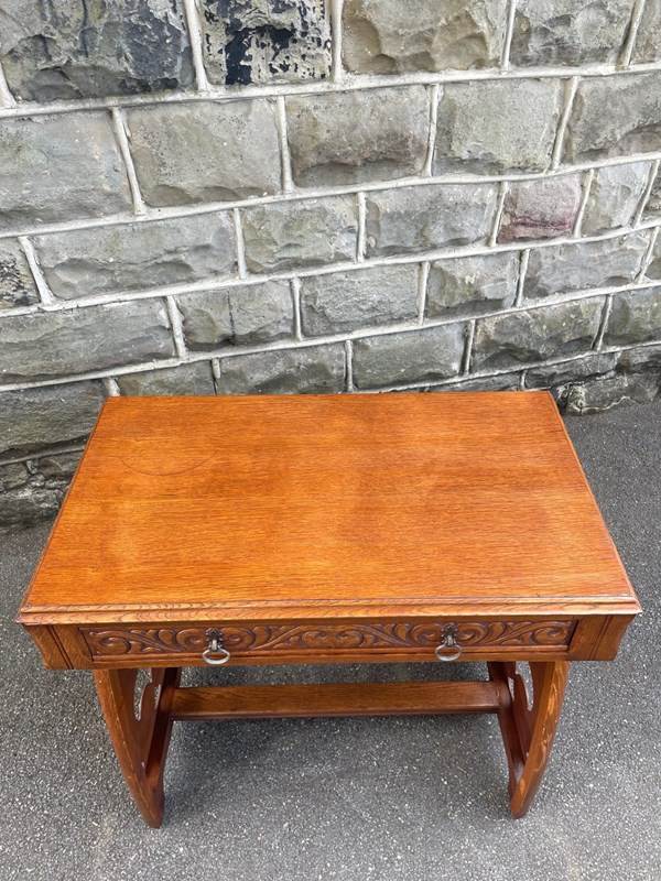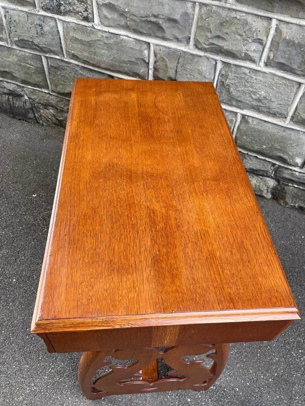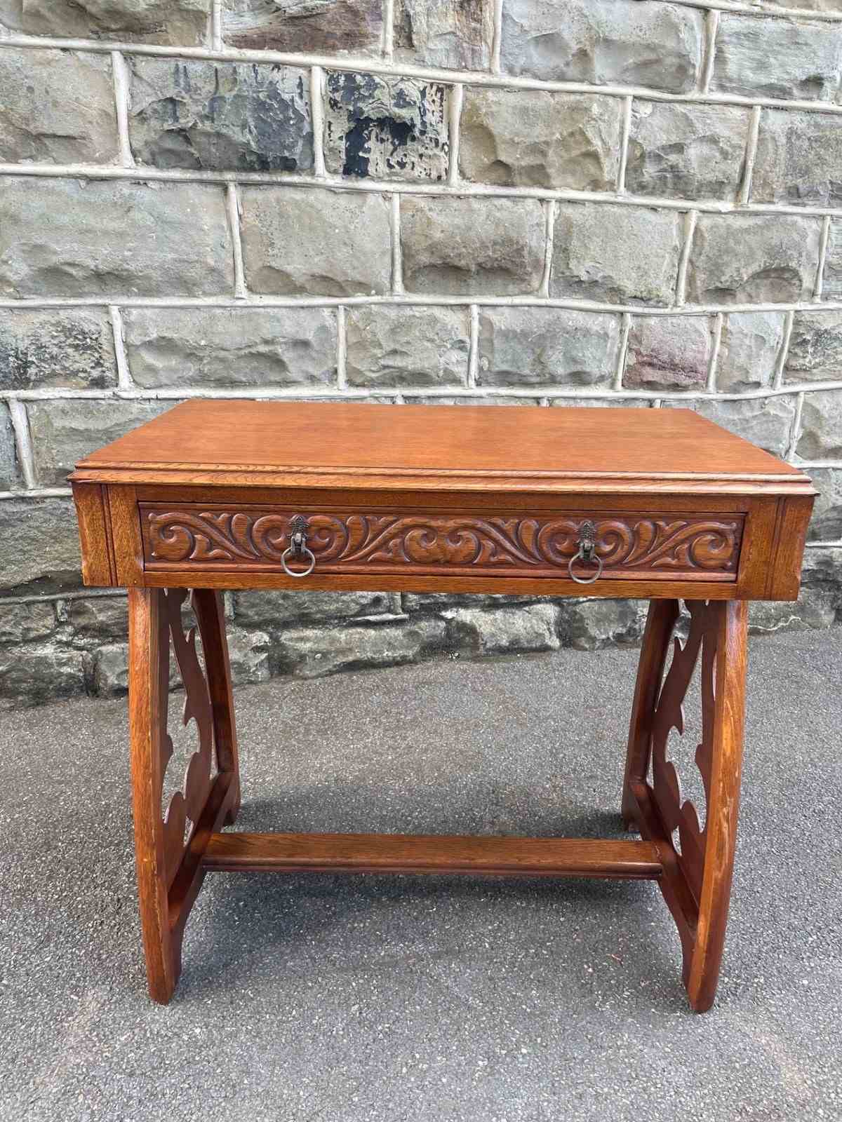 In oak having single draw with carved decoration to the front with cast ring handles. Standing on shaped legs with ornate pierced fret sides with central stretcher.