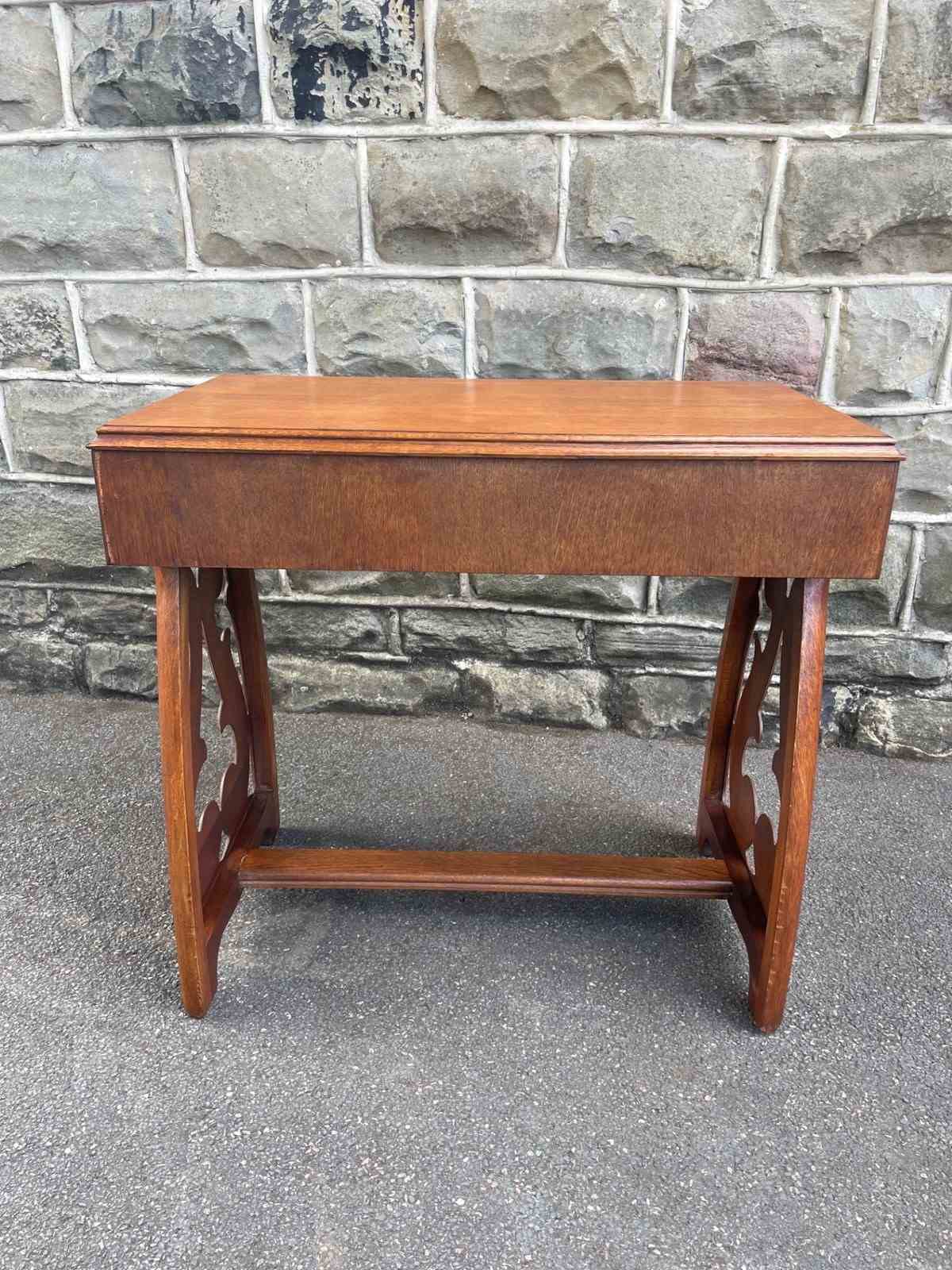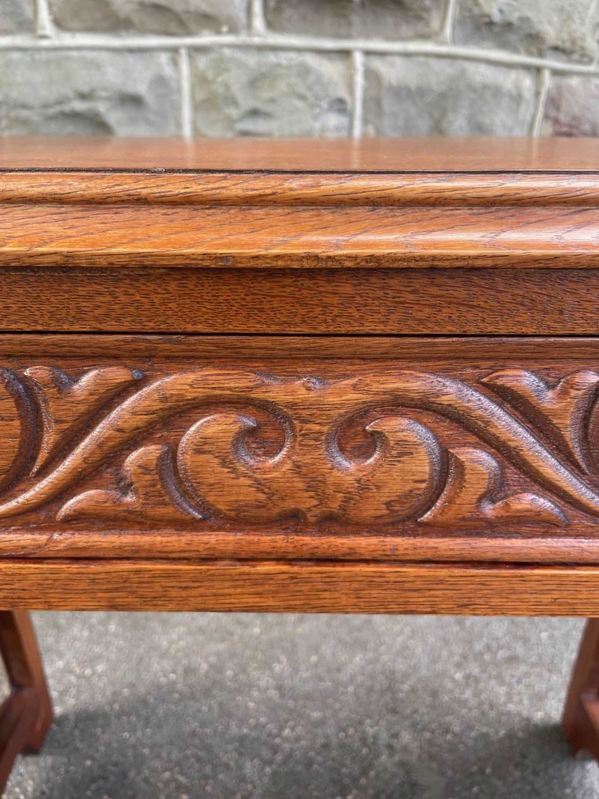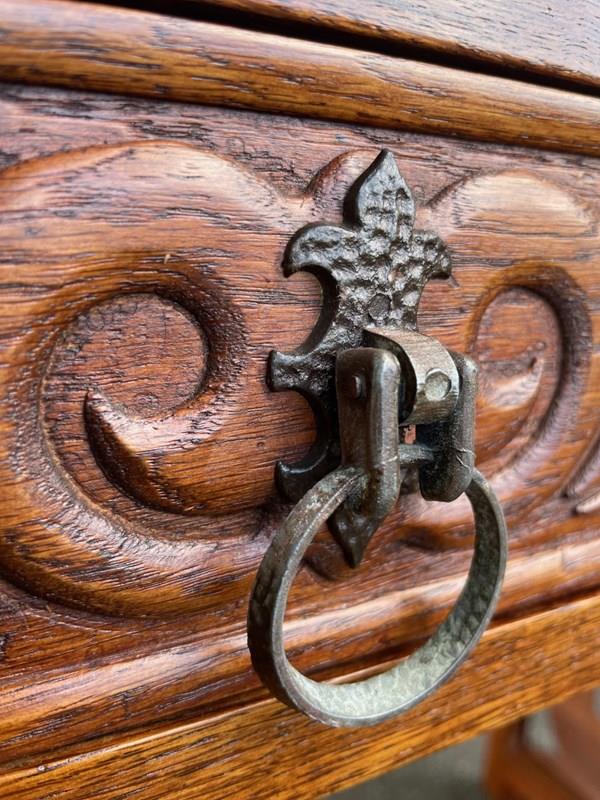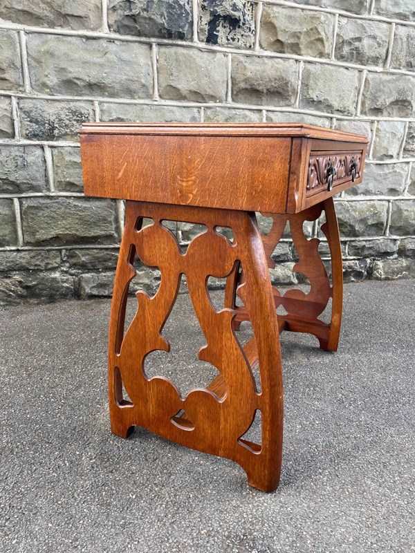In oak having single draw with carved decoration to the front with cast ring handles. Standing on shaped legs with ornate pierced fret sides with central stretcher.