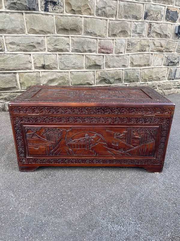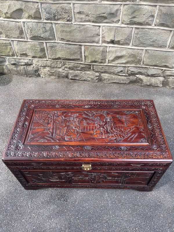 Ideal as a coffee table or bedding box. Oriental Chinese made for the export market. Solid camphor. Nice quality carved scenes to the top, front & sides. Ornate brass lock plate, standing on carved bracket style feet. Lovely colour.
