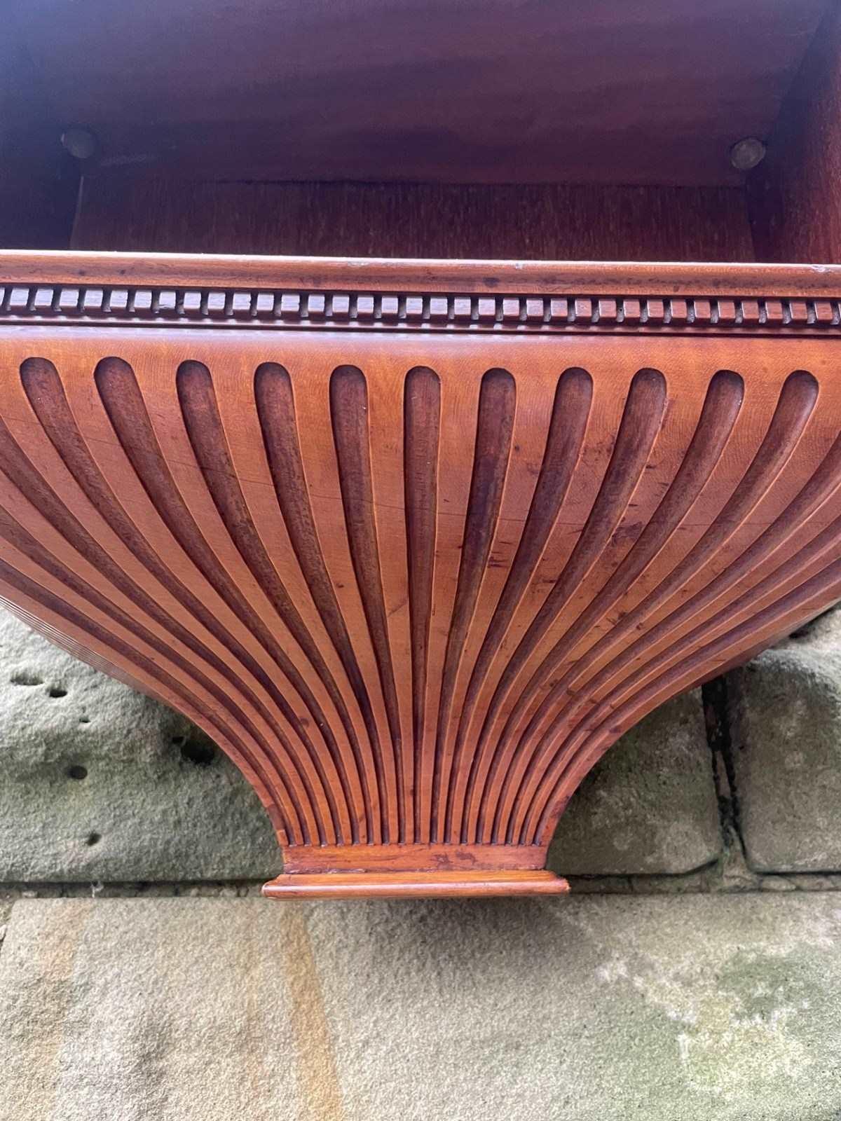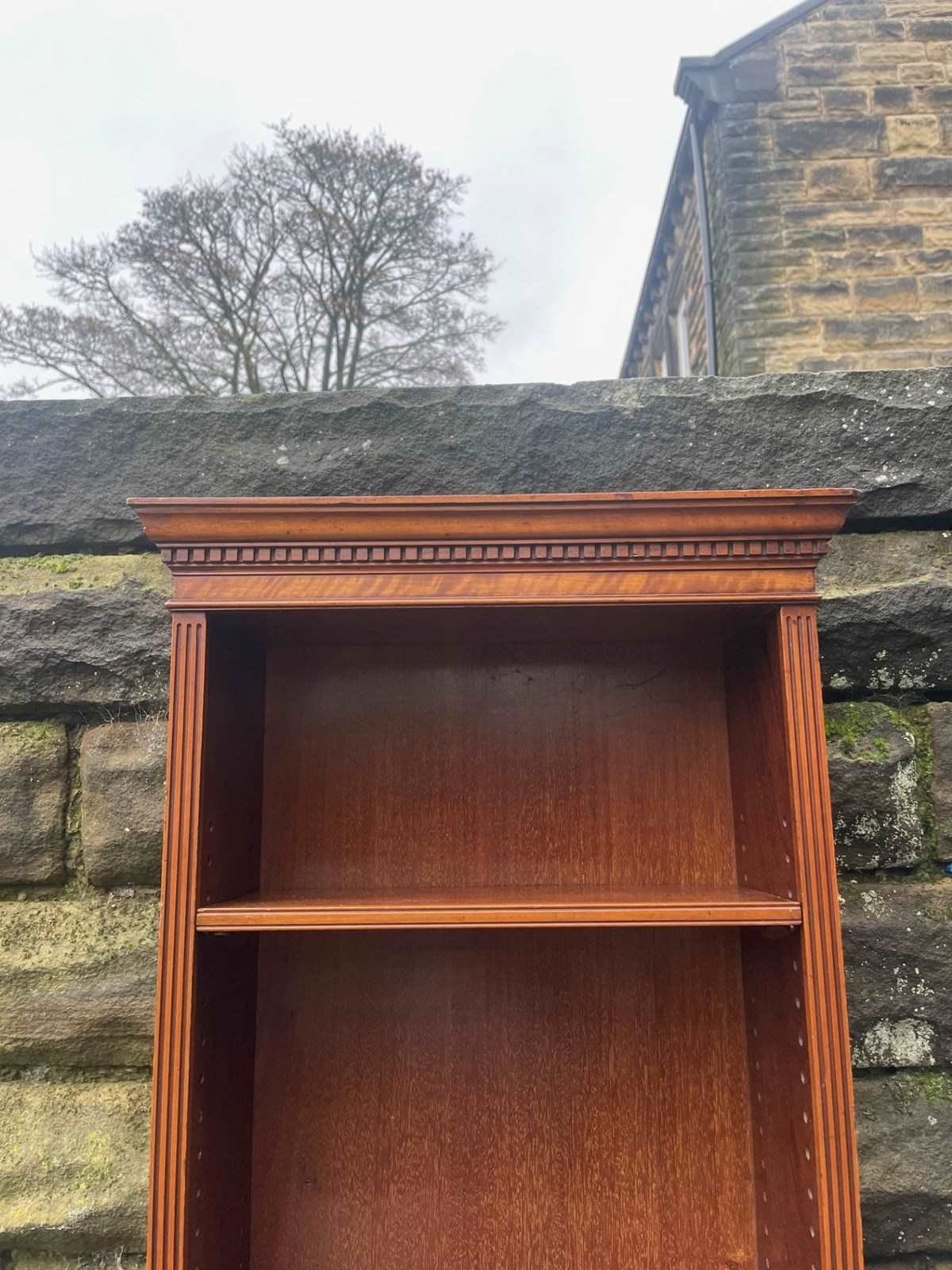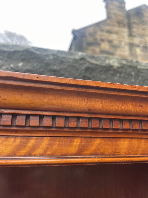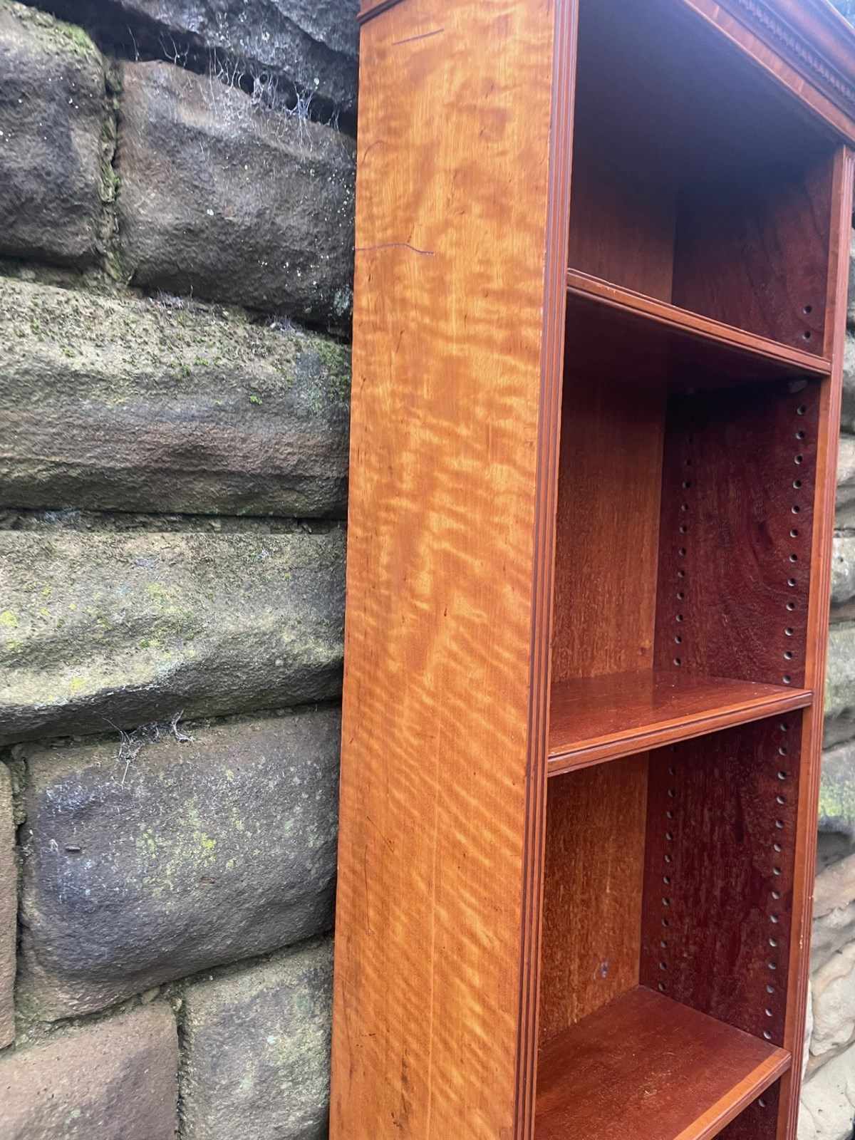 In satinwood having dental moulded cornice, 3 original height adjustable shelves with shaped pediment to the bottom
