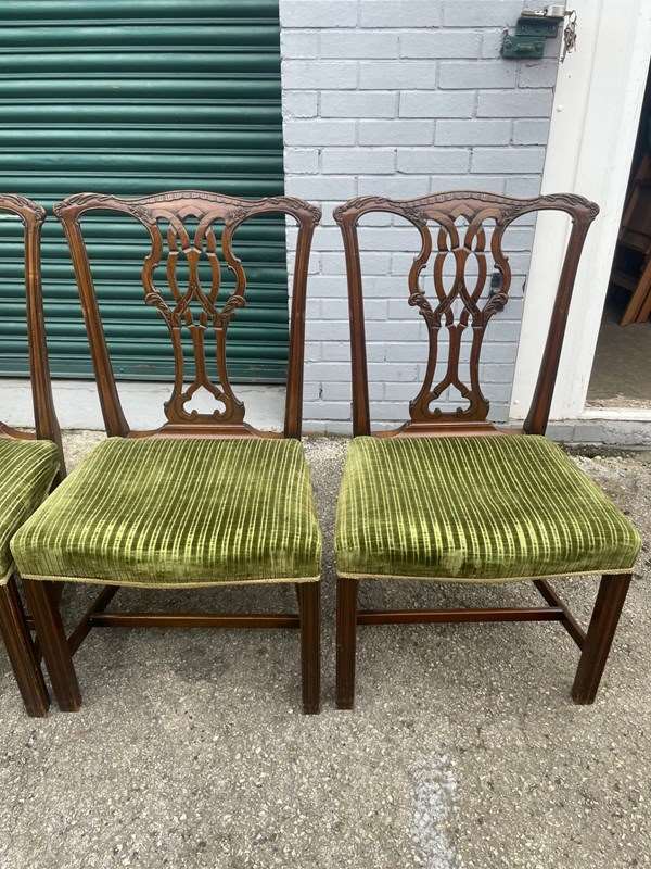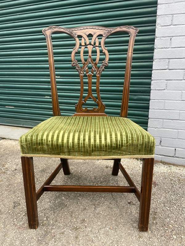Offered for sale is this good quality antique set of 8 antique mahogany dining chairs. Good size & scale with a nice wide seat area. Made in the Chippendale style, well crisply cavred shaped top rail, pierced central splat, original covering to the seats, standing square chamffered legs with stretcher. 6 single chairs & a pair of carver chairs. All the chairs are very solid and sturdy. One carver seat has wear to the upholstery cover, the original white covering underneath is fine.