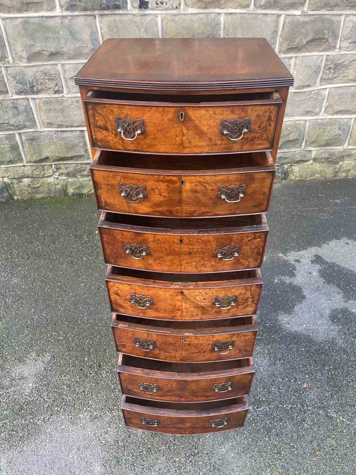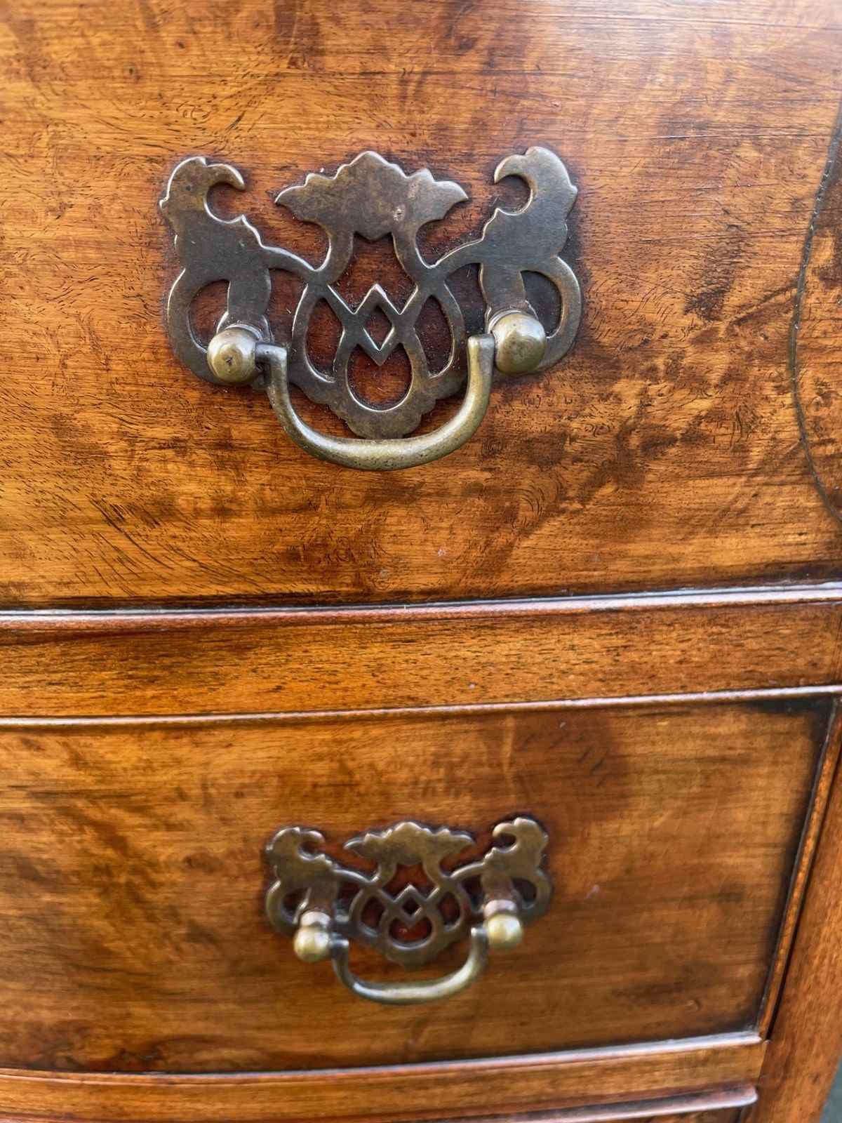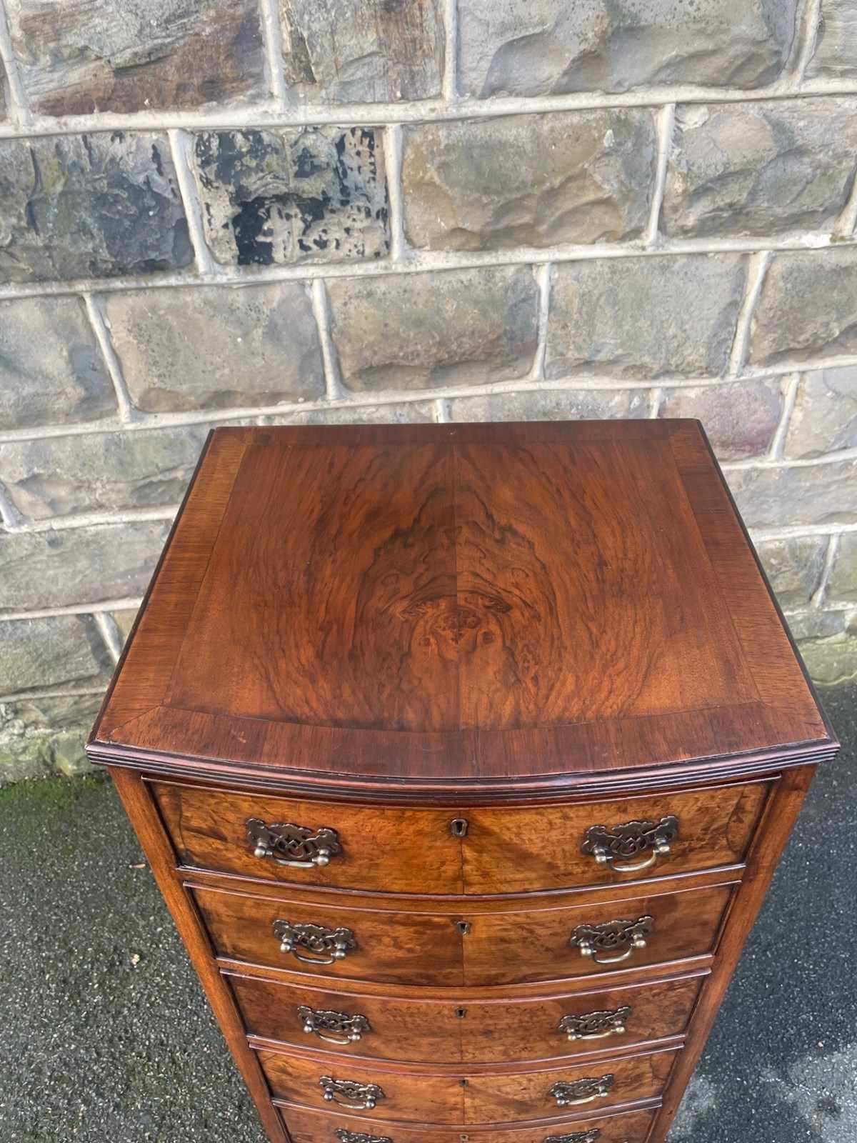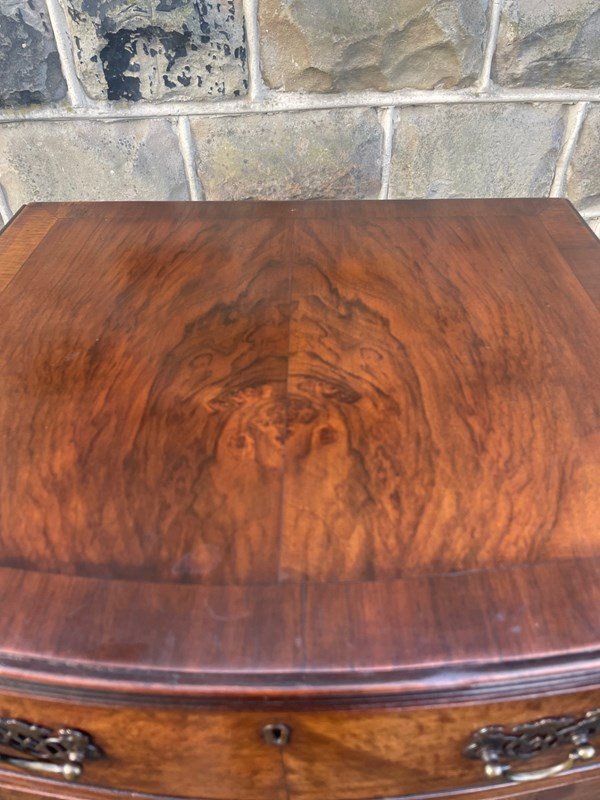 Nice size & proportions. Bow front , the top in burr walnut with a cross banded border. It has 6 burr walnut fronted draw with ornate brass drop handles, locks to all the draws with original key. Polished walnut sides standing on splayed bracket feet. Oak lined draws with dove tailed joints