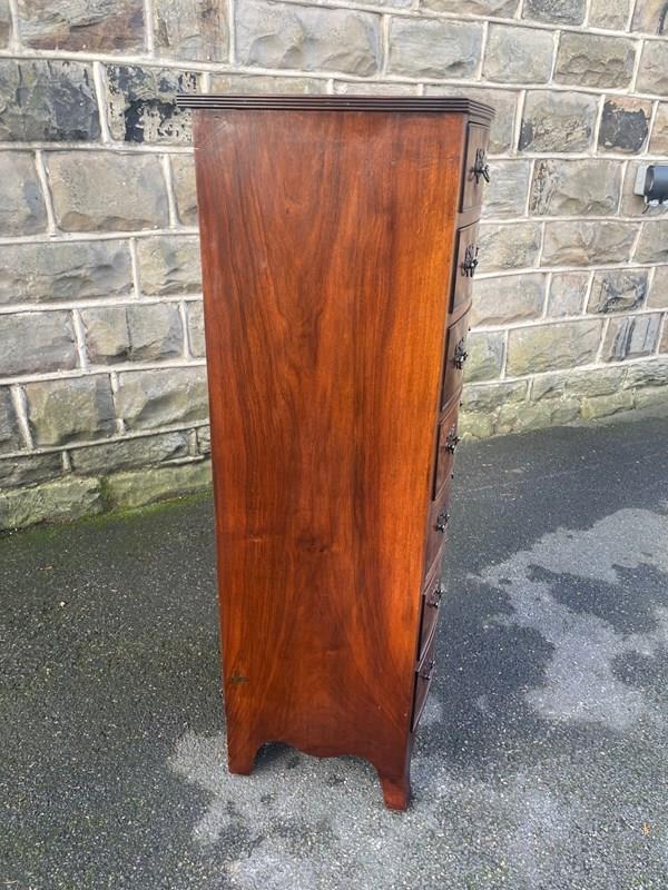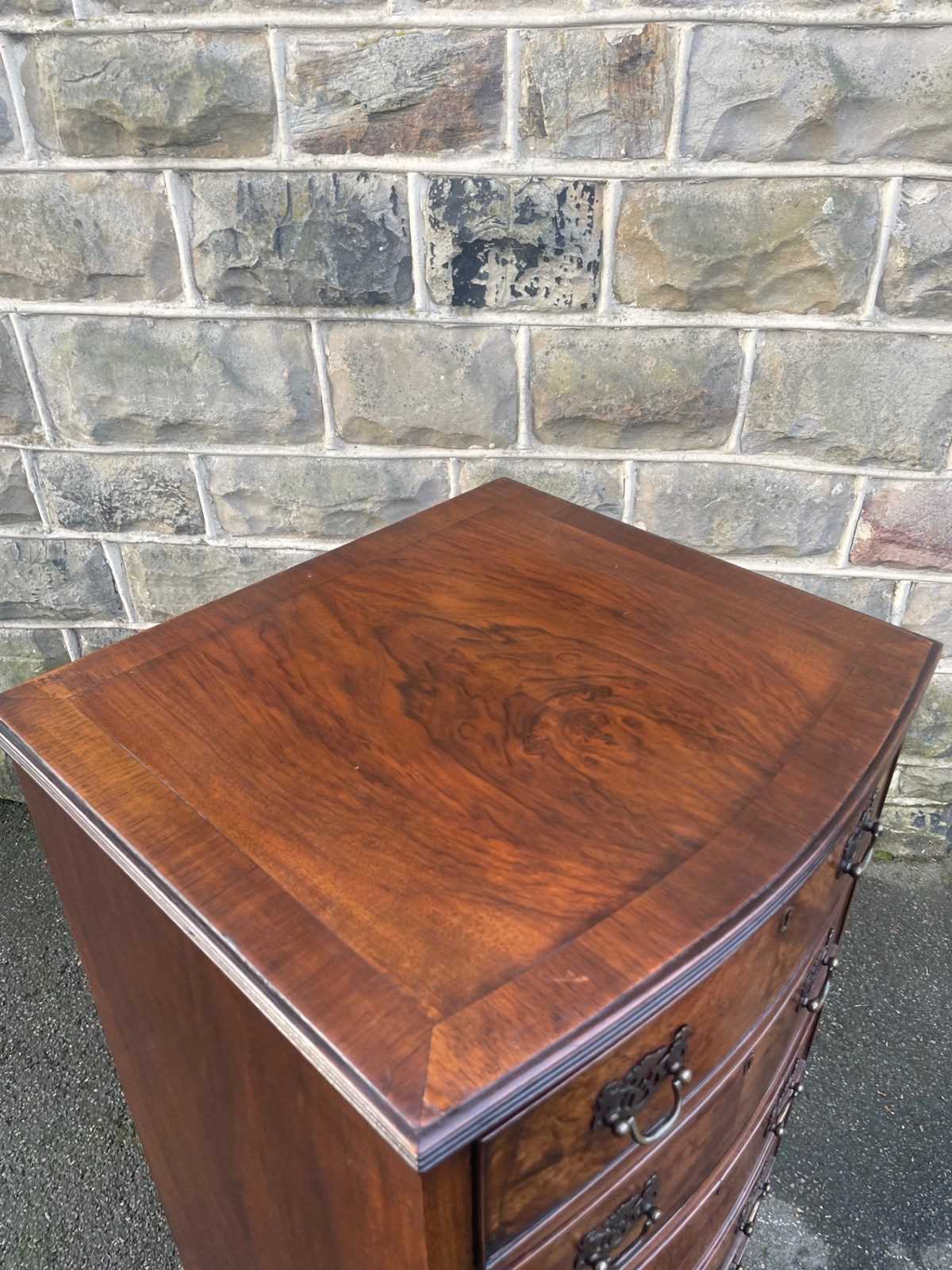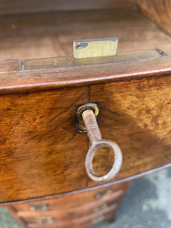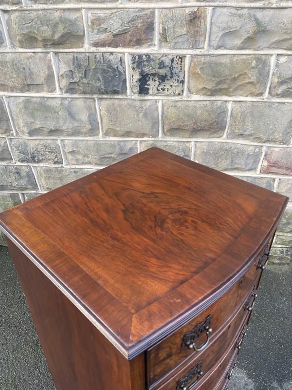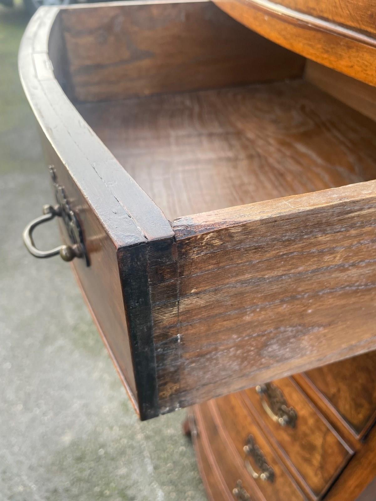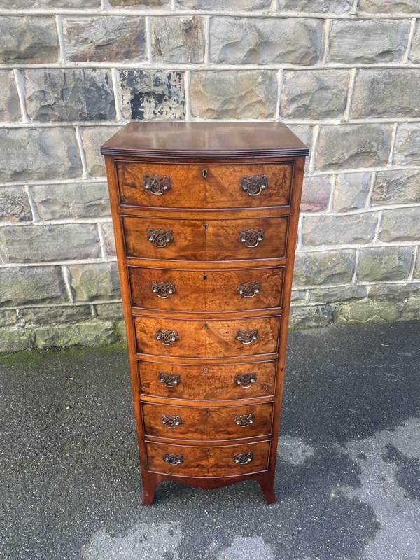 Nice size & proportions. Bow front , the top in burr walnut with a cross banded border. It has 6 burr walnut fronted draw with ornate brass drop handles, locks to all the draws with original key. Polished walnut sides standing on splayed bracket feet. Oak lined draws with dove tailed joints
