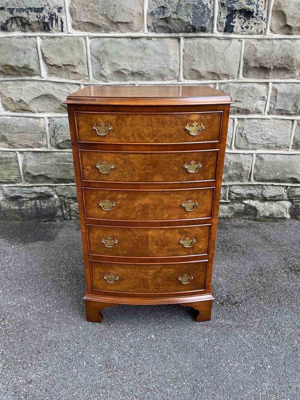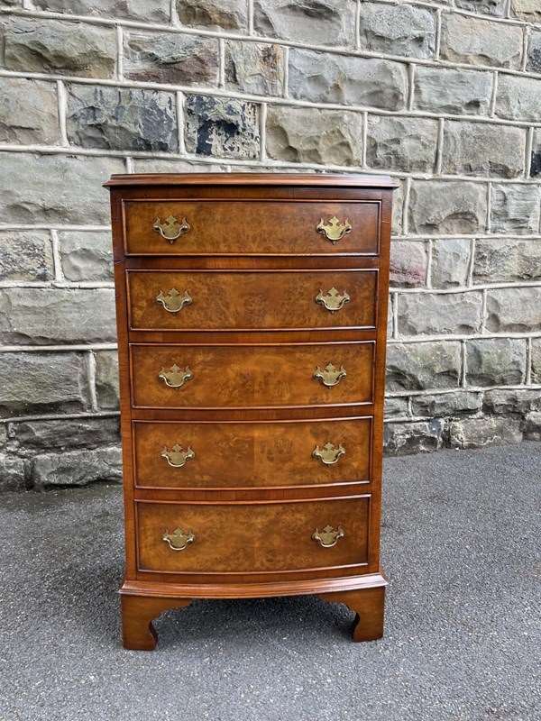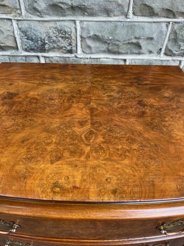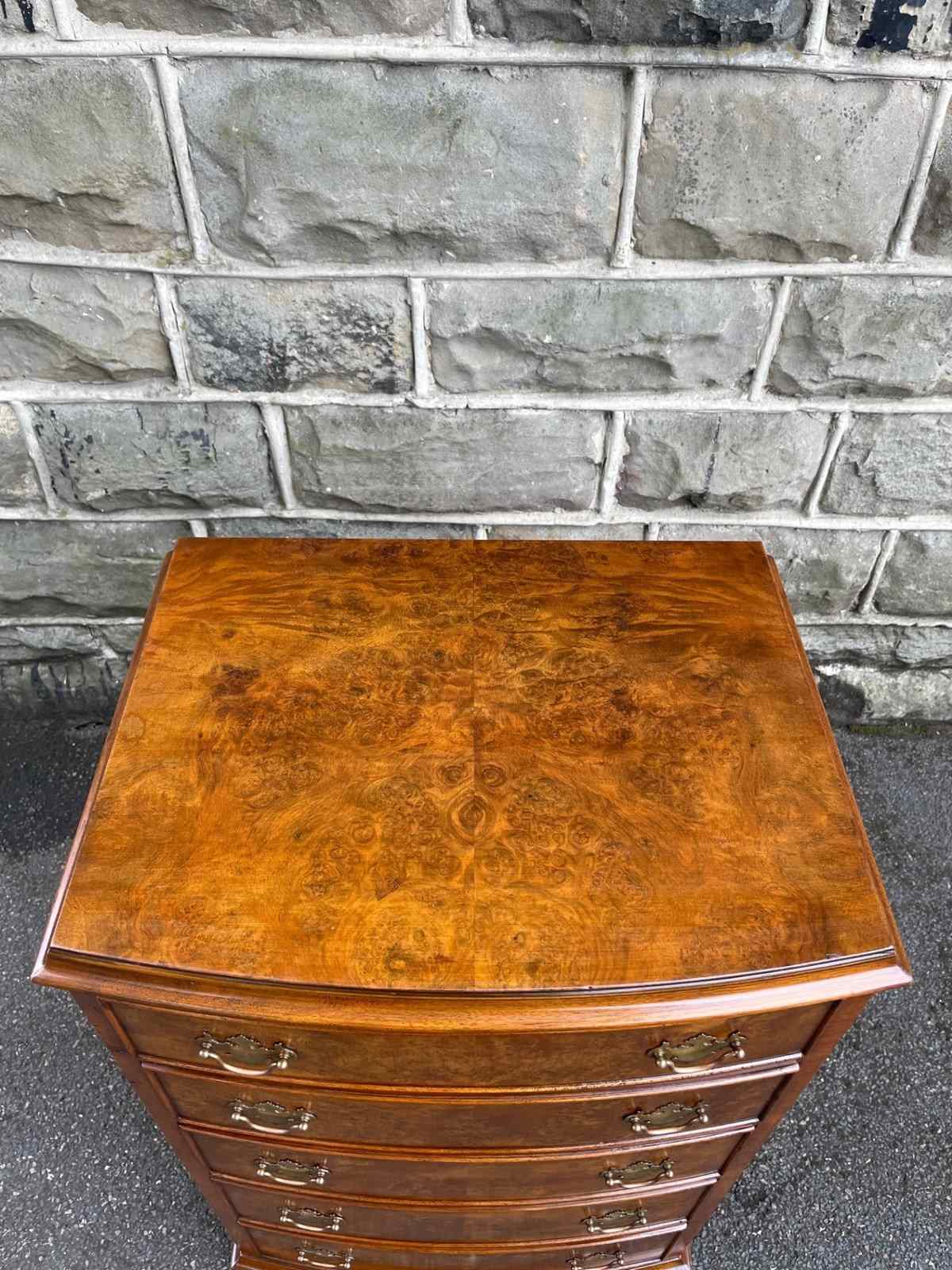 Of nice proportions. Dating from 1920. In burr walnut. Bow front with 5 which all have matching brass handles. Polished burr walnut draw fronts. Polished walnut sides. Standing on raised bracket feet