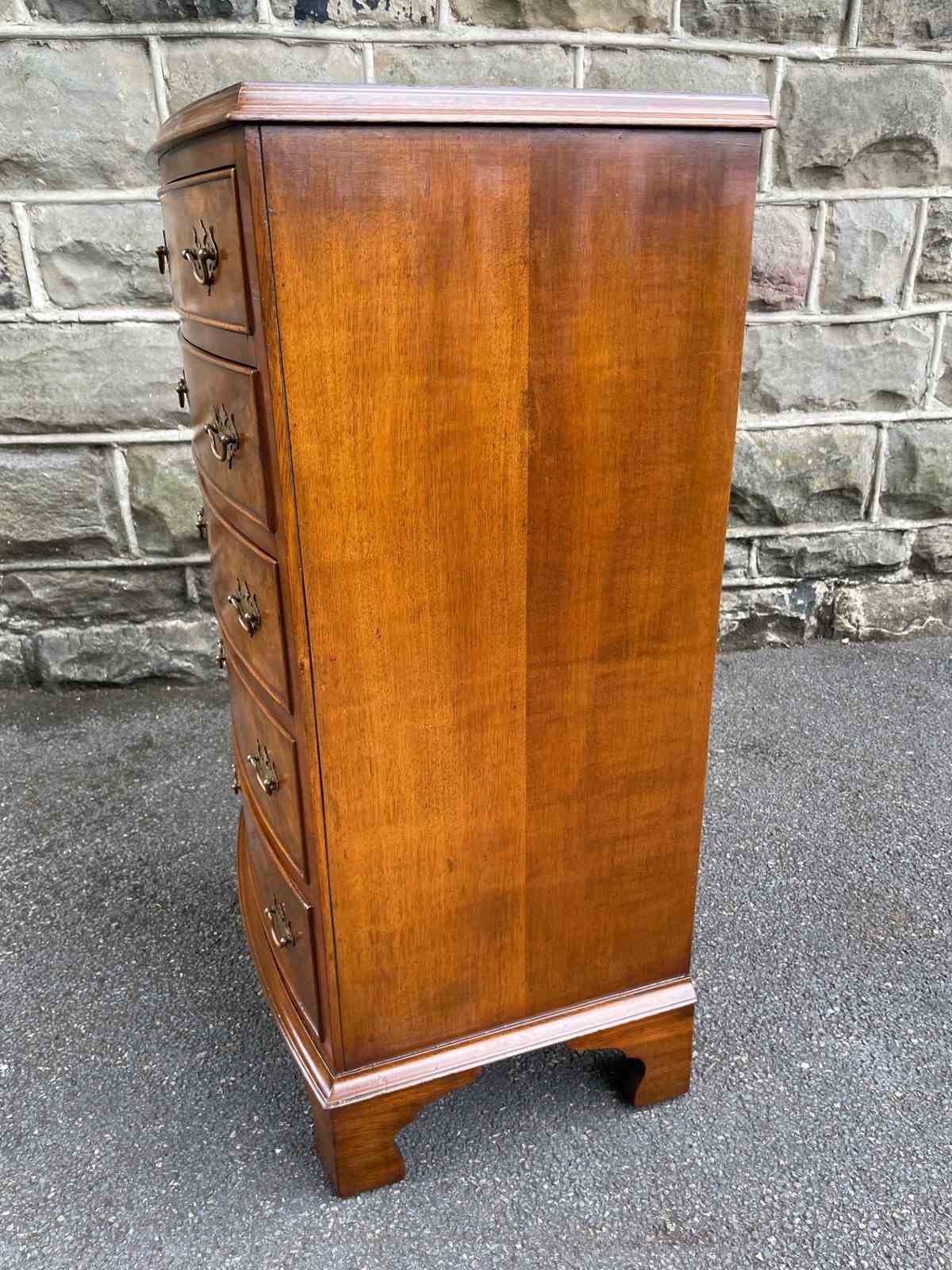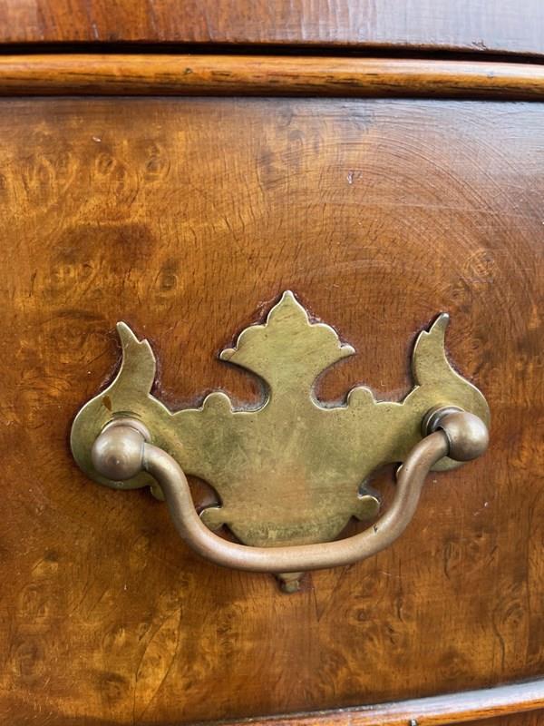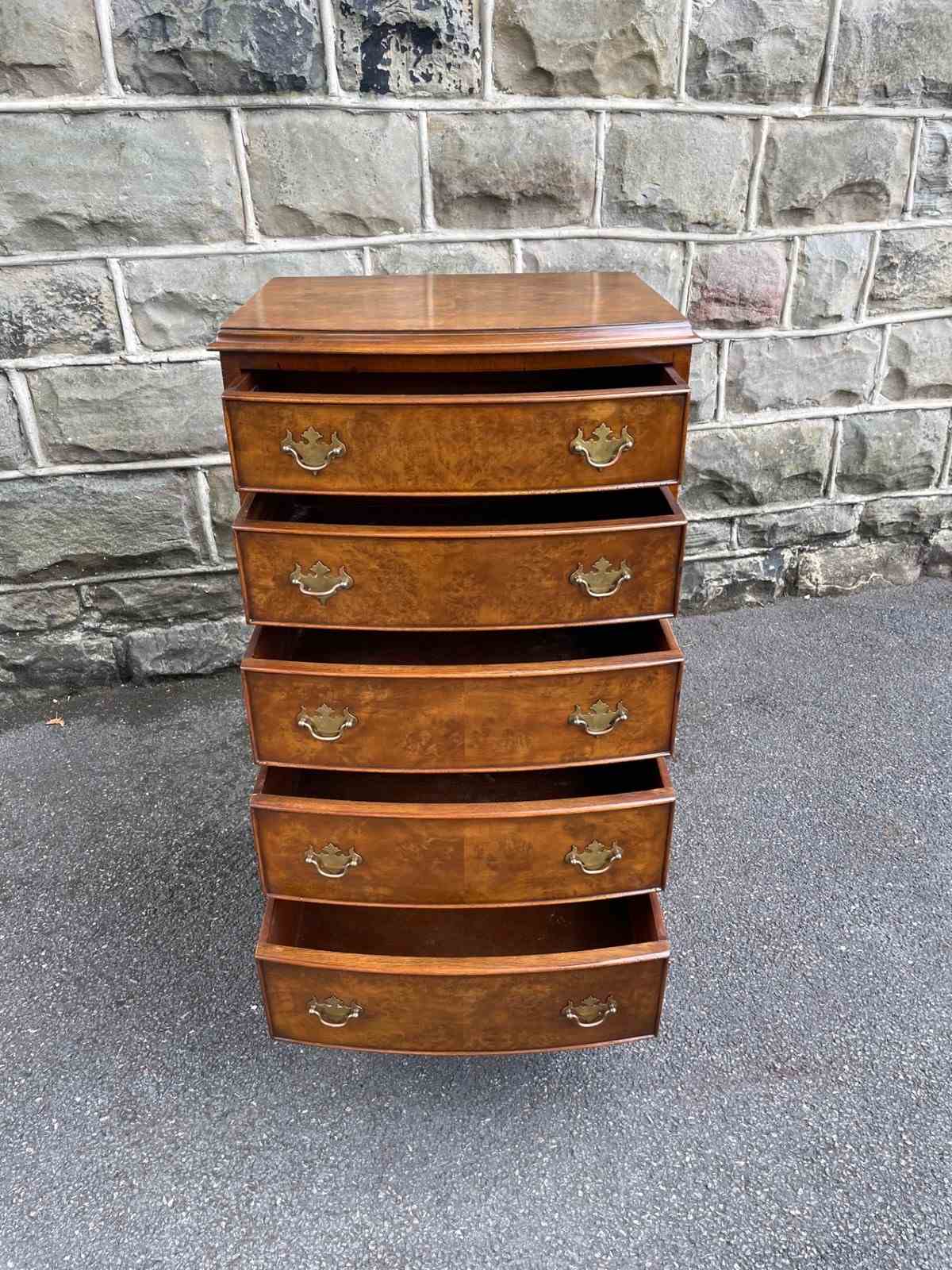 Of nice proportions. Dating from 1920. In burr walnut. Bow front with 5 which all have matching brass handles. Polished burr walnut draw fronts. Polished walnut sides. Standing on raised bracket feet