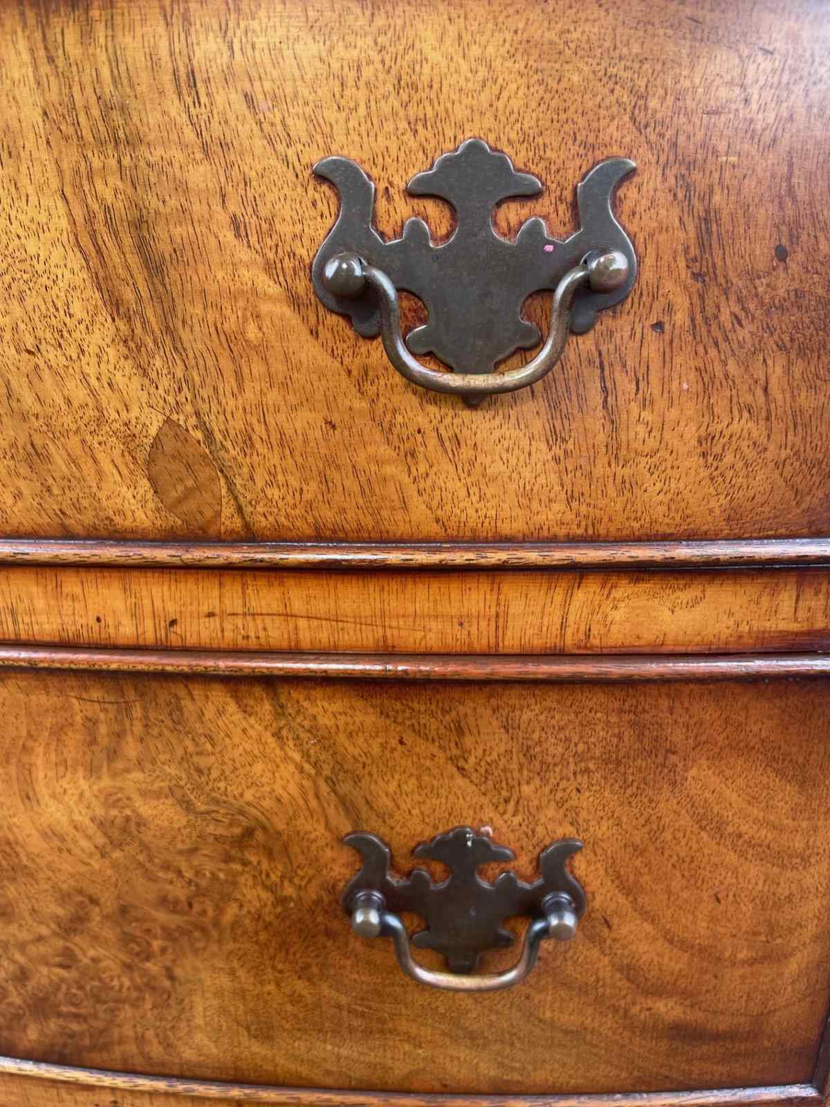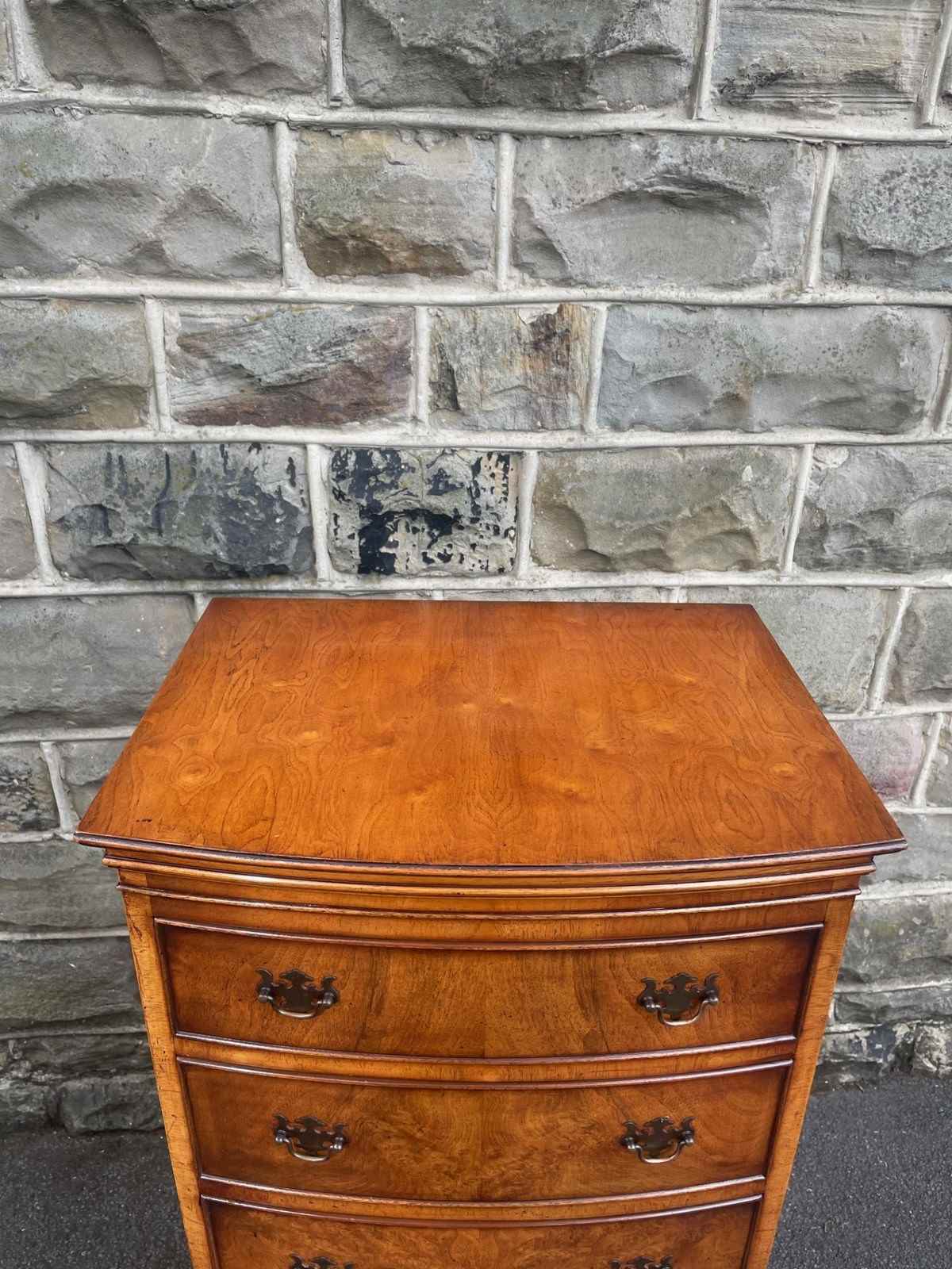 Of nice proportions. Dating from 1920. In burr walnut. Bow front with 3 smaller drawers at the top & 3 larger drawers below. All the drawers have matching brass handles. Standing on raised bracket feet. Burr walnut draw fronts. Polished walnut sides.