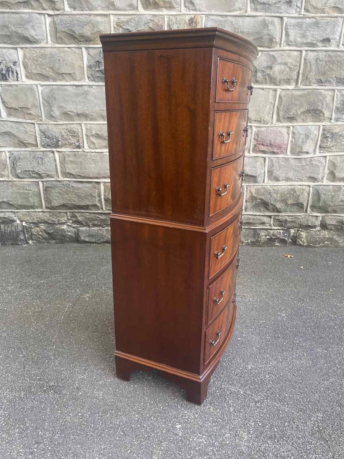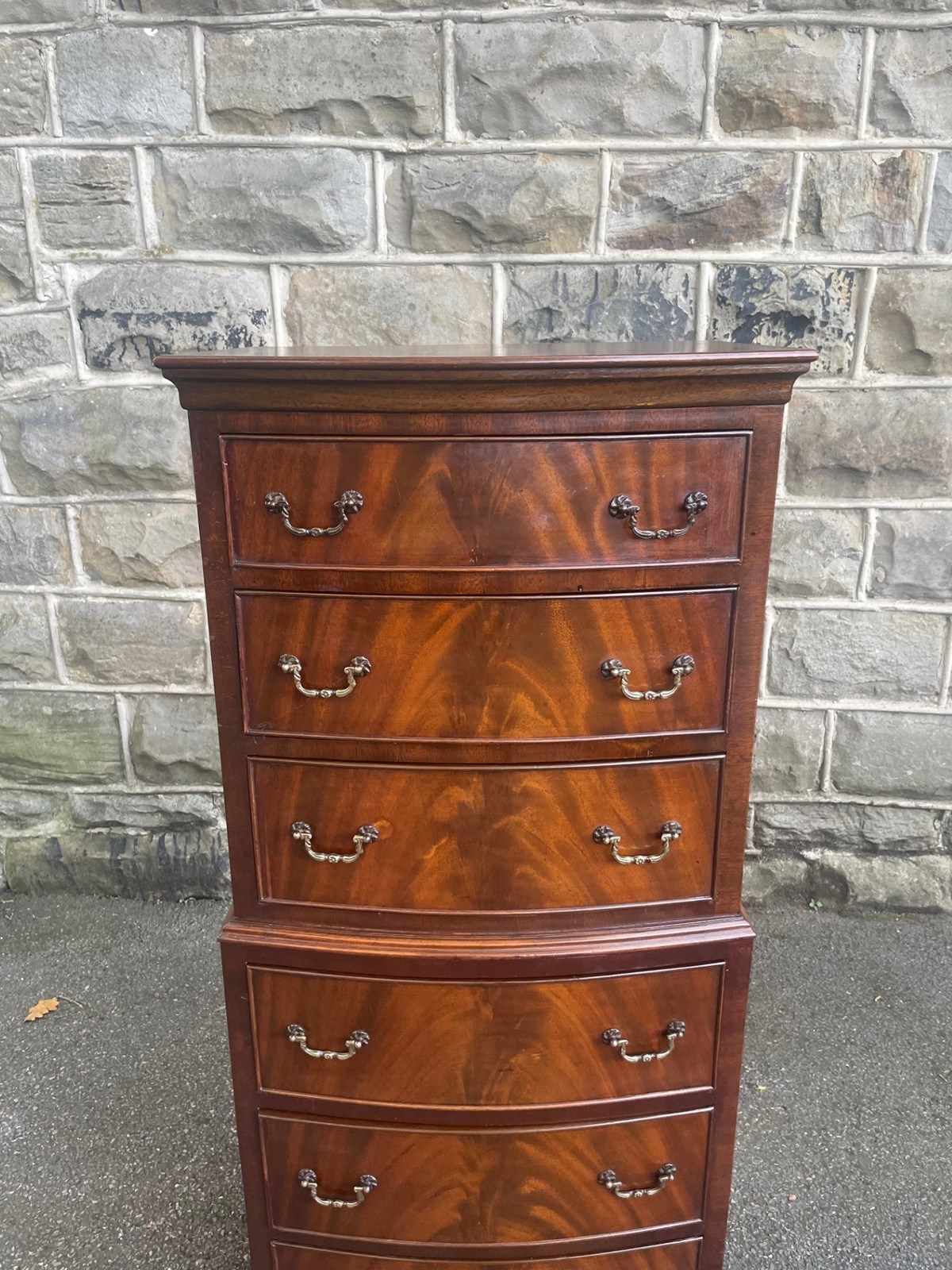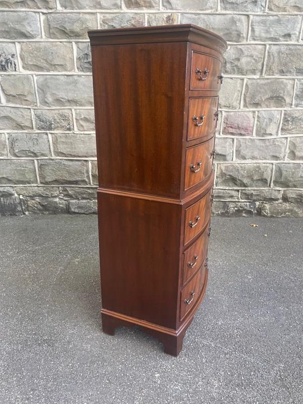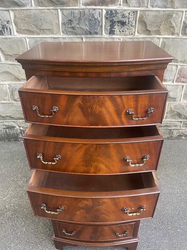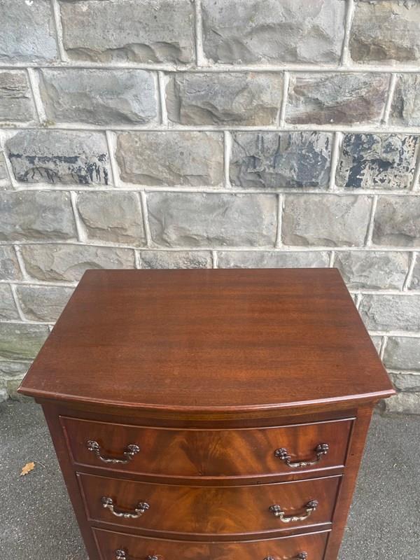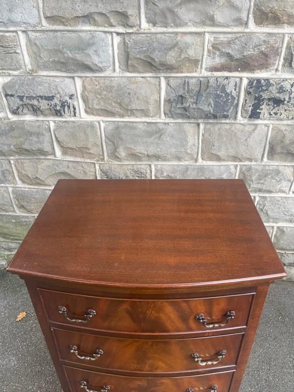 Of nice proportions. Dating from 1920. In mahogany, bow front with 3 smaller drawers at the top & 3 larger drawers below. All the drawers have matching brass handles. Standing on raised bracket feet. Mahogany draw fronts. Polished mahogany sides.