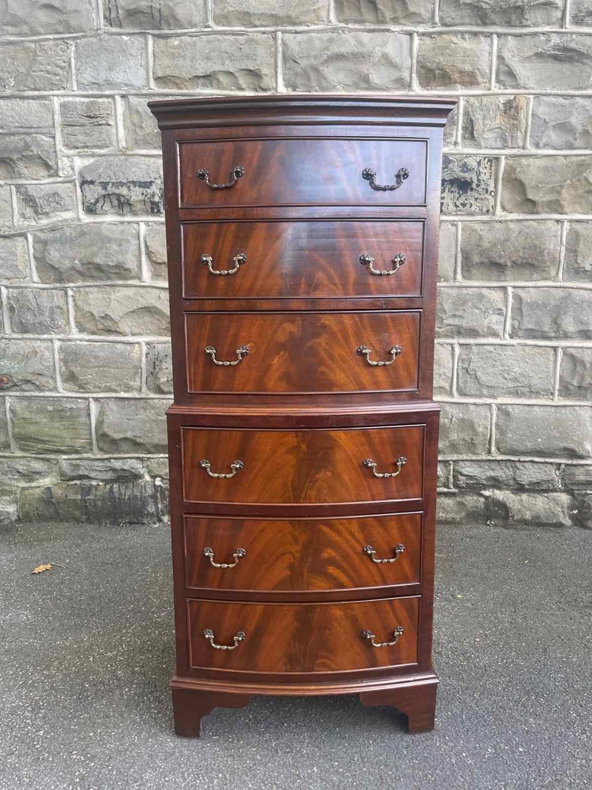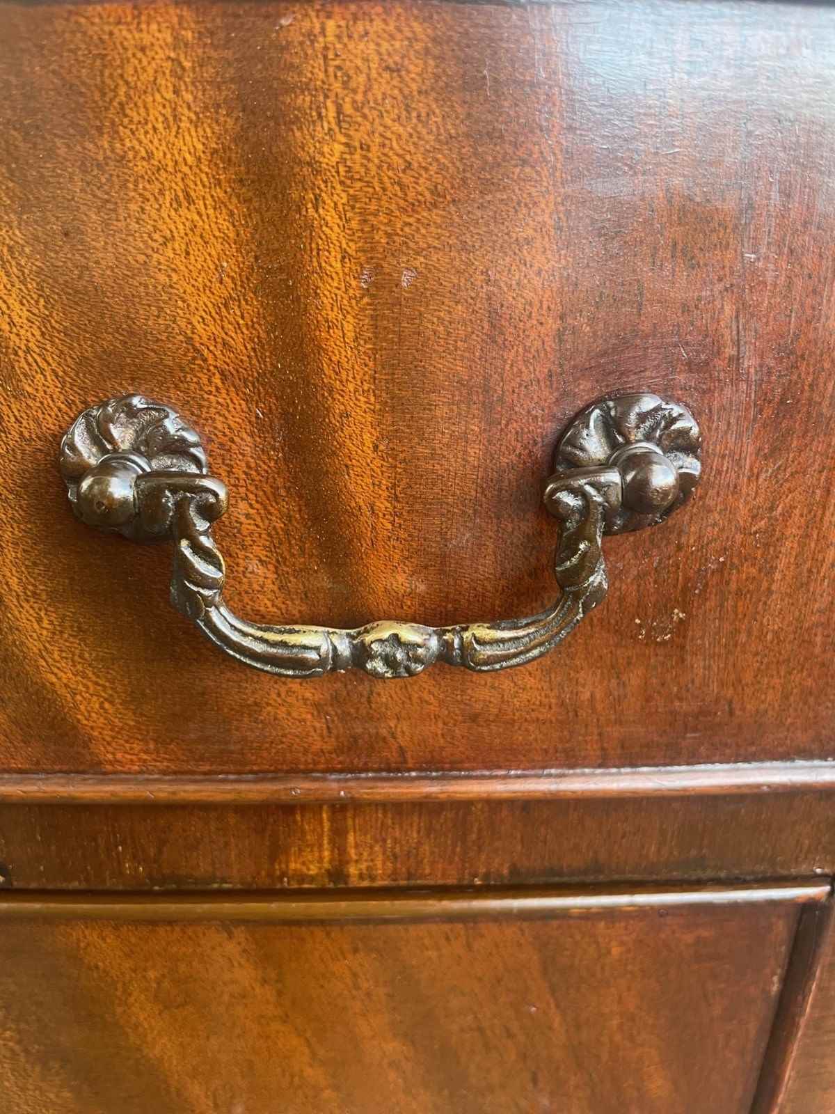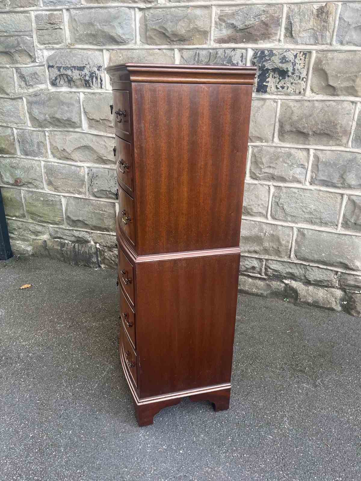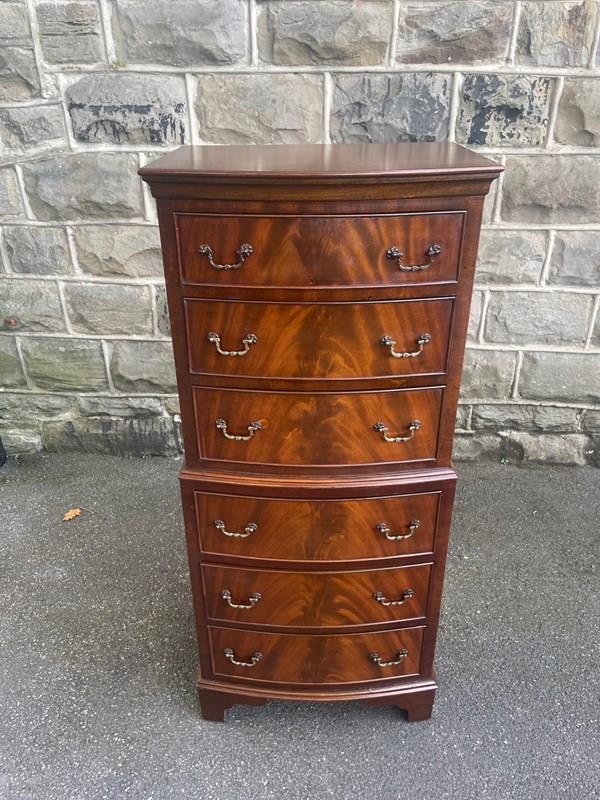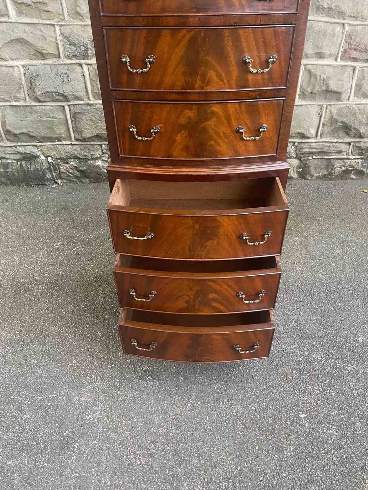 Of nice proportions. Dating from 1920. In mahogany, bow front with 3 smaller drawers at the top & 3 larger drawers below. All the drawers have matching brass handles. Standing on raised bracket feet. Mahogany draw fronts. Polished mahogany sides.