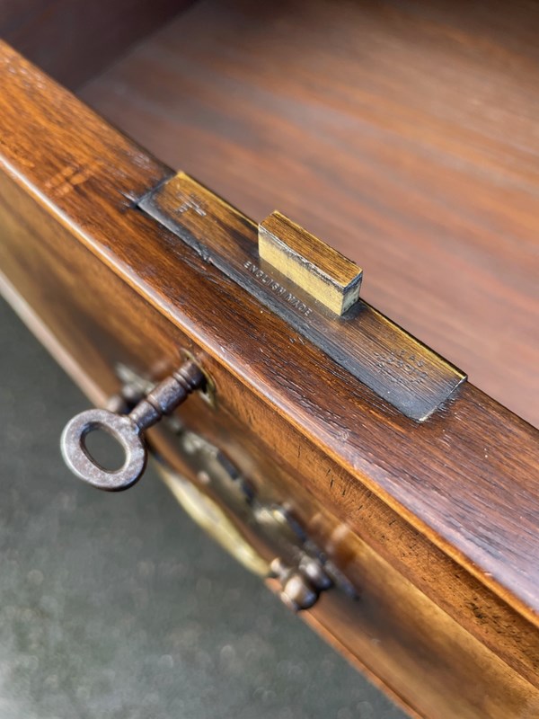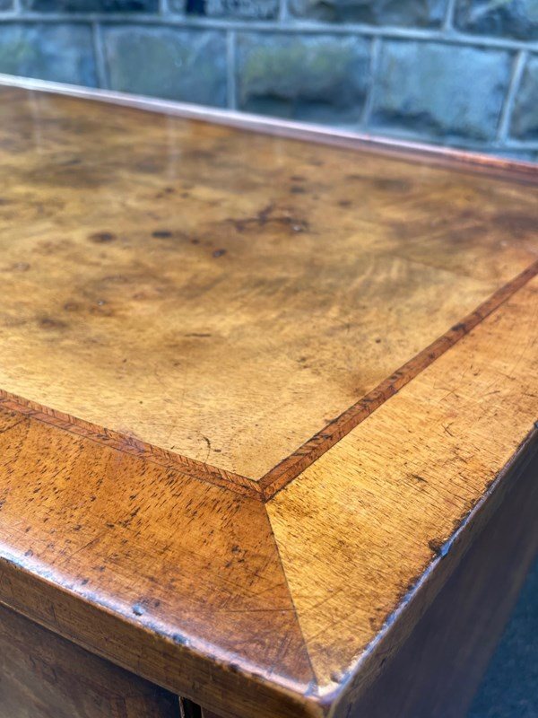 Unusual to be in burr walnut, the top with a cross banded border, 2 smaller over 3 larger graduated draws all with brass handles & brass locks. Has original key. Polished walnut sides standing upon splayed bracket feet.