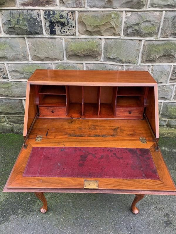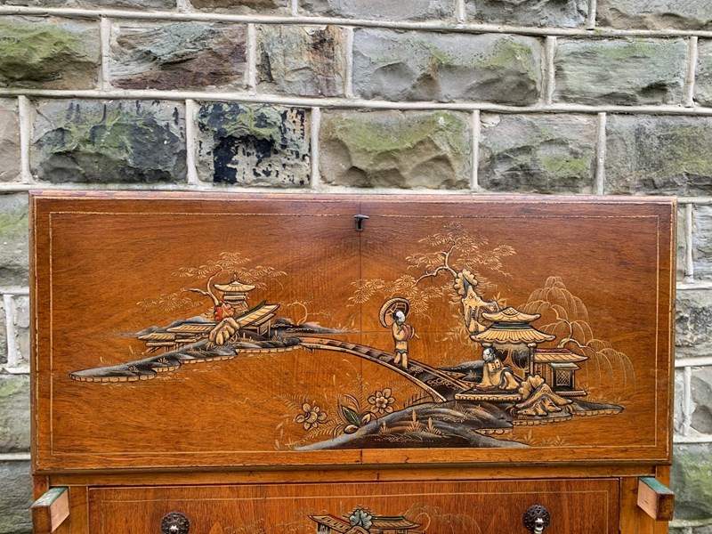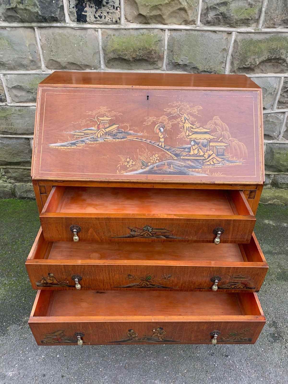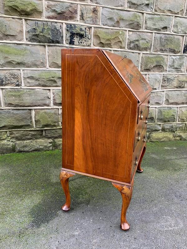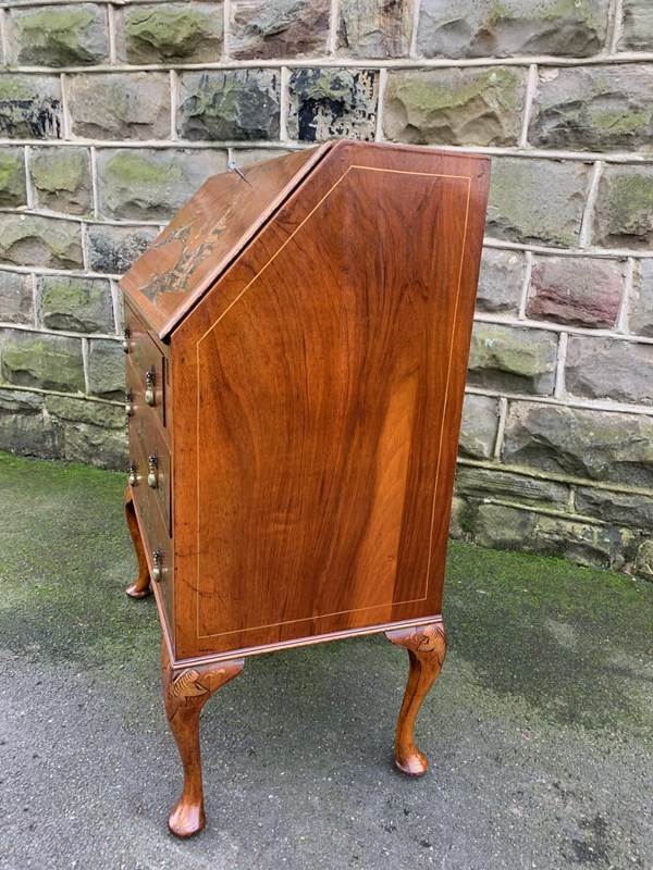 Offered for sale is this walnut bureau with chinoiserie decoration. The fall flap with figured walnut veneers & chinoiserie decoration, lock & key. Inside is has 2 draws and a series of pigeon holes. Loafers that slide in & out to support the top which open and close with the flap. 3 graduated draws with figured walnut veneers, brass handles & chinoiserie decoration. Walnut sides & solid back. Standing on cabriole legs.