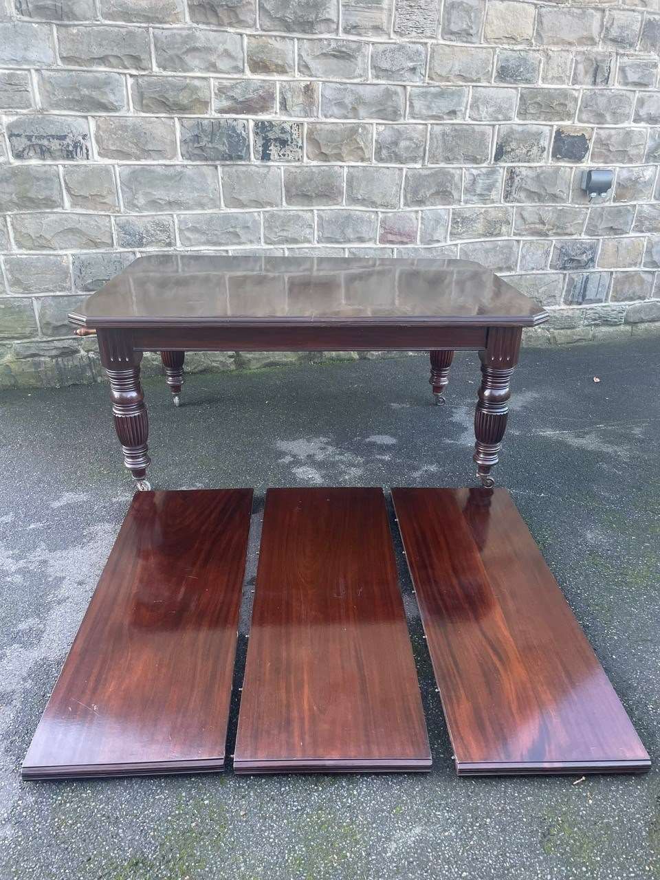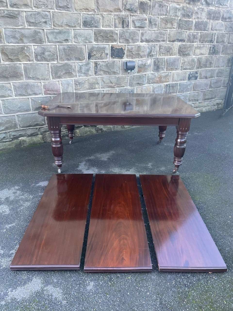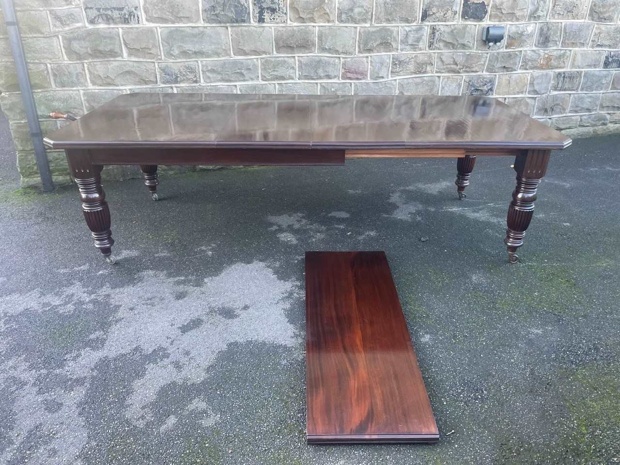 In solid walnut it has a wind out extending mechanism with 3 original insertion leaves. Standing on good thick turned walnut legs with brass & ceramic castors. Winds outs smoothly and the top is a lovely colour. The table can be used with just 1, 2 or all 3 leaves in.