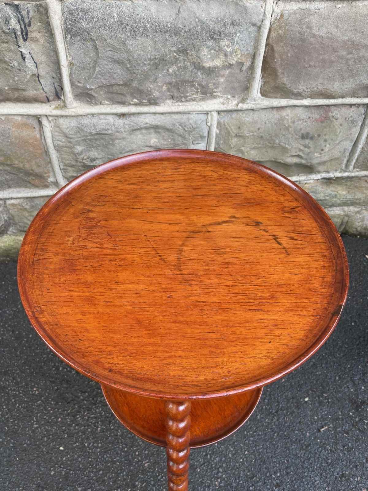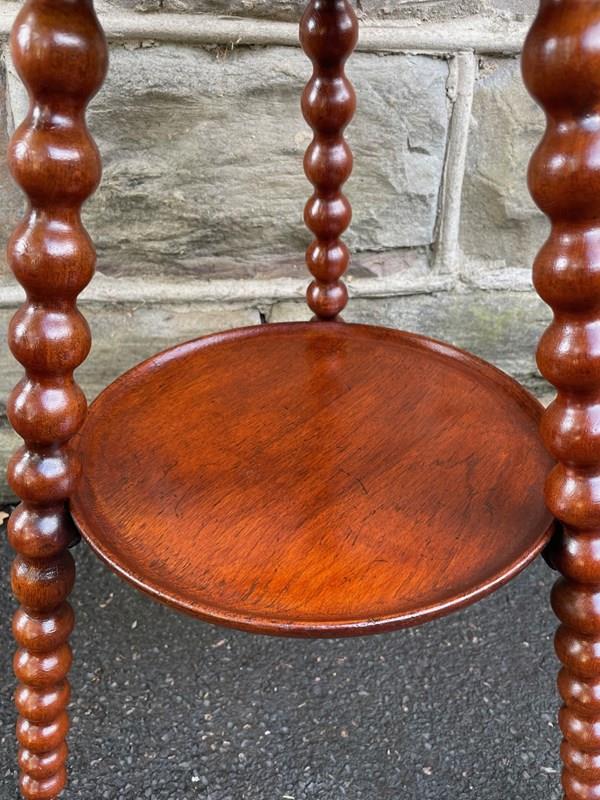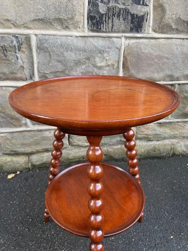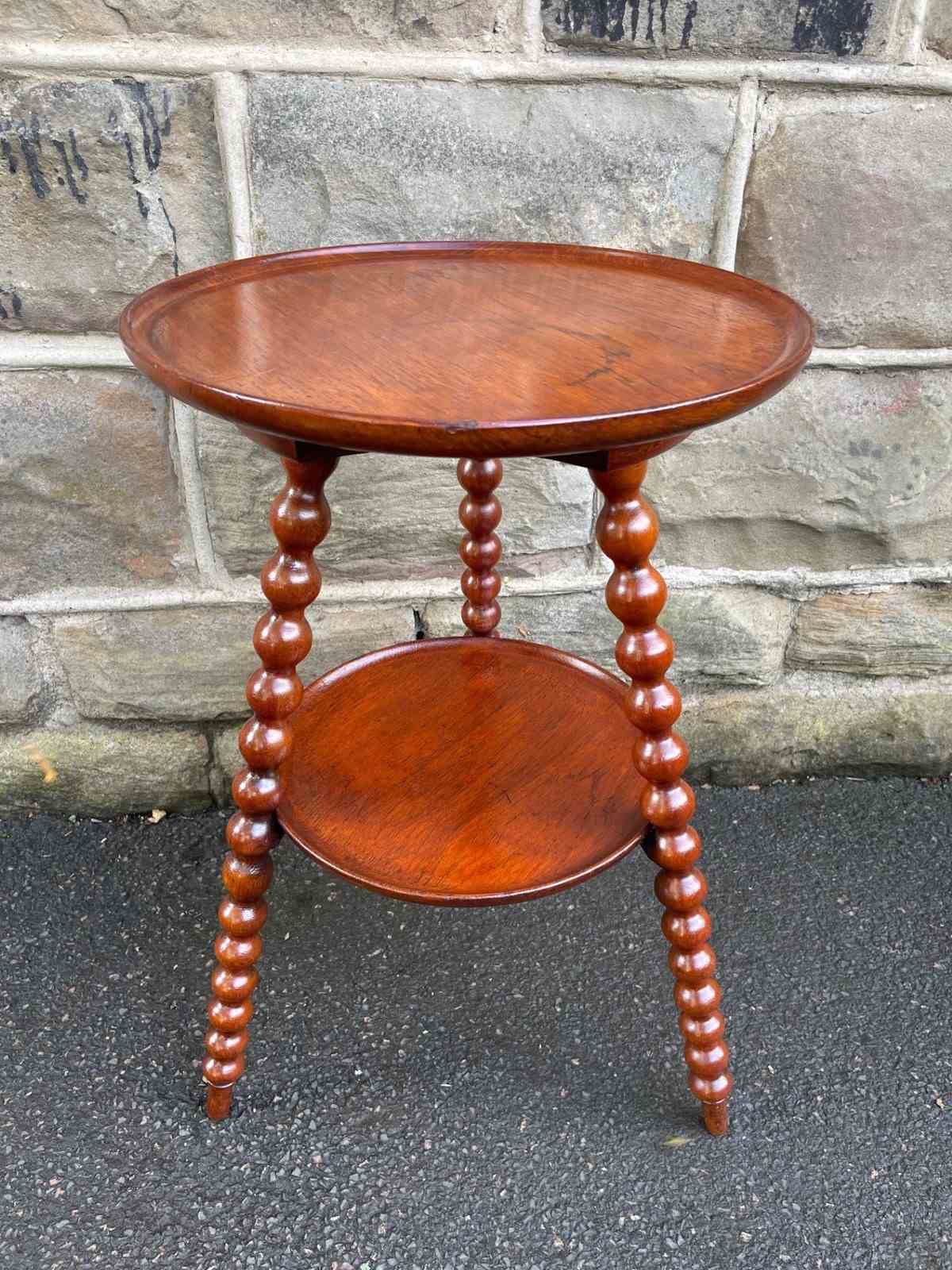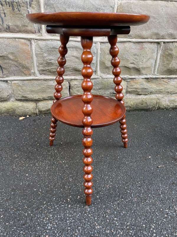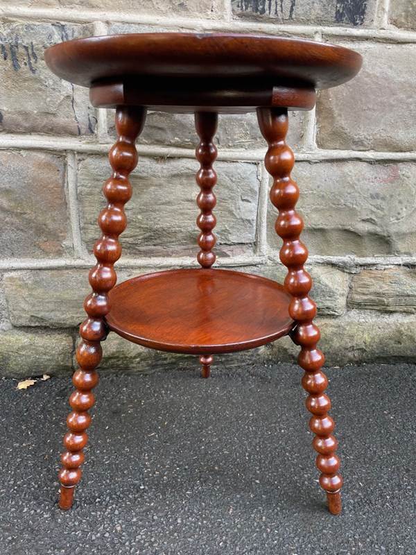 Round walnut dished top upon 3 bobbin turned walnut legs with walnut dished undershelf.