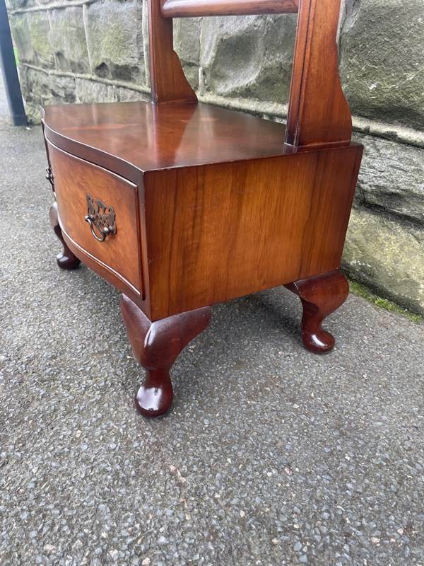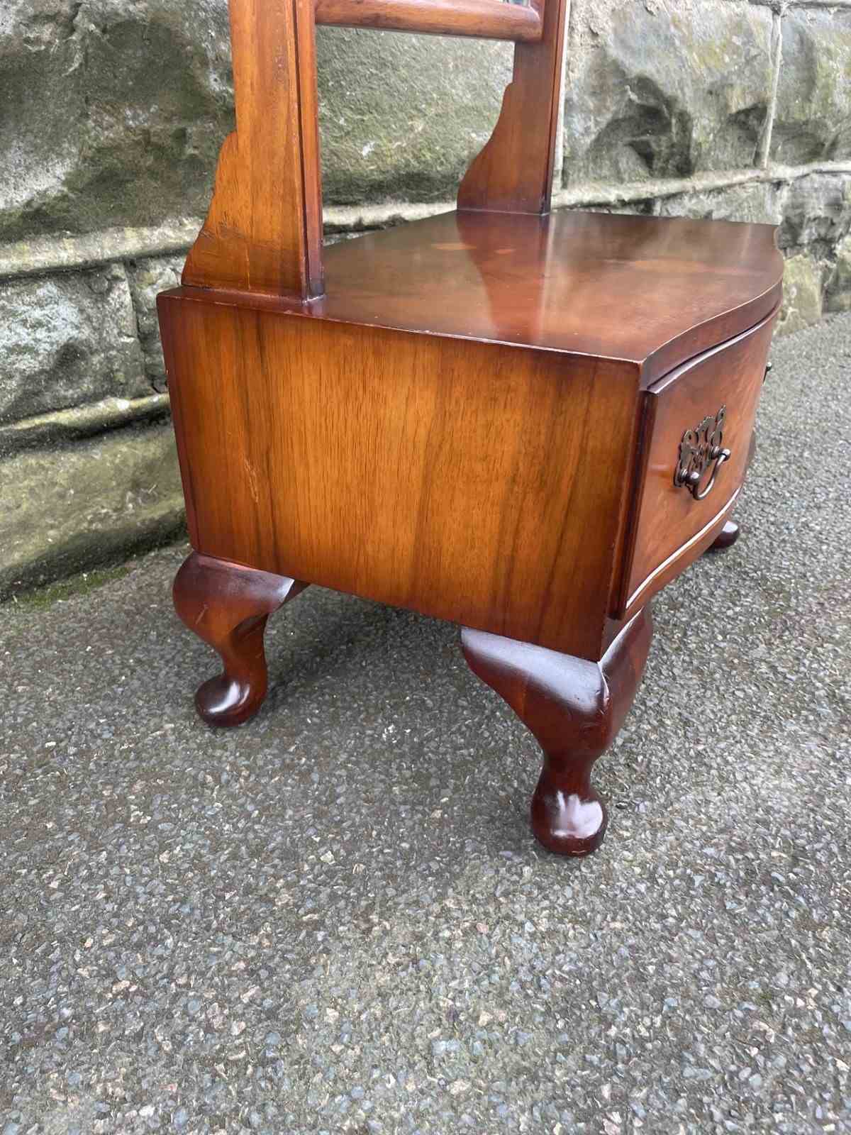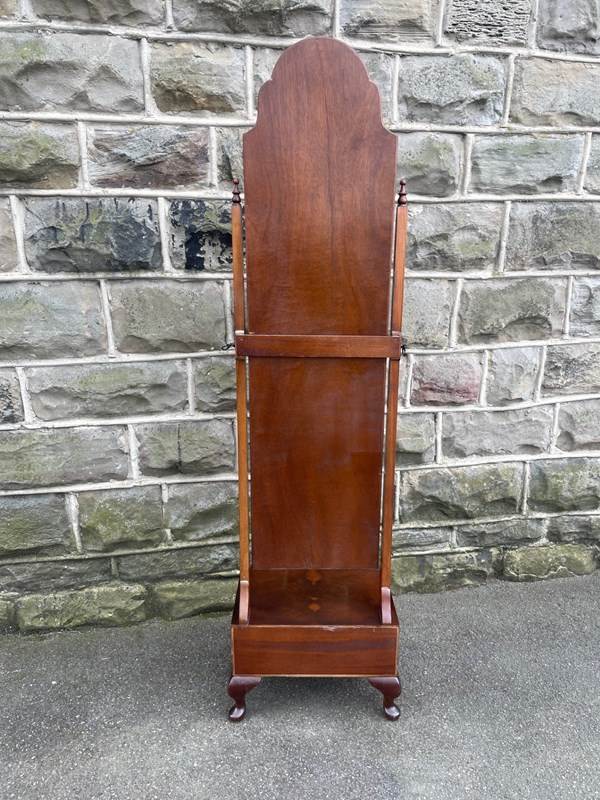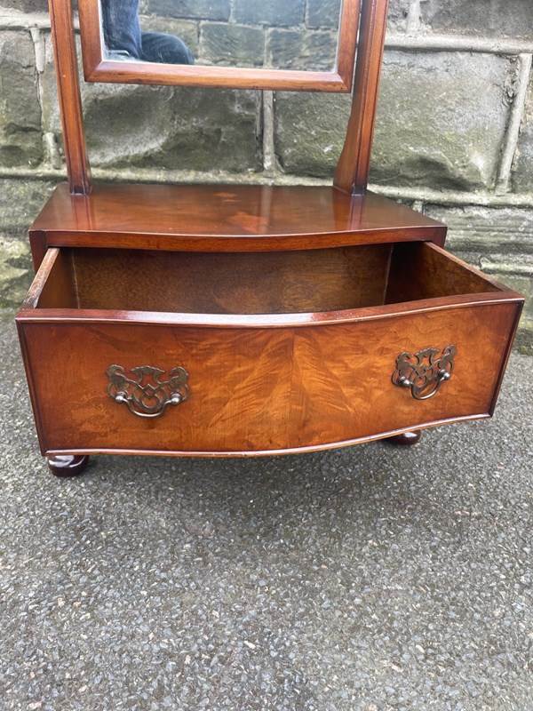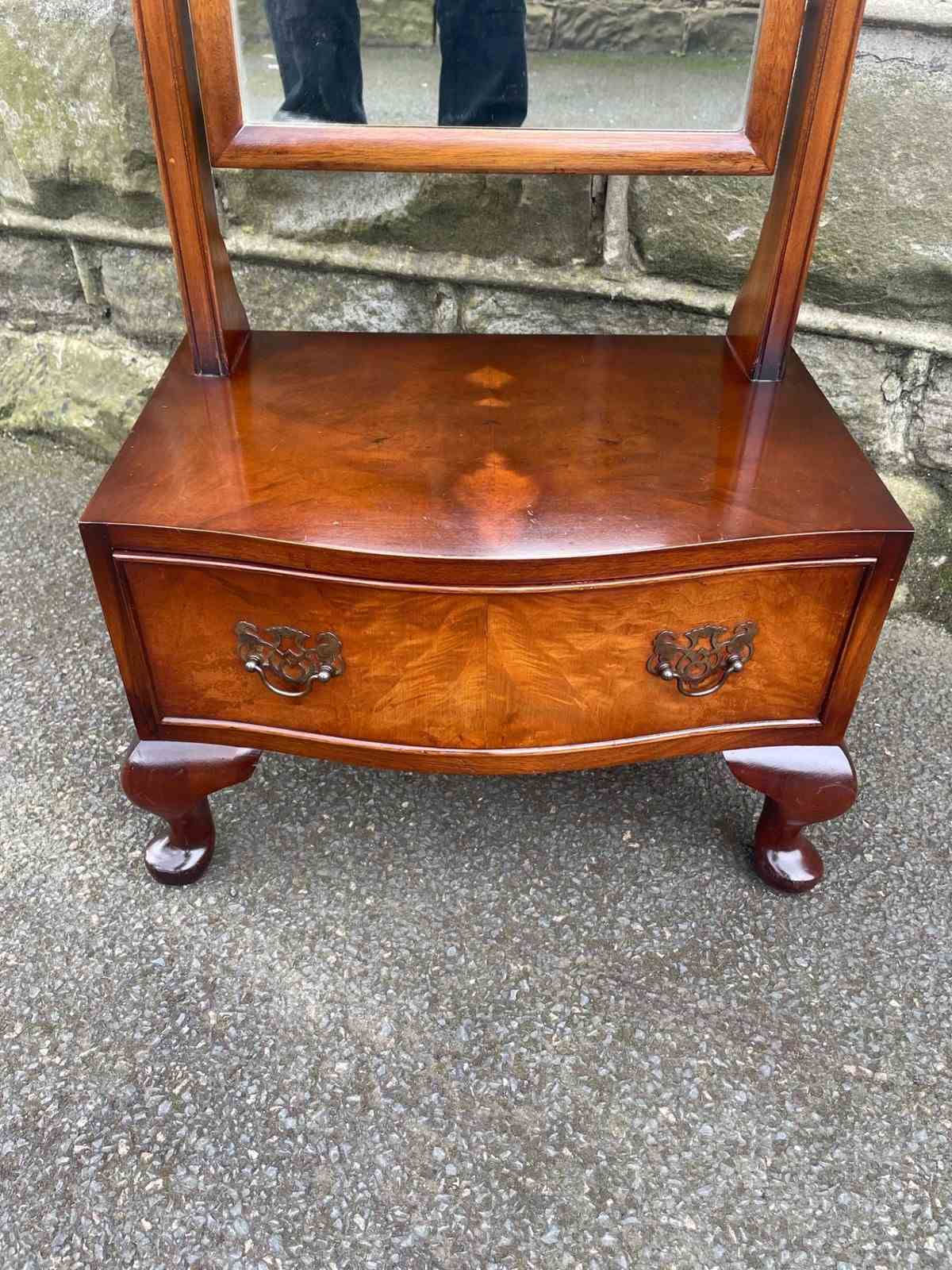 Walnut frame with arched queen anne style top, original mirror plate, walnut uprights with turned finials, brass screw in handles to support the mirror. Walnut base with pull out draw with ornate brass drop handles. Standing on walnut shaped small cabriole feet. The angle of the mirror can be adjusted by pushing backwards or pulling forwards.