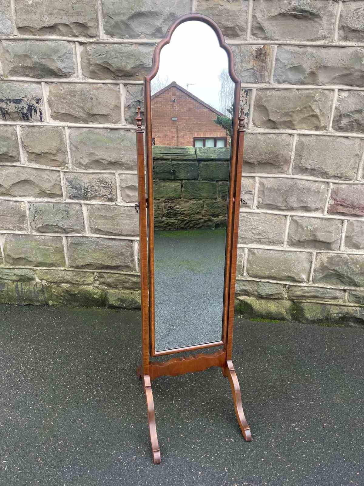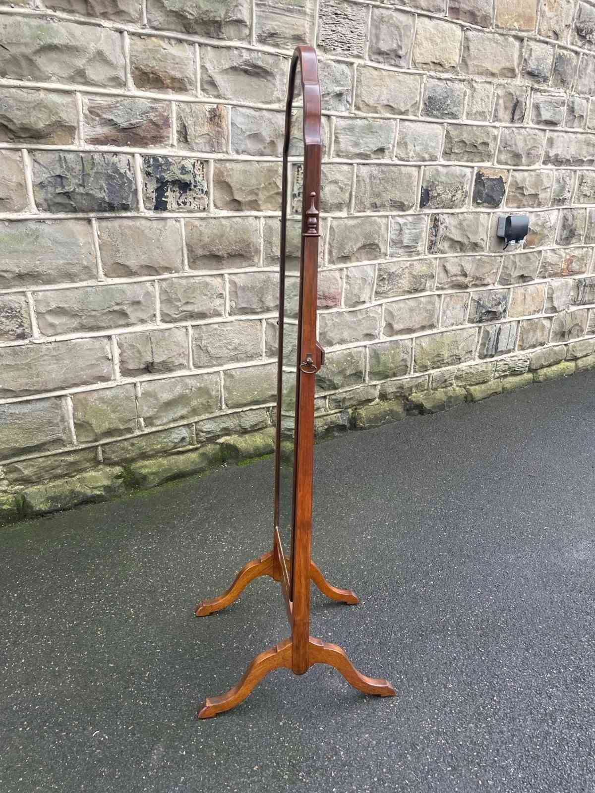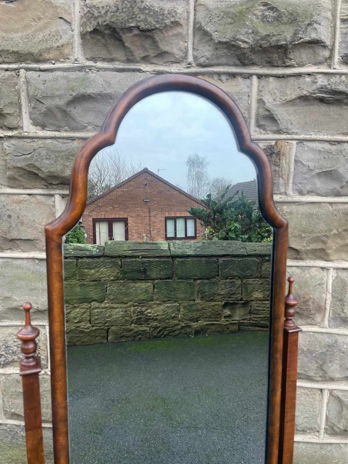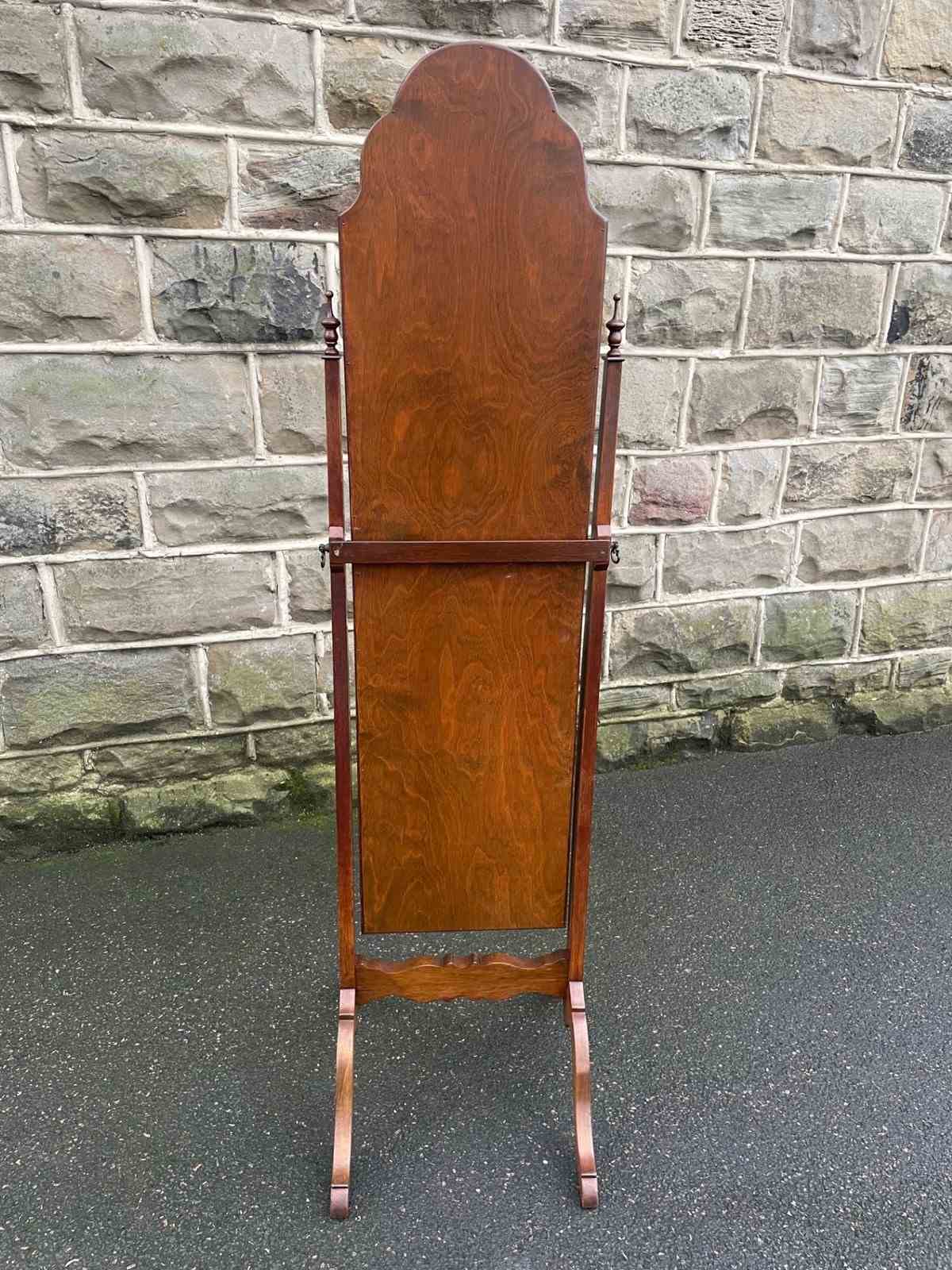 Offered for sale is this nice quality antique cheval dressing mirror. Walnut frame with arched queen anne style top, walnut uprights with turned finials, brass screw in handles to support the mirror. Standing on shaped walnut legs with a stretchers. The angle of the mirror can be adjusted by pushing backwards or pulling forwards.