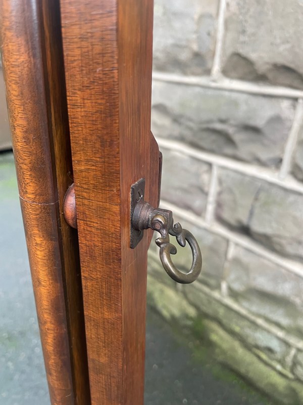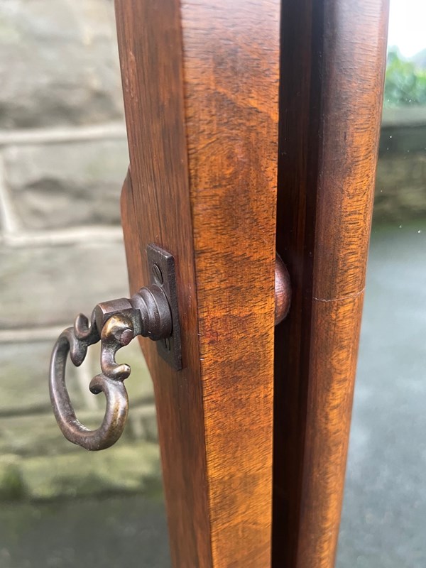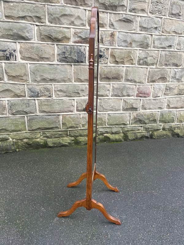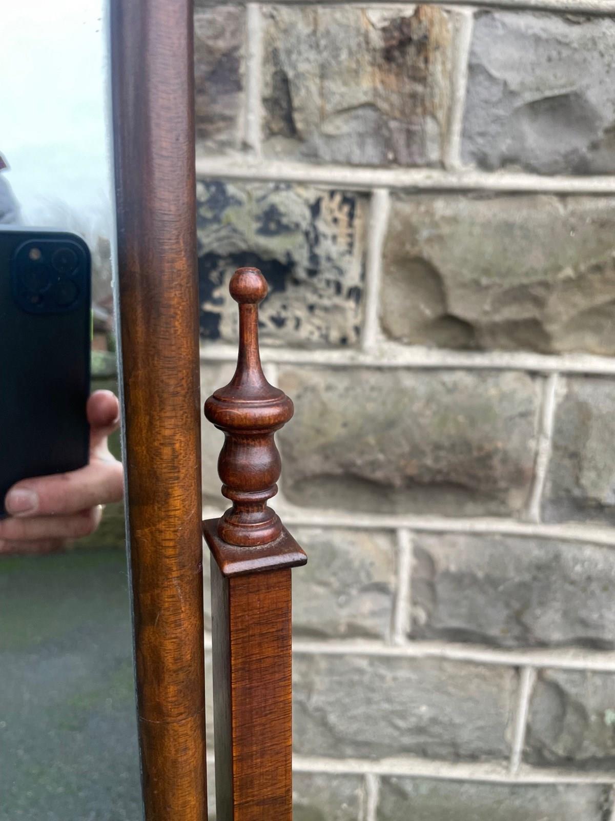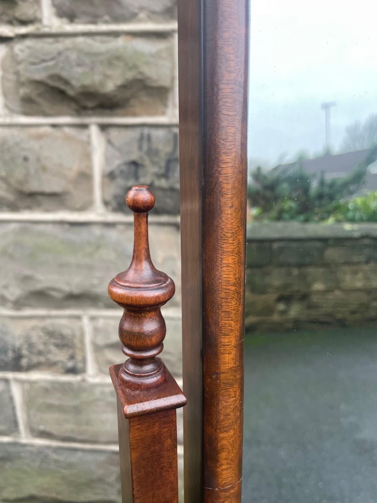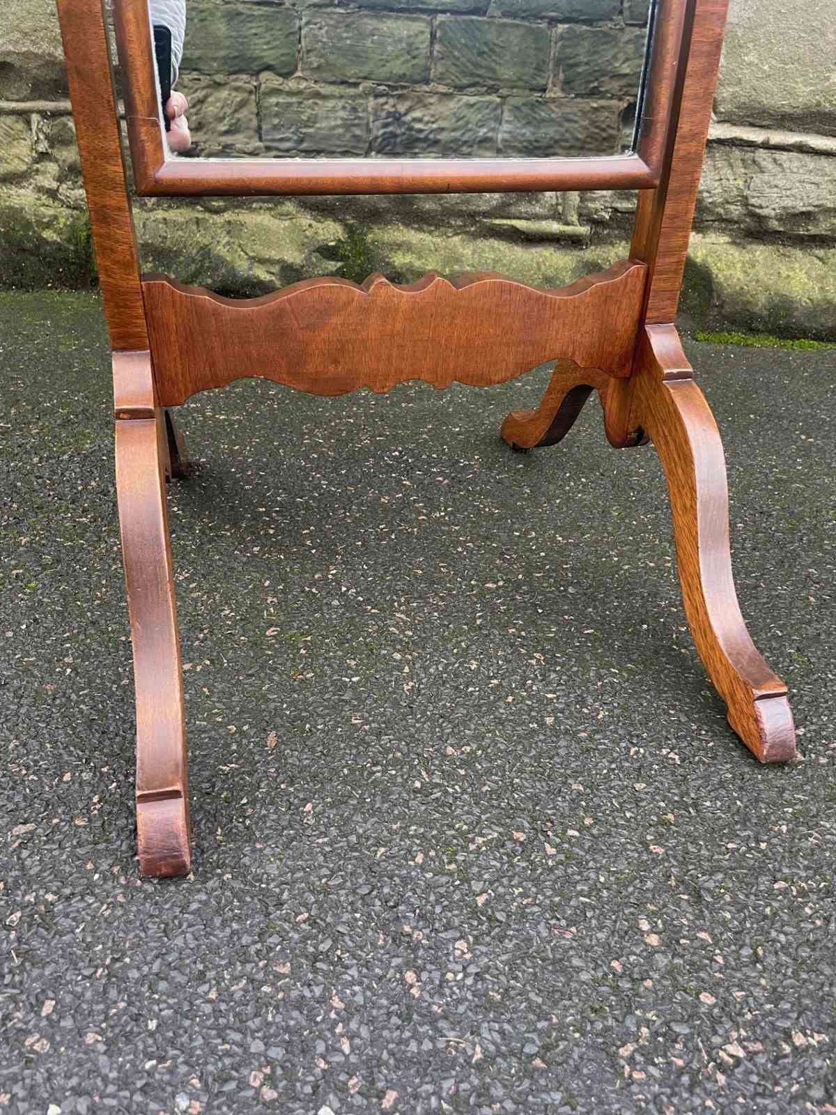 Offered for sale is this nice quality antique cheval dressing mirror. Walnut frame with arched queen anne style top, walnut uprights with turned finials, brass screw in handles to support the mirror. Standing on shaped walnut legs with a stretchers. The angle of the mirror can be adjusted by pushing backwards or pulling forwards.