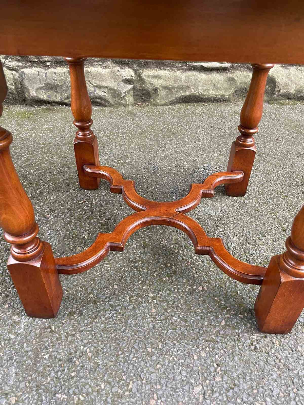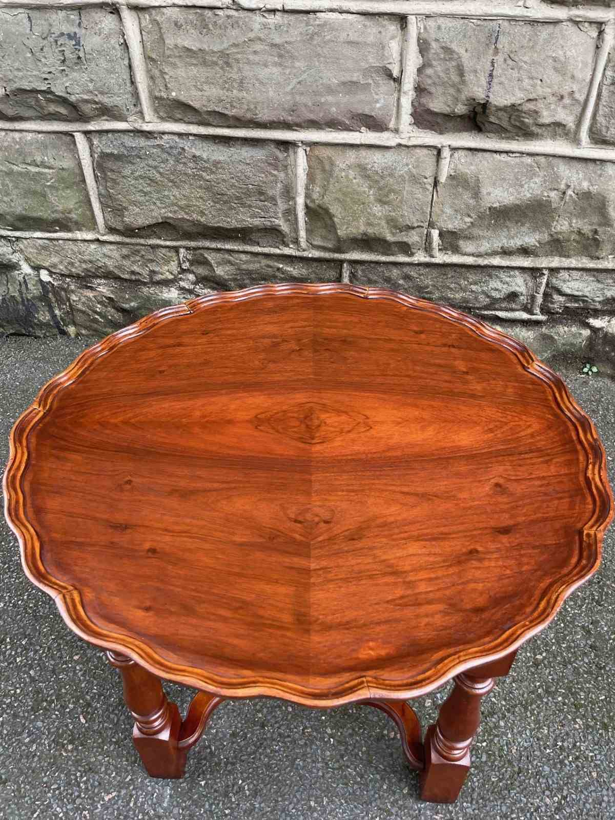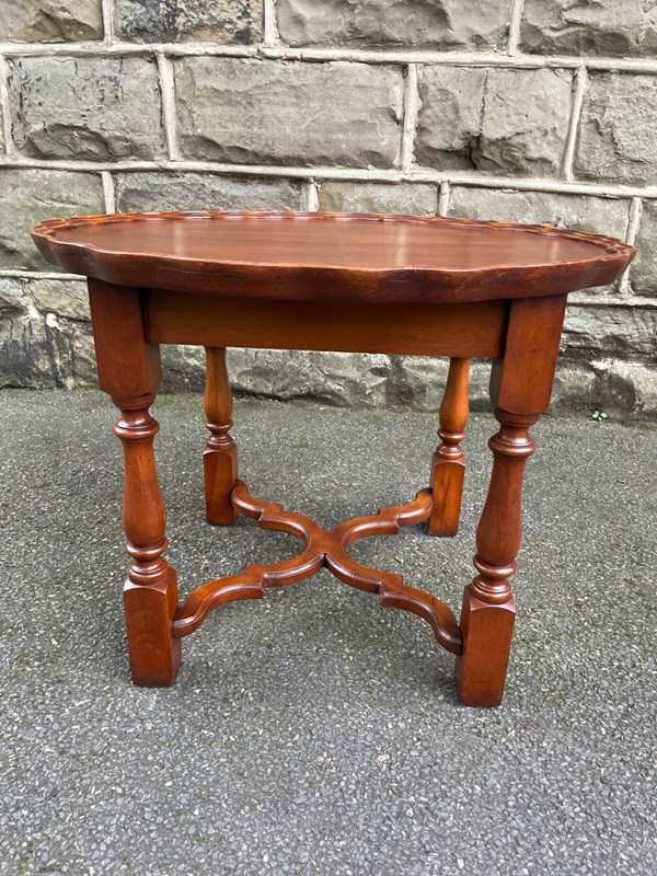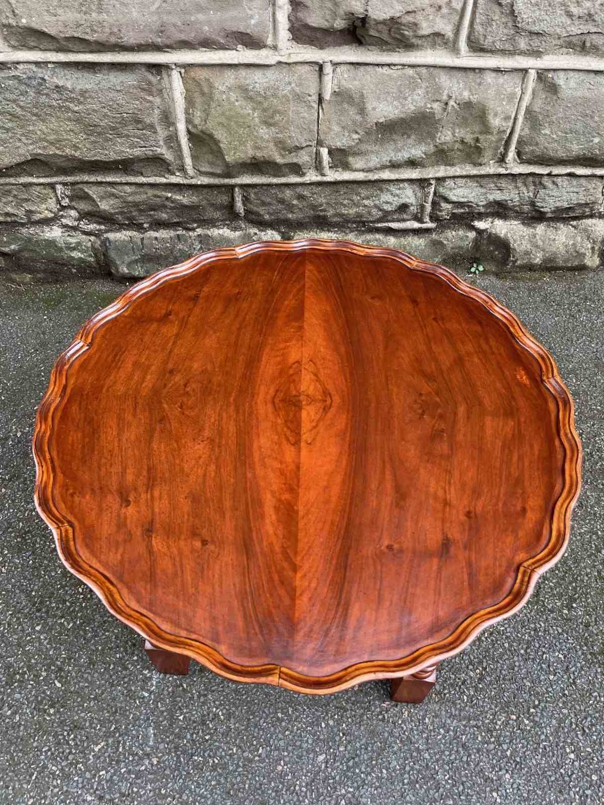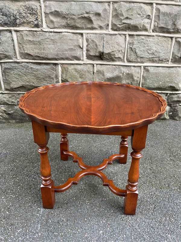 Offered for sale is this early 20th Century antique coffee table in walnut have a walnut veneered top with a pie crust border. Standing on walnut turned legs with a shaped cross stretcher.