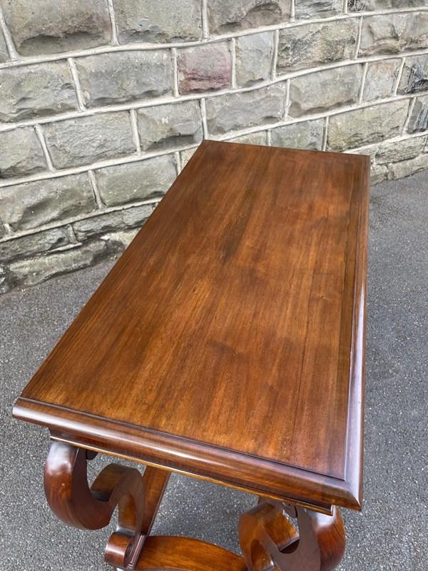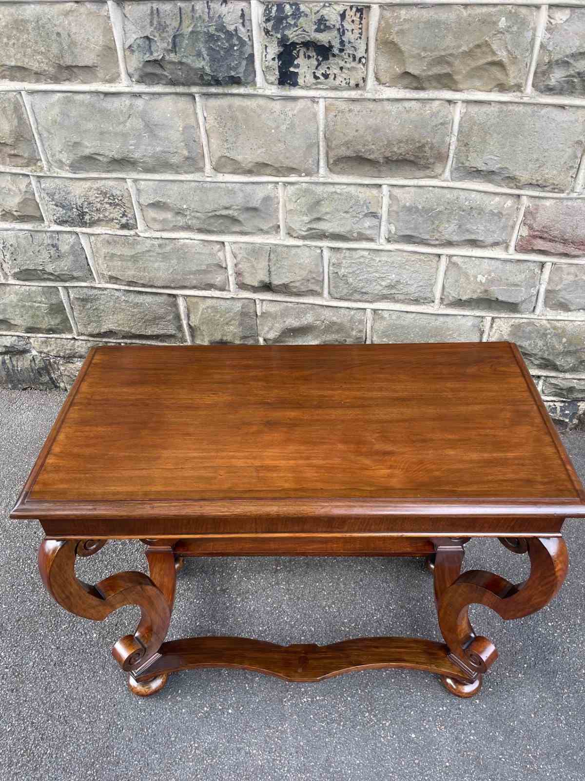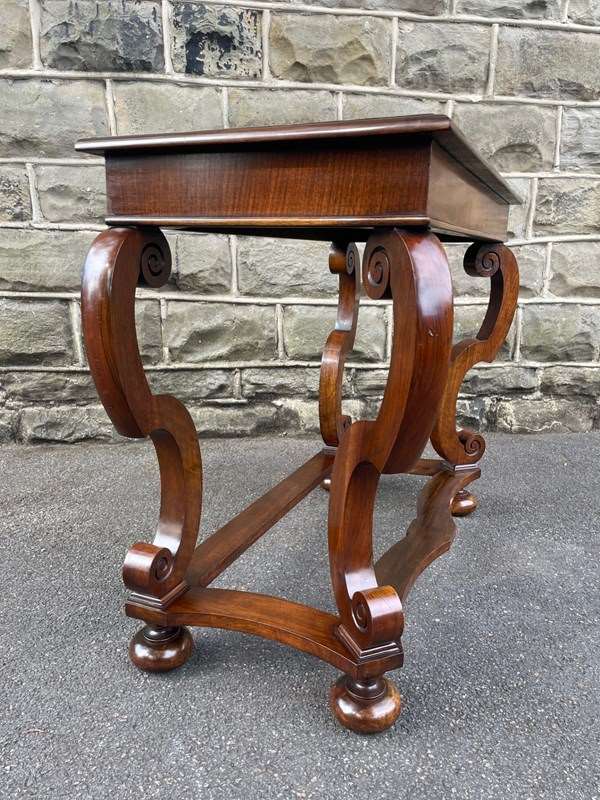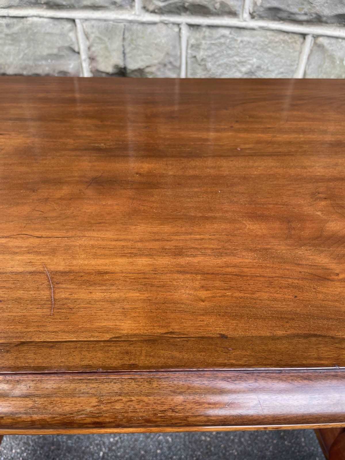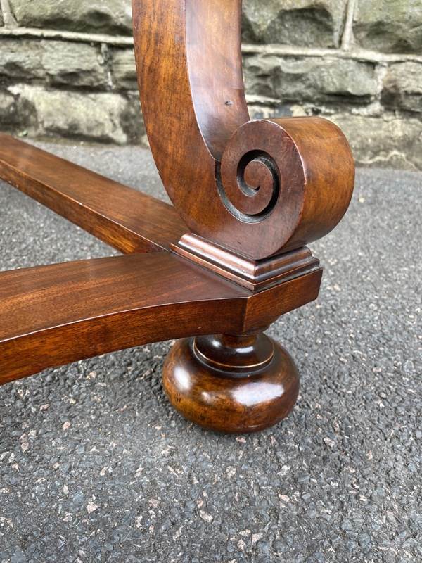 In solid walnut standing on shaped walnut legs with stretcher upon turned bun feet. Wonderful colour.