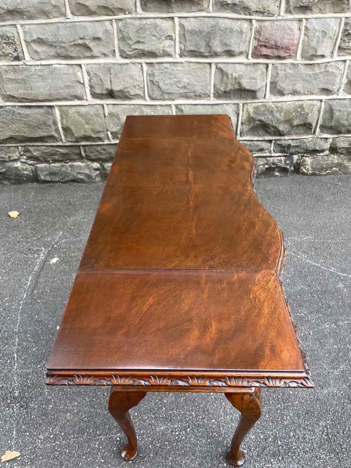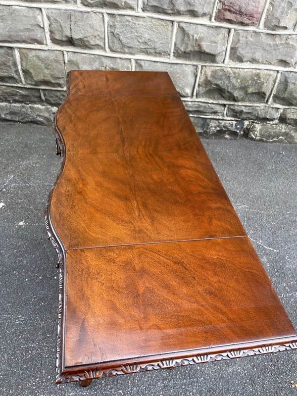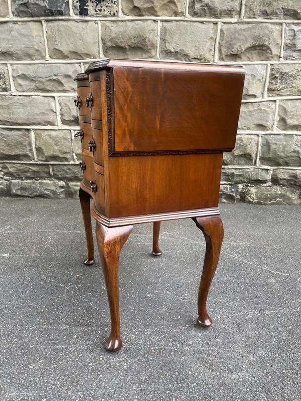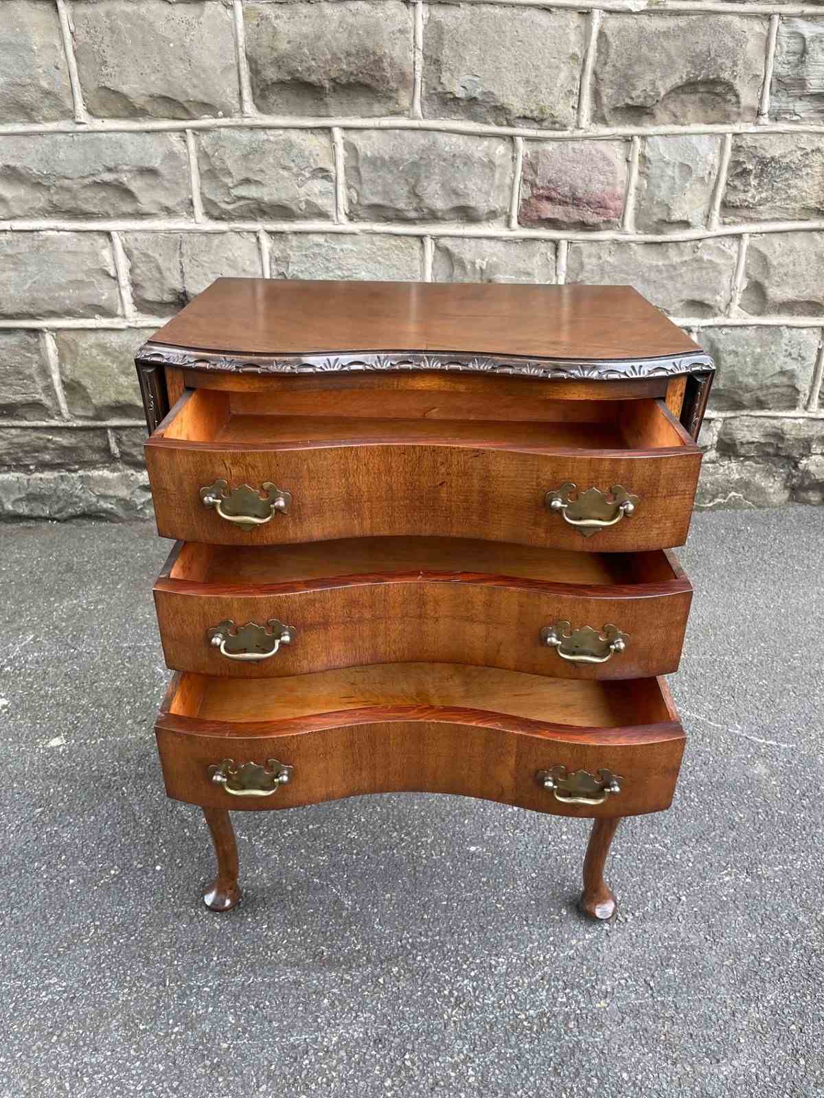 Offered for sale is this 1920's antique bedside chest with walnut veneered top, inverted serpentine front and a carved edge and drop flaps. It has 3 inverted serpentine draws with walnut veneer and brass ring drop handles. It stands on cabriole legs with a pad foot.