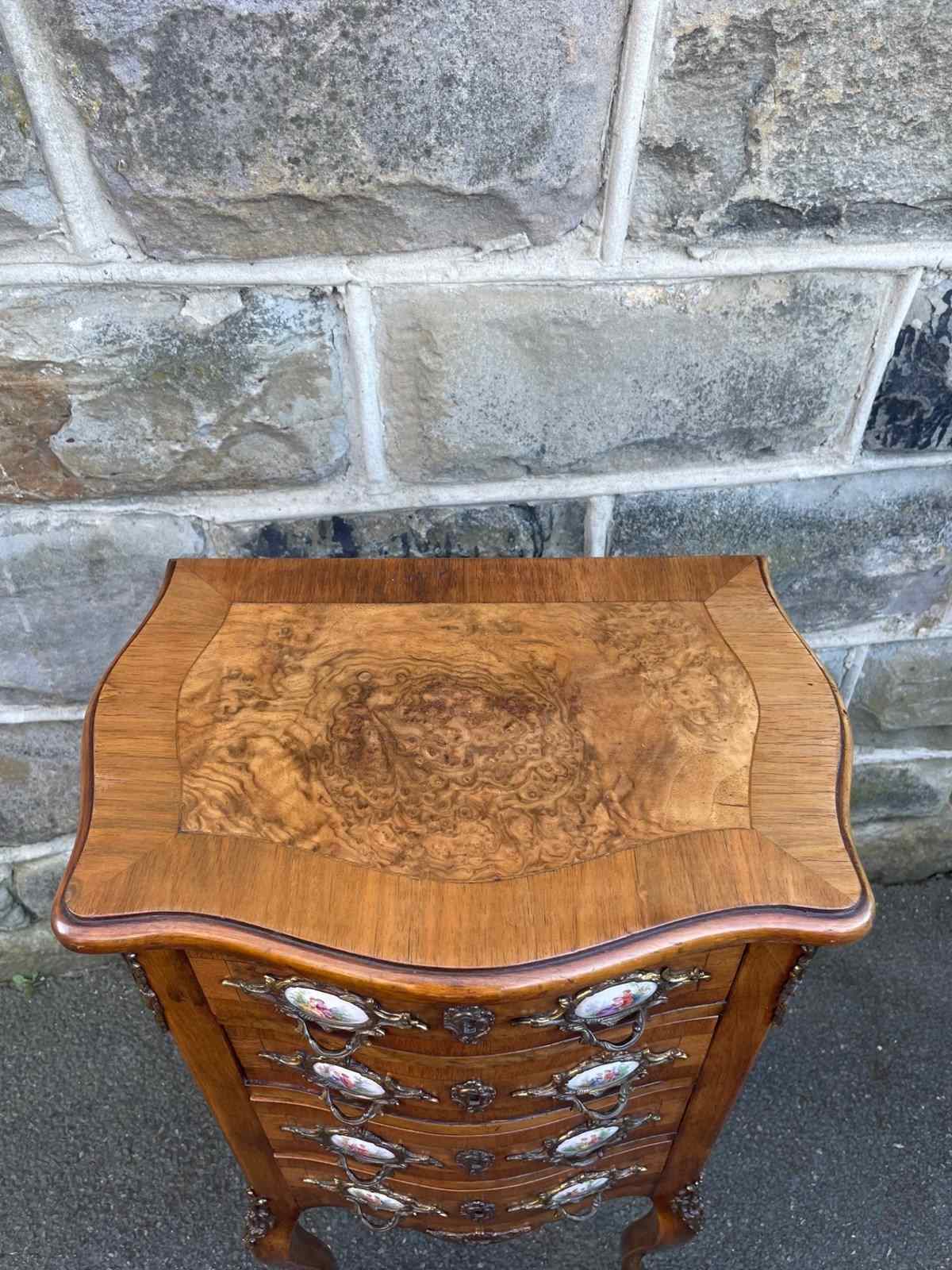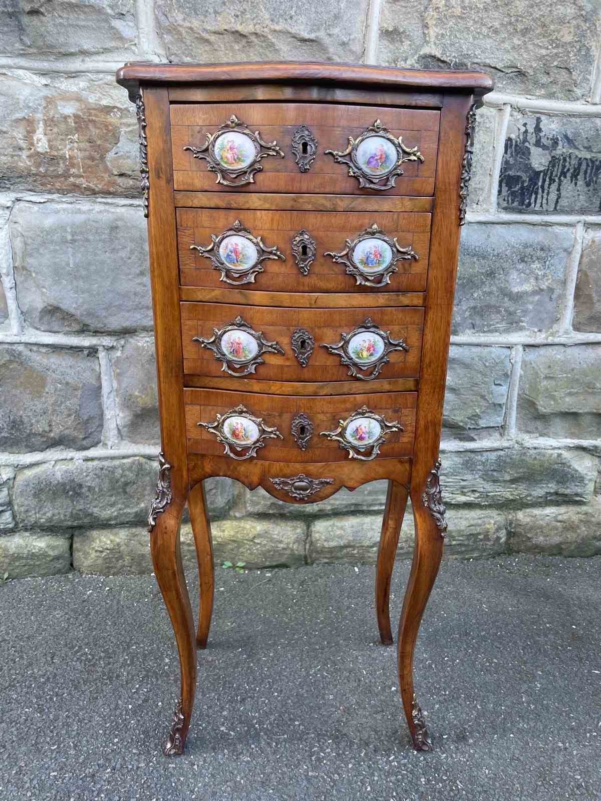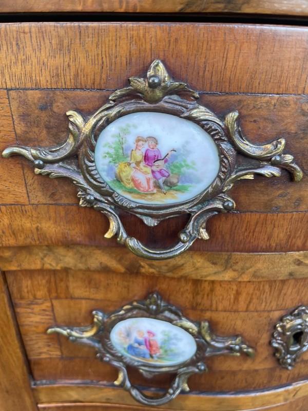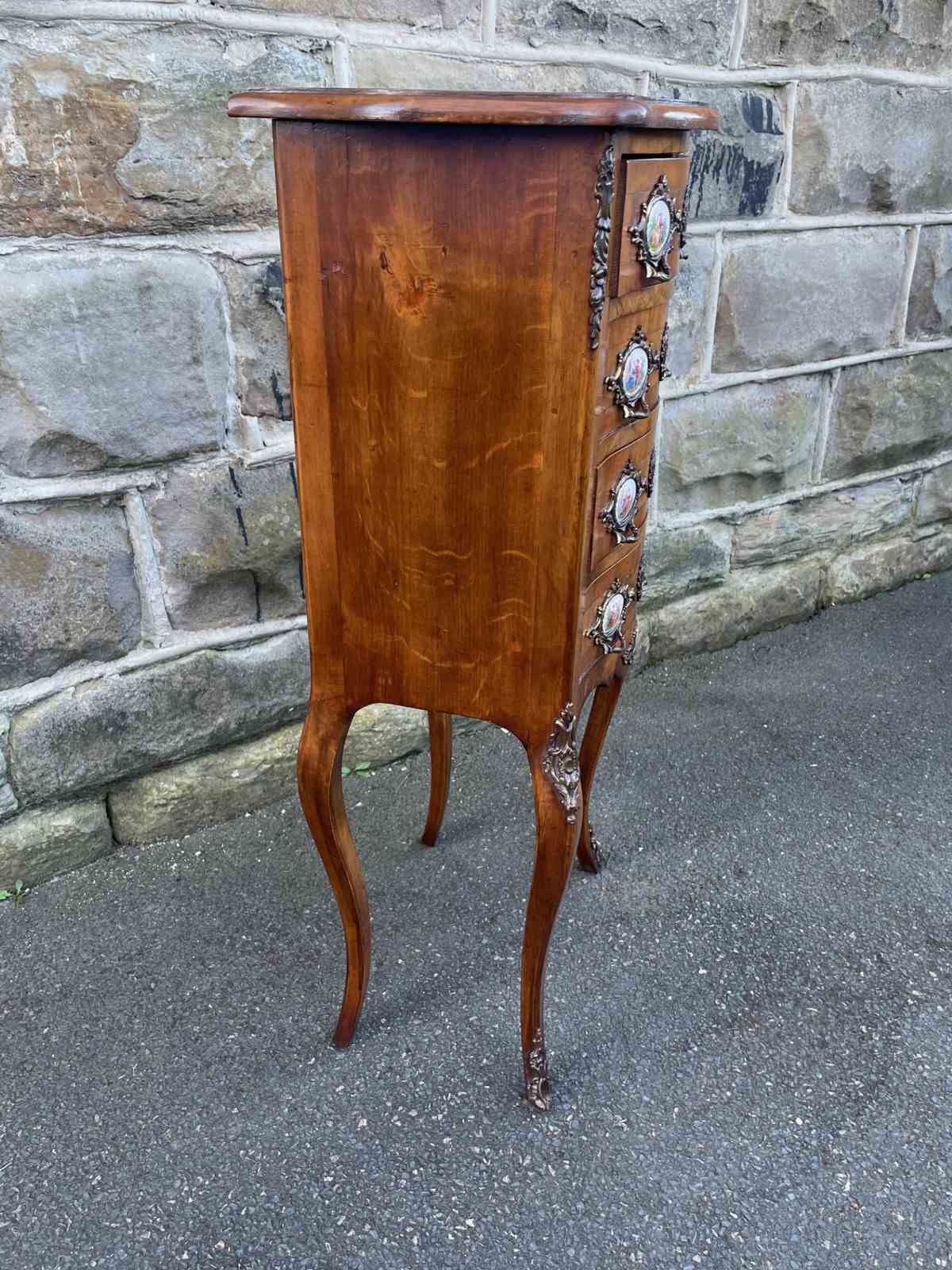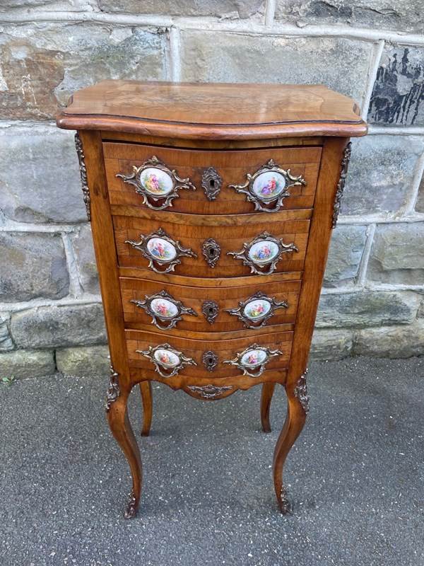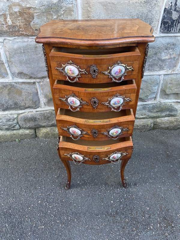 Lovely neat size & proportions. In walnut having a serpentine front, 4 draws with ormolu mounts & porcelain plaques. Polished walnut sides, standing on slender cabriole legs with ormolu mounts.