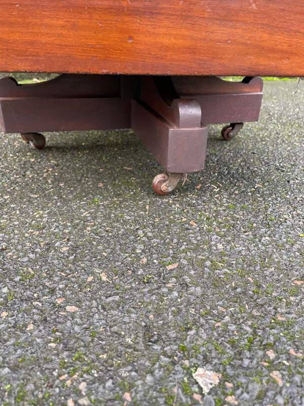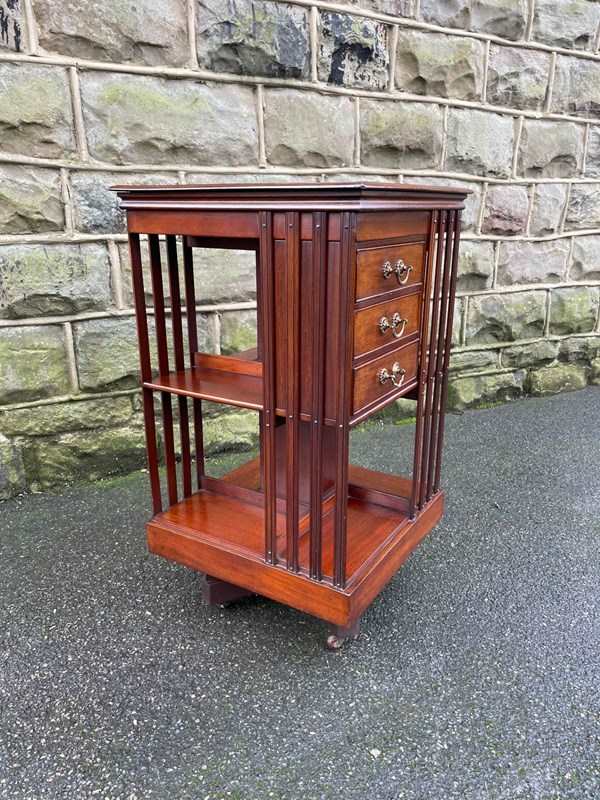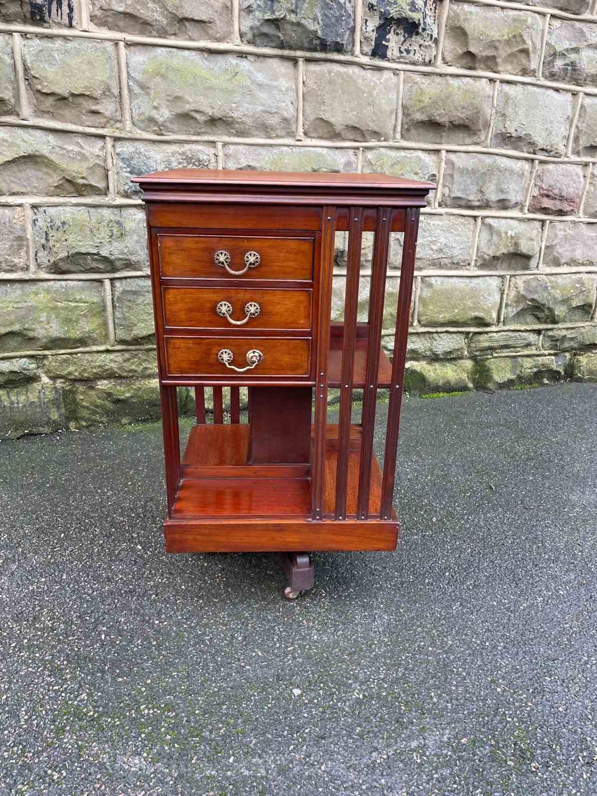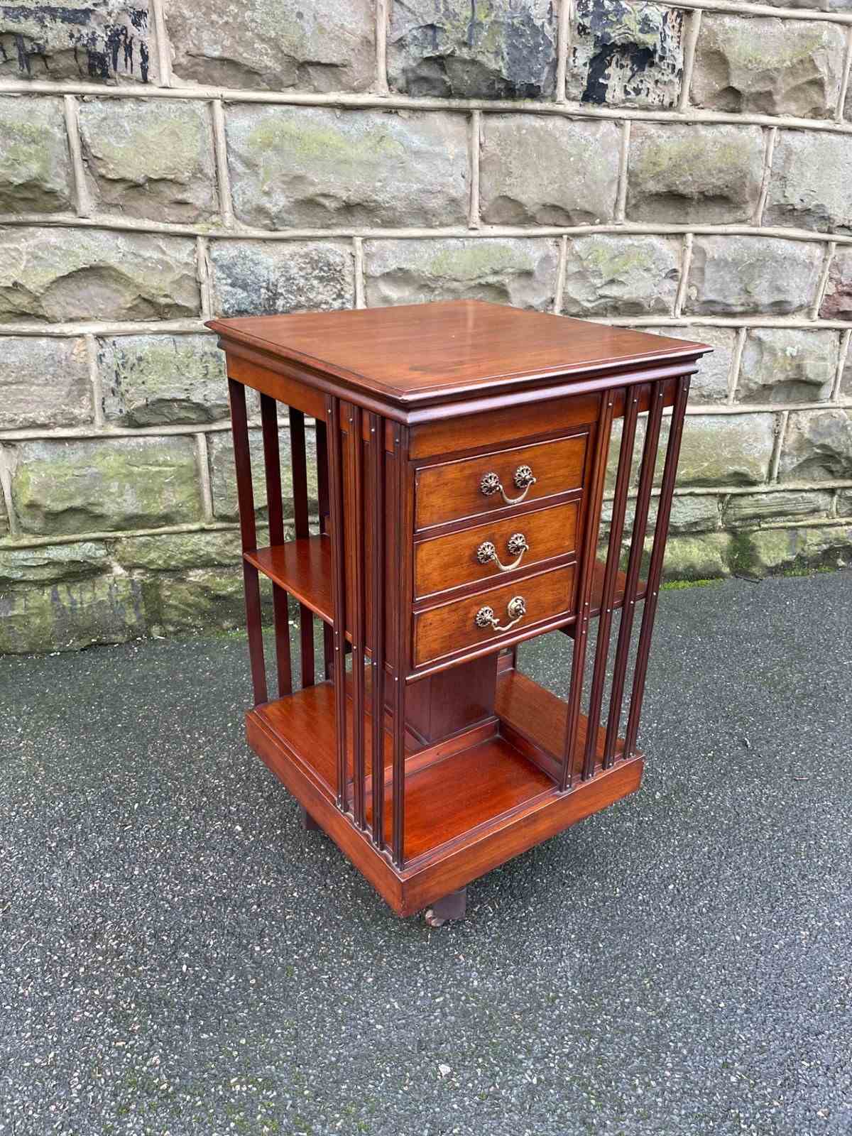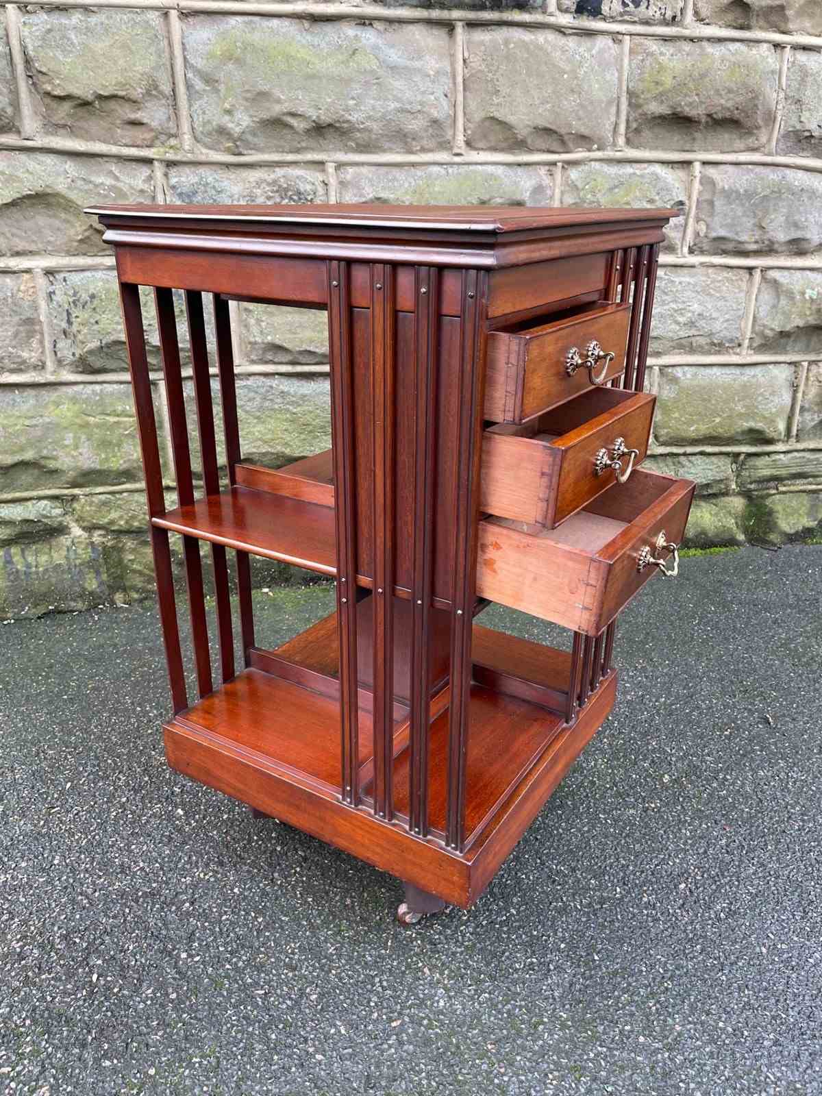 In solid mahogany. It has mahogany slats to each side with fixed shelves & 3 draws, plinth base with a mahogany cross stretcher base with castors. Revolves around smoothly.