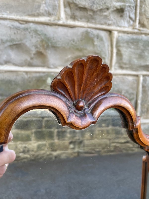 Offered for sale is this antique walnut framed dressing table mirror. Walnut frame, having Queen Anne style arch top with shell motiff, pivoting mirrors either side of the central mirror. Original plate mirror. Standing on shaped. Folds up neatly.