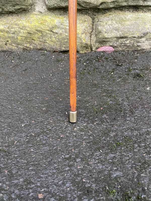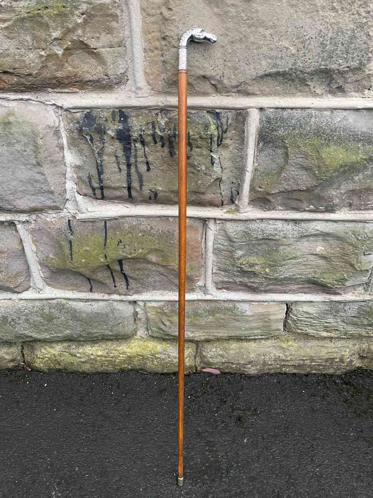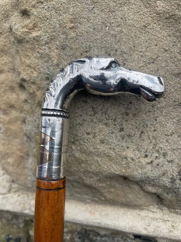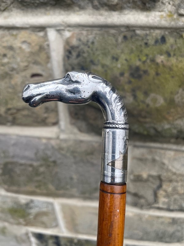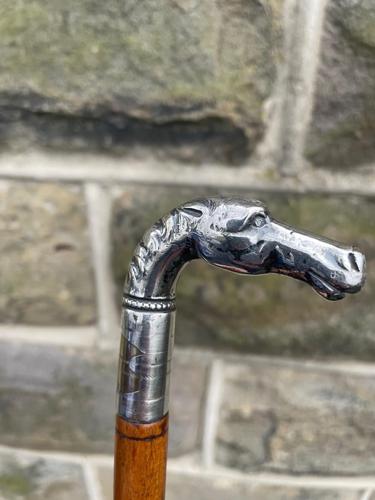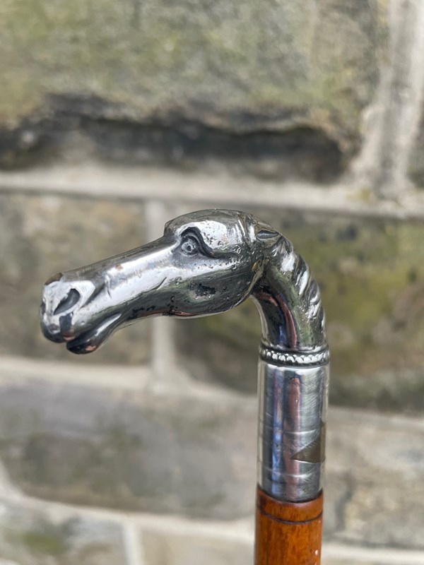 The handle in the form of a horses head white metal probably silver plated. Nice quality & well cast.