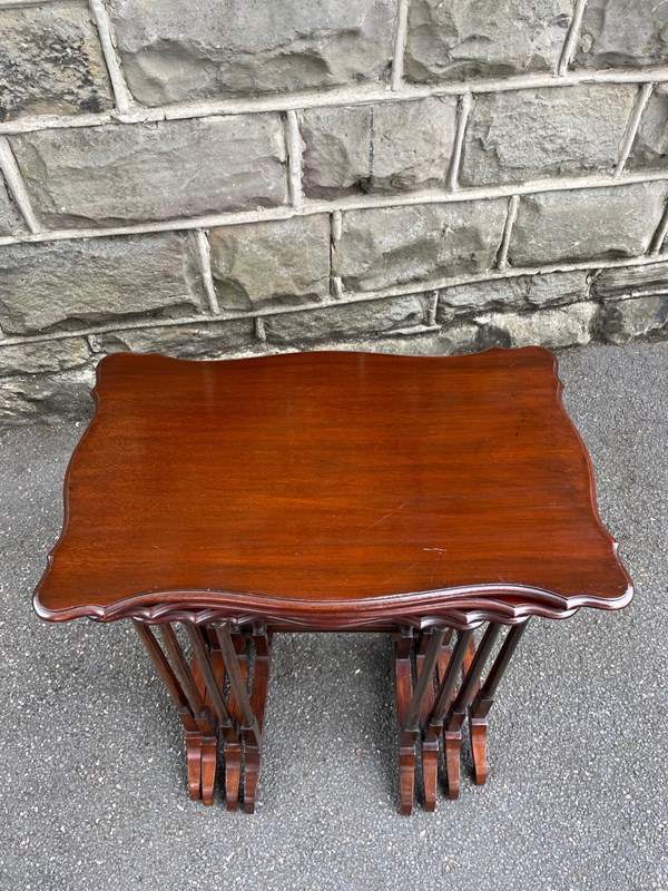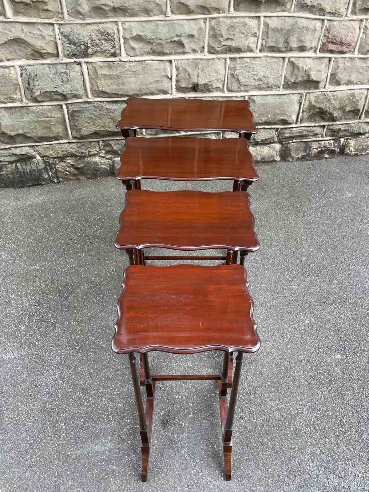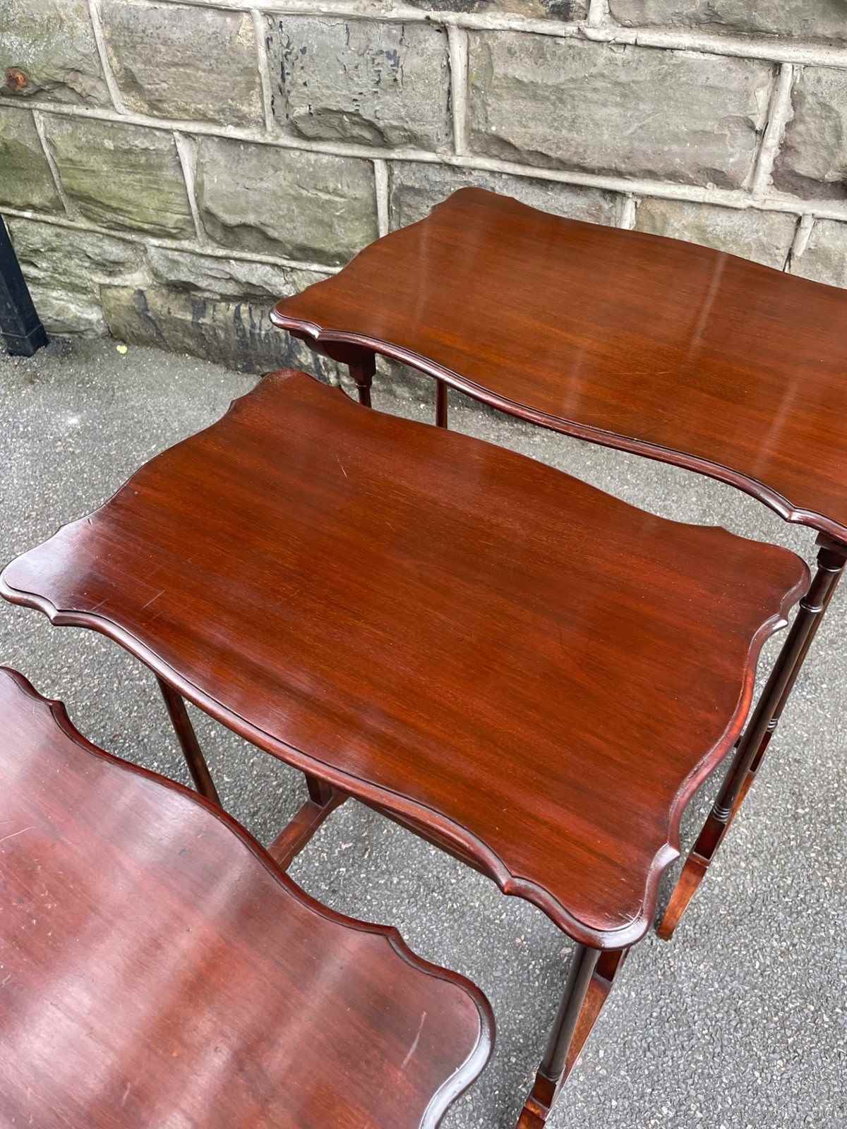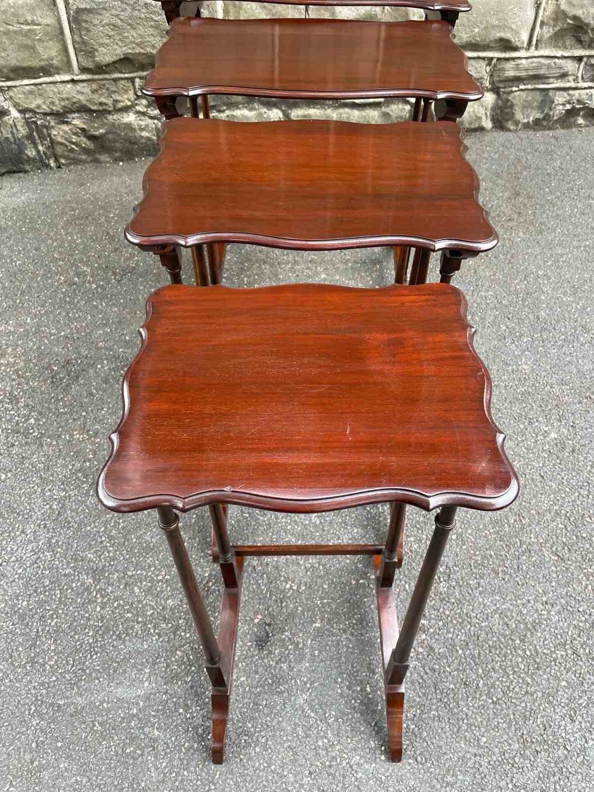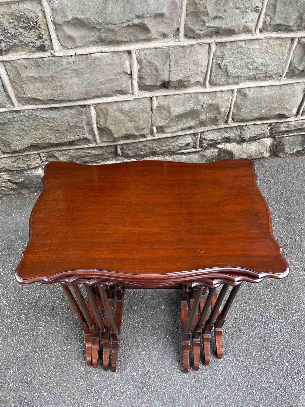 Shaped mahogany tops, standing on twin turned pedestal supports with shaped feet. The smaller tables slide under each other so when you pick up the largest tables, the smaller ones are fastened underneath making them easy to carry.