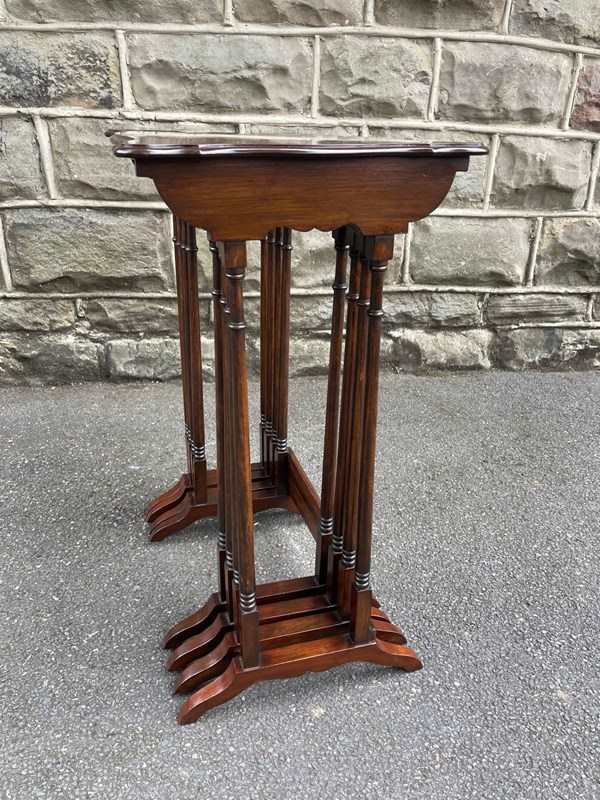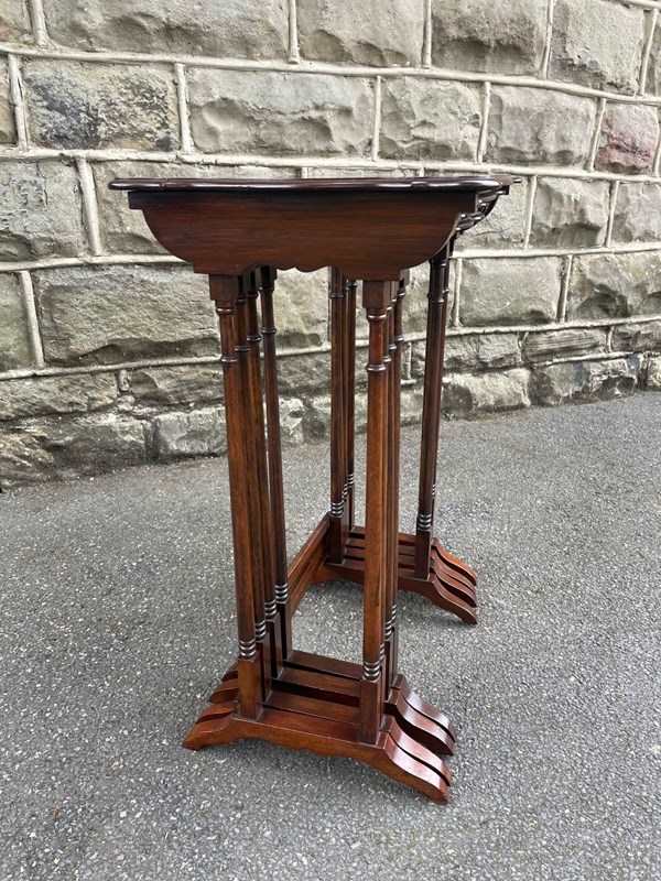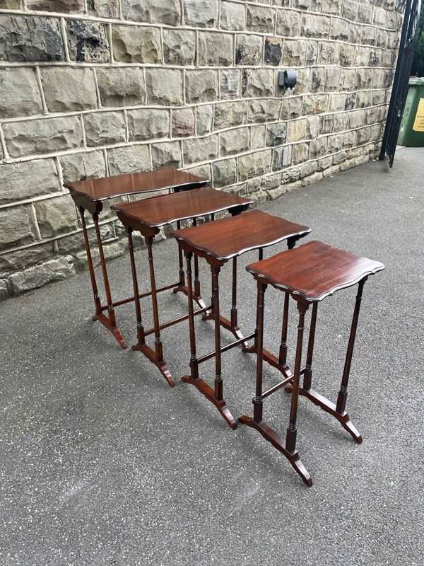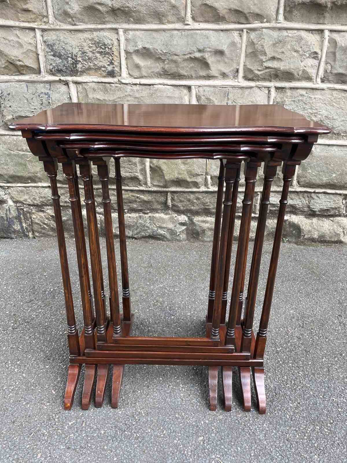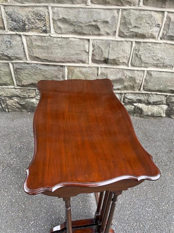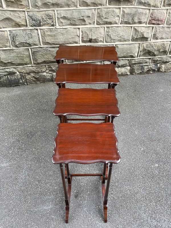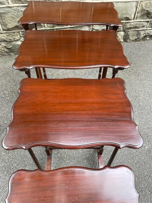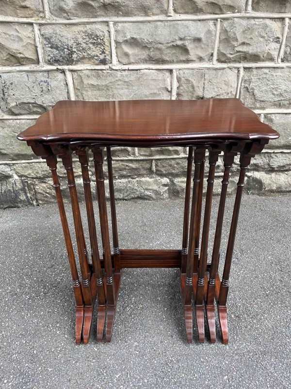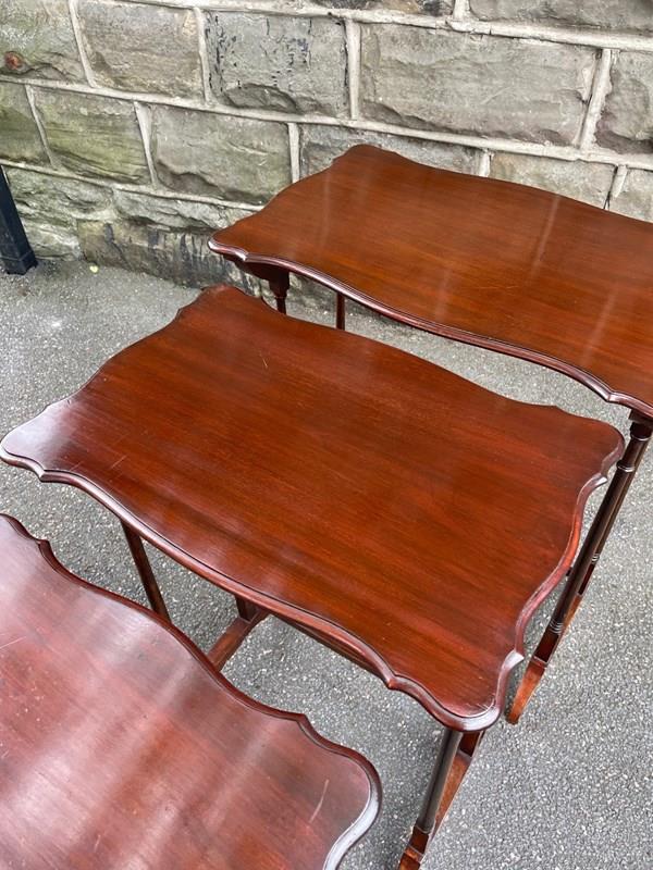 Shaped mahogany tops, standing on twin turned pedestal supports with shaped feet. The smaller tables slide under each other so when you pick up the largest tables, the smaller ones are fastened underneath making them easy to carry.