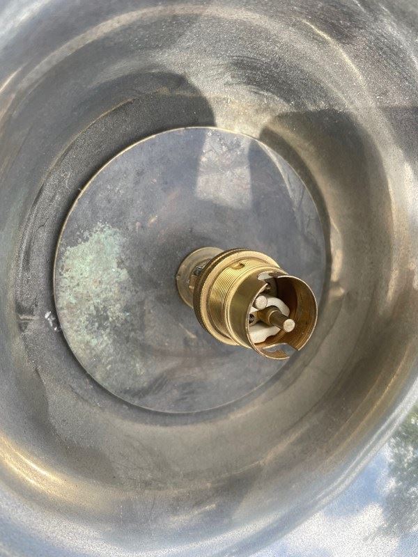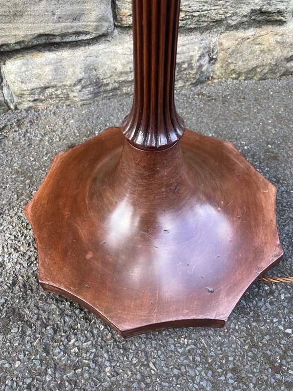 It has the original bronzed finished shade, english bulb fitting, reeded walnut tapering columns on a nice shaped base. Fully wired in working order.