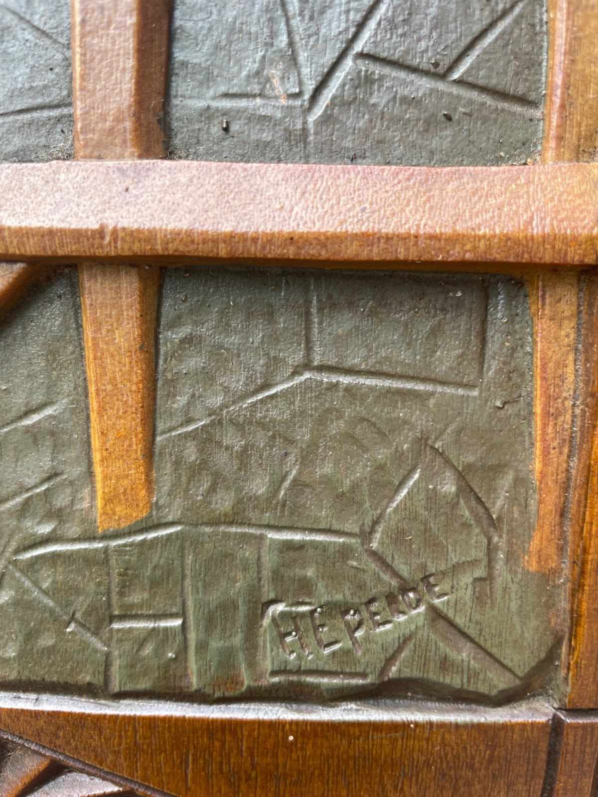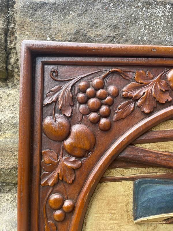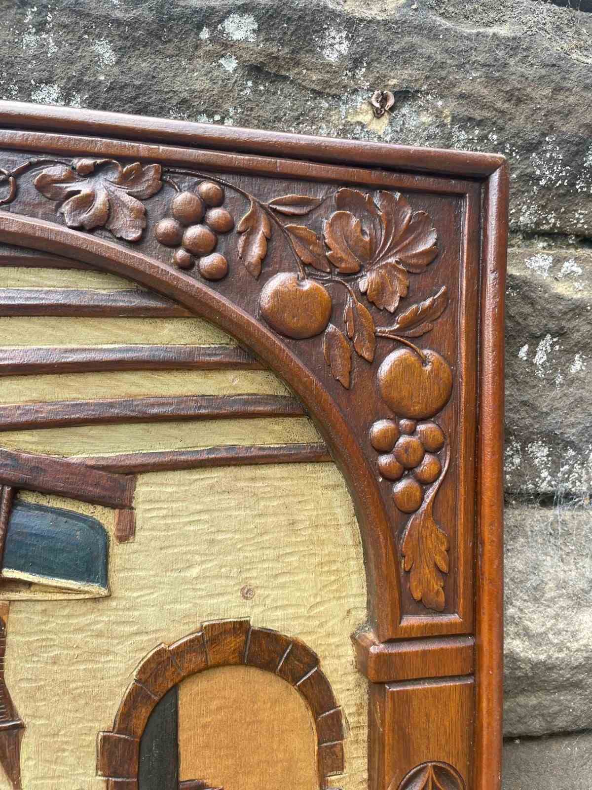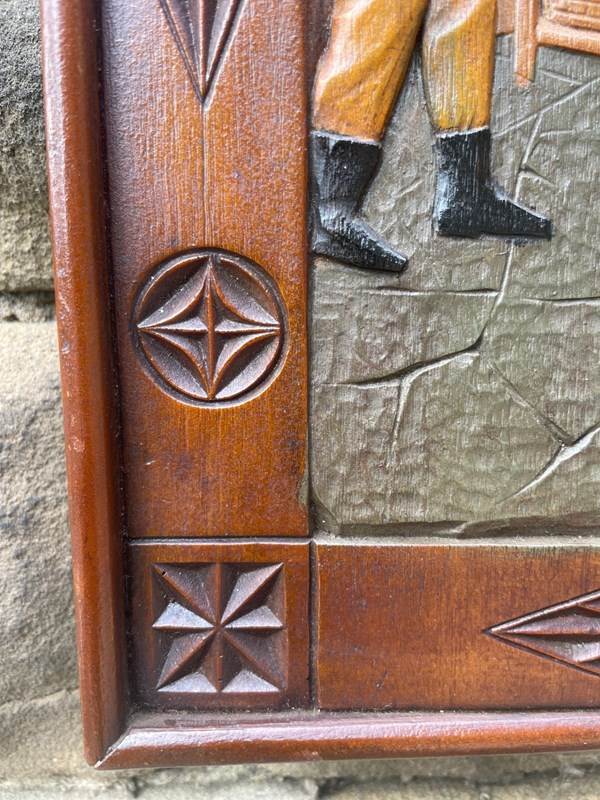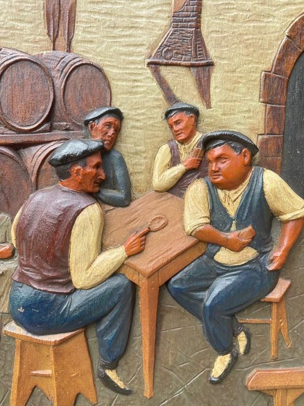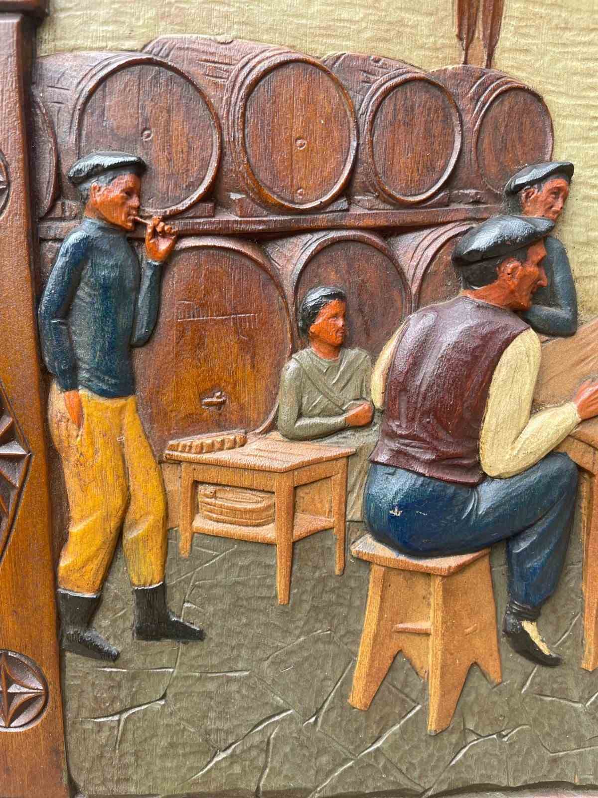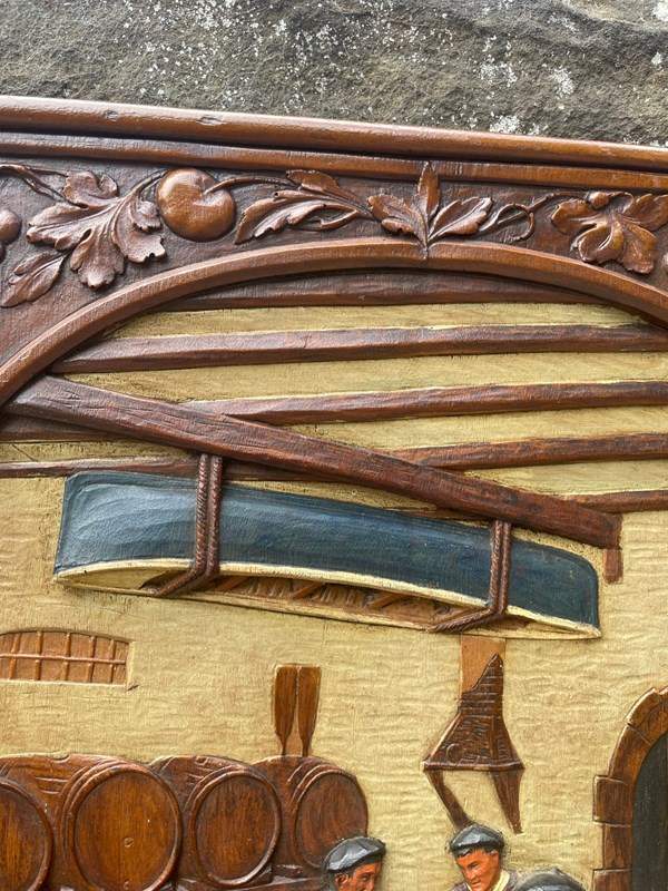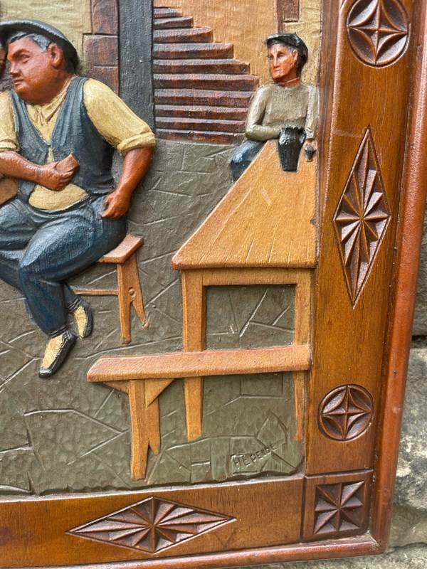 Carved in walnut with polychrome painted decoration of a tavern scene, signed by the artist in the bottom right corner.
