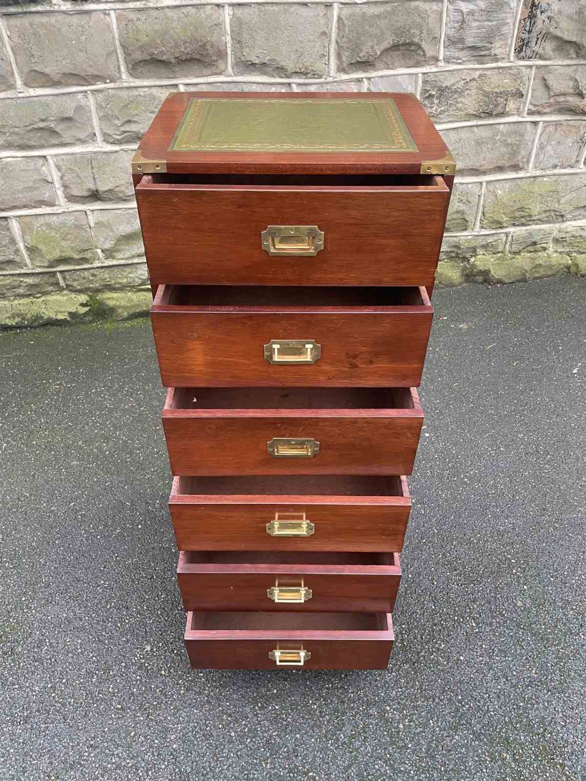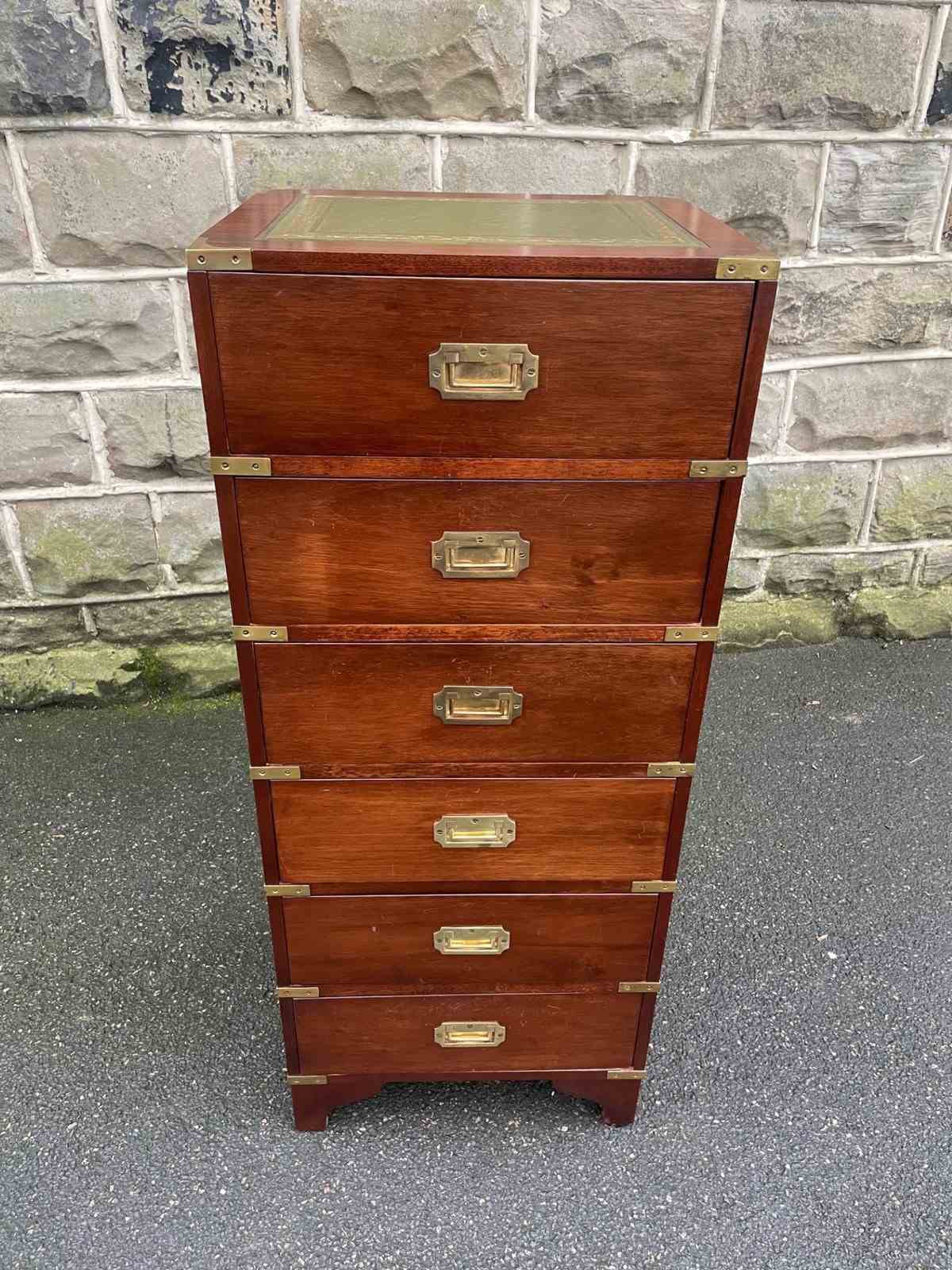 Offered for sale is this quality brass bound mahogany campaign military chest draws. Nice slim size & proportions Made from mahogany, with tooled leather top, 6 draws having brass flat flush fitting handles. Brass bound corners. Standing on bracket feet, polished mahogany sides with brass carrying handles