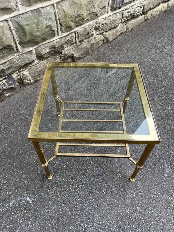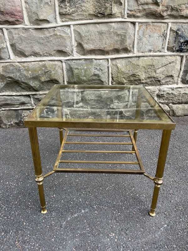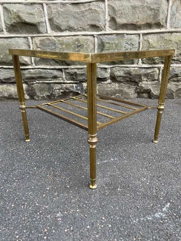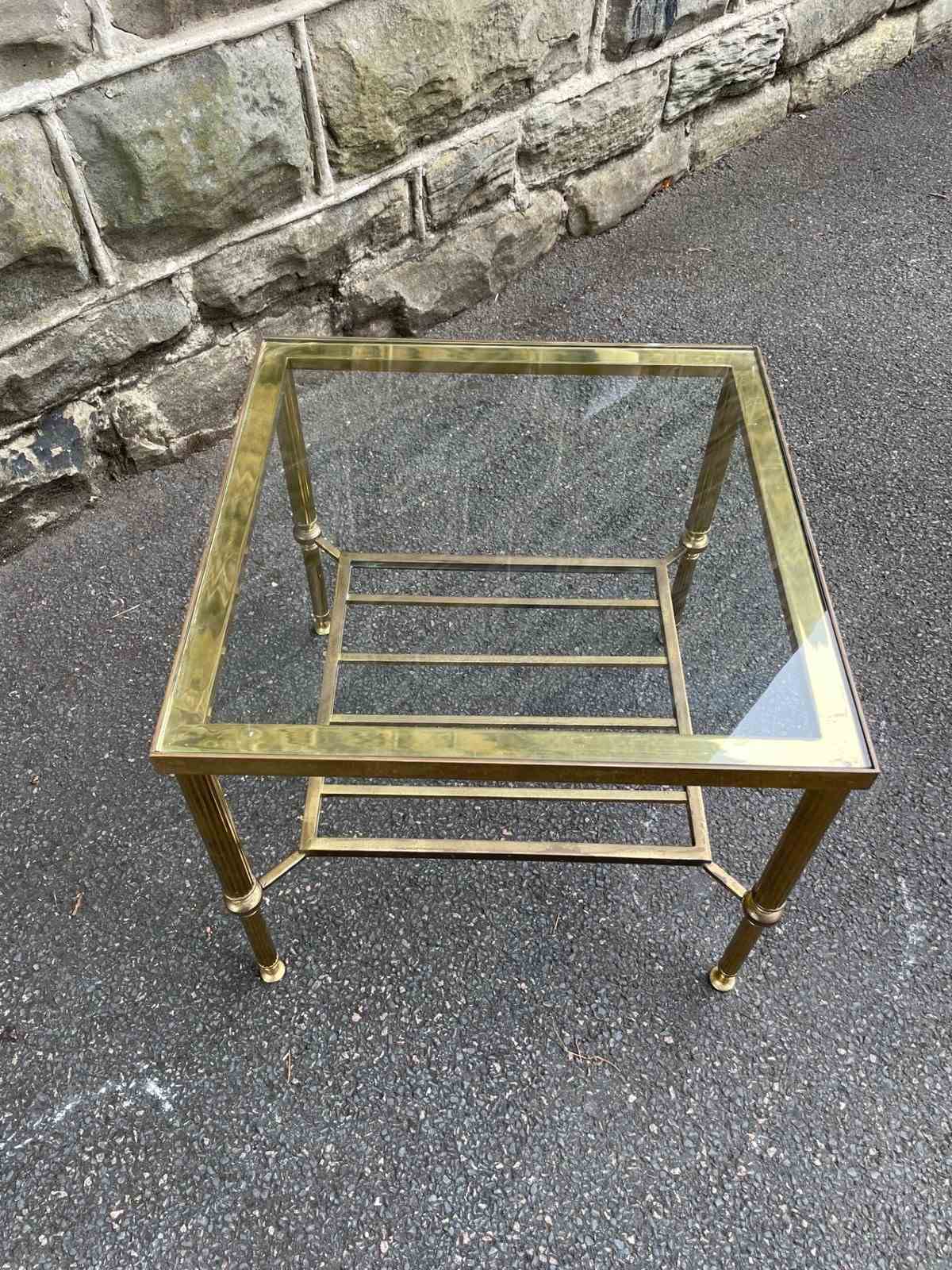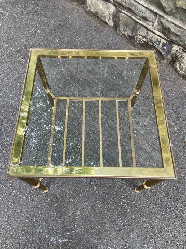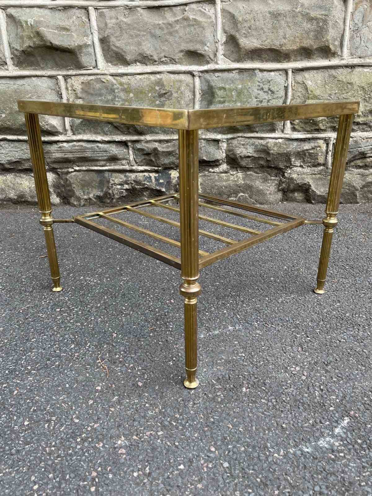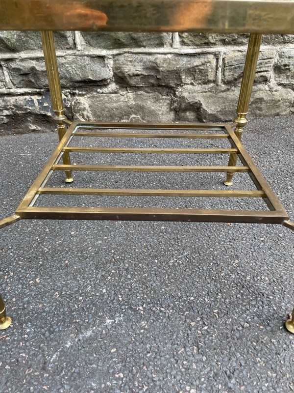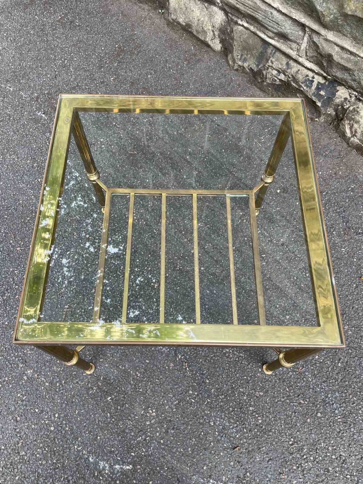 Hollywood regency In the Maison Jansen style, brass frame with turned & reeded legs with brass rail undeshelf. Inset glass top.