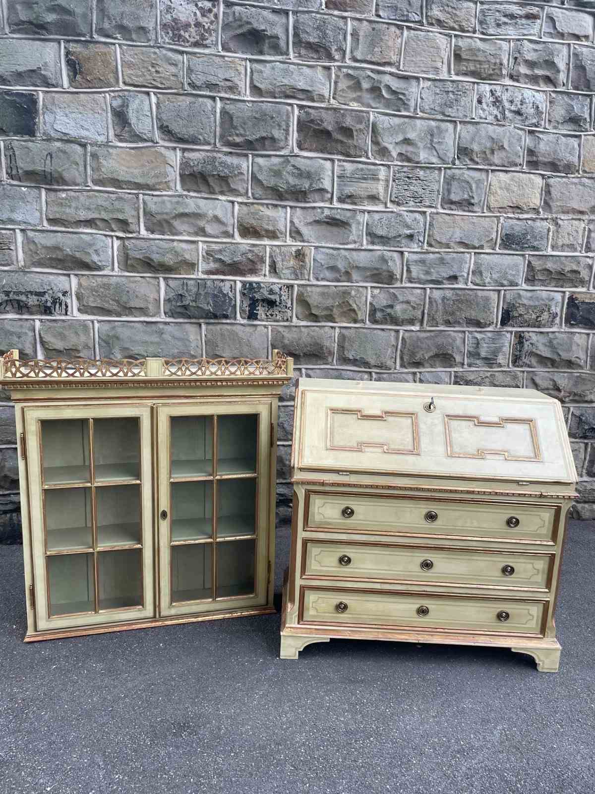 Of European origin, possibly Danish/Sweedish. The bookcase top has a nice pierced fret work gallery top, paid of glazed door with internal shelves. The bureaux with fall front, pull out supporting loafer, internal draws, cupboards etc. It has draws with brass ring handles, standing on bracket feet. Locks & keys.