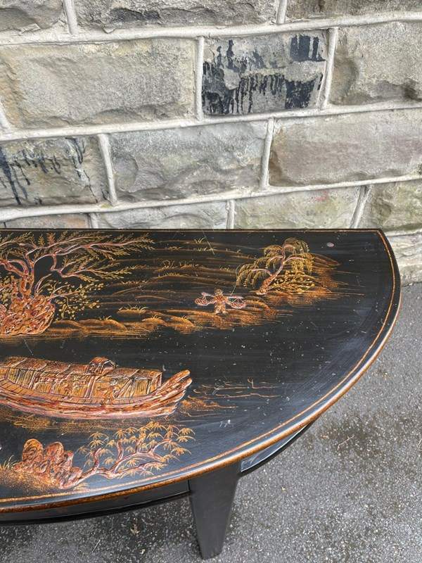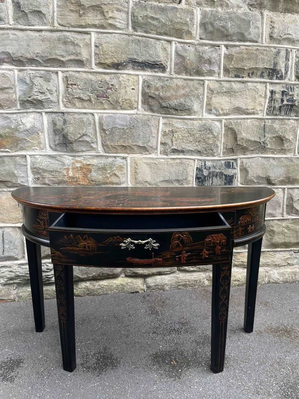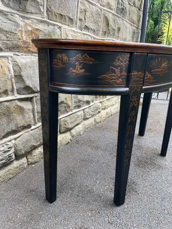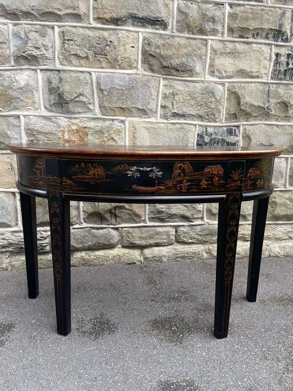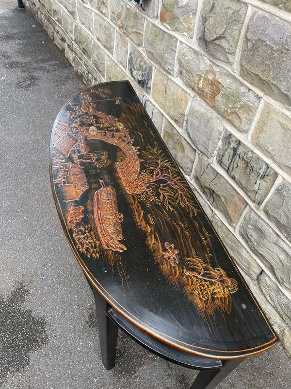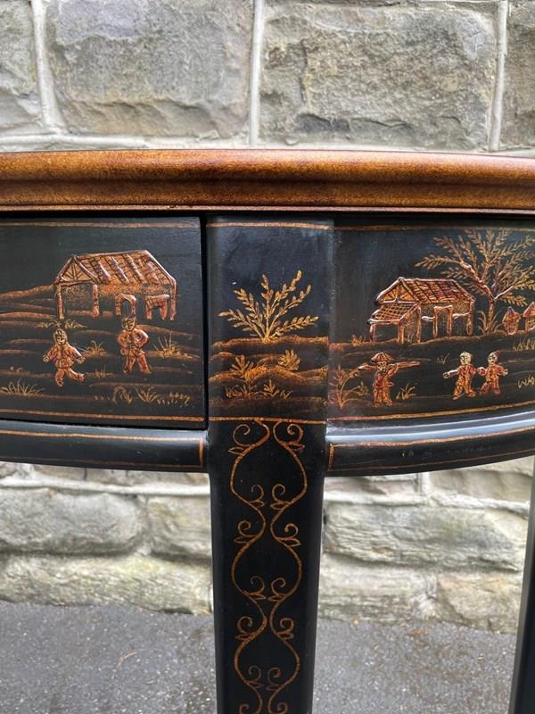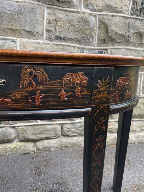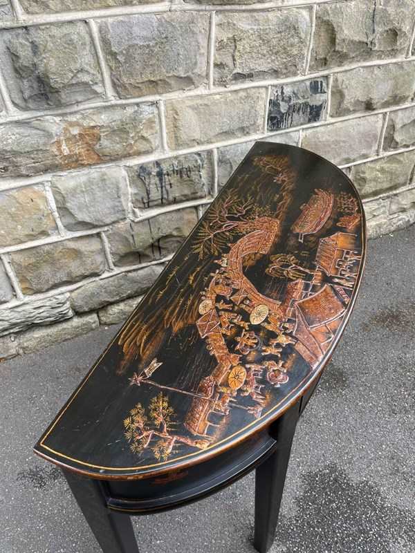 Black lacquered chinoiserie decoration throughout, with a draw to the front with brass handle standing on quare tapering legs