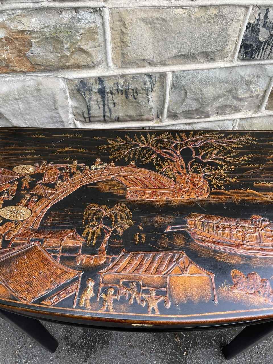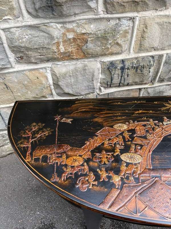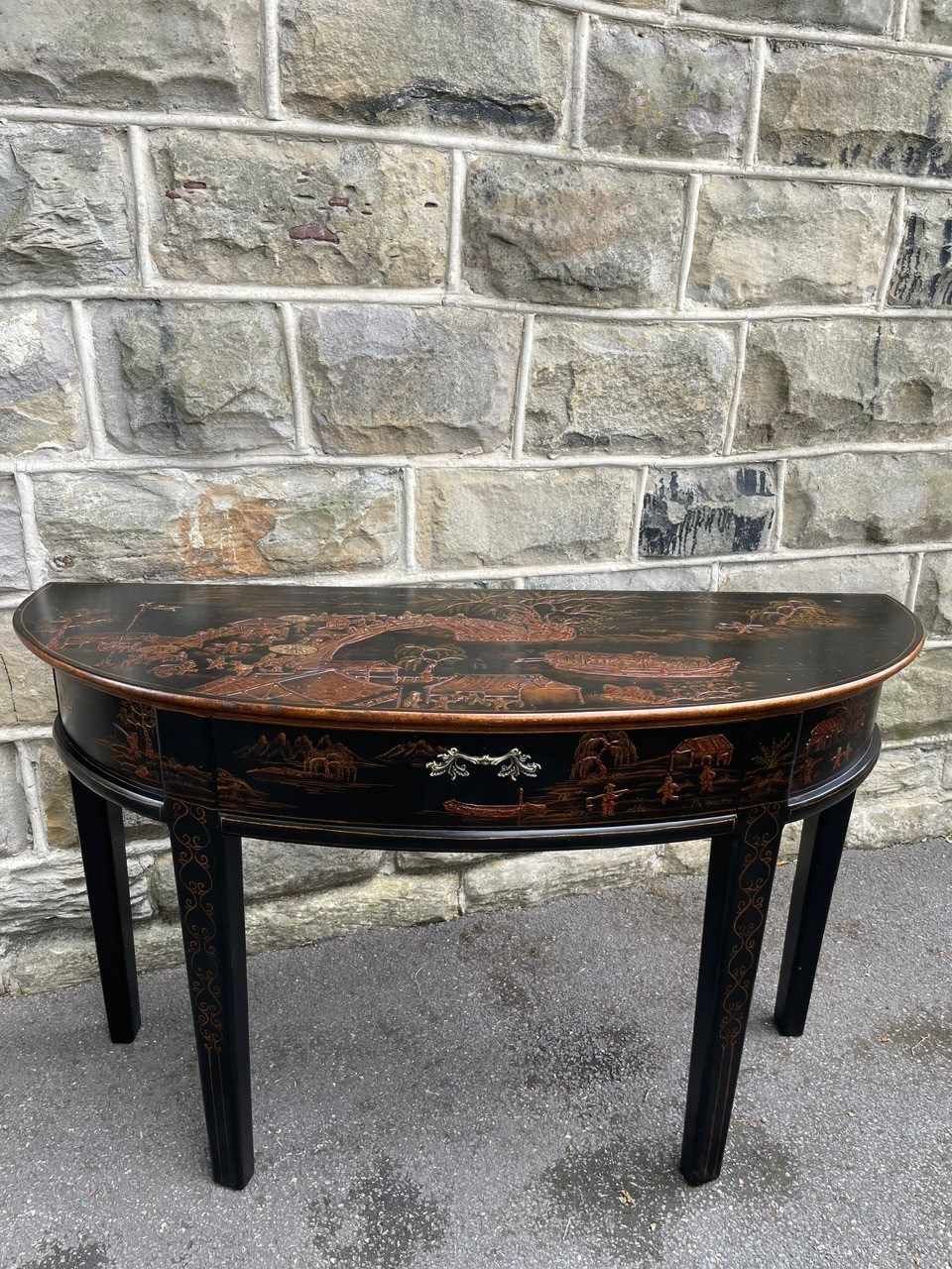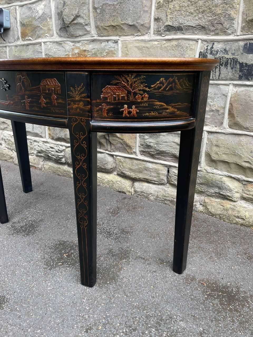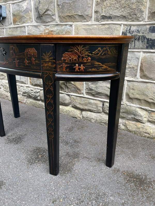 Black lacquered chinoiserie decoration throughout, with a draw to the front with brass handle standing on quare tapering legs