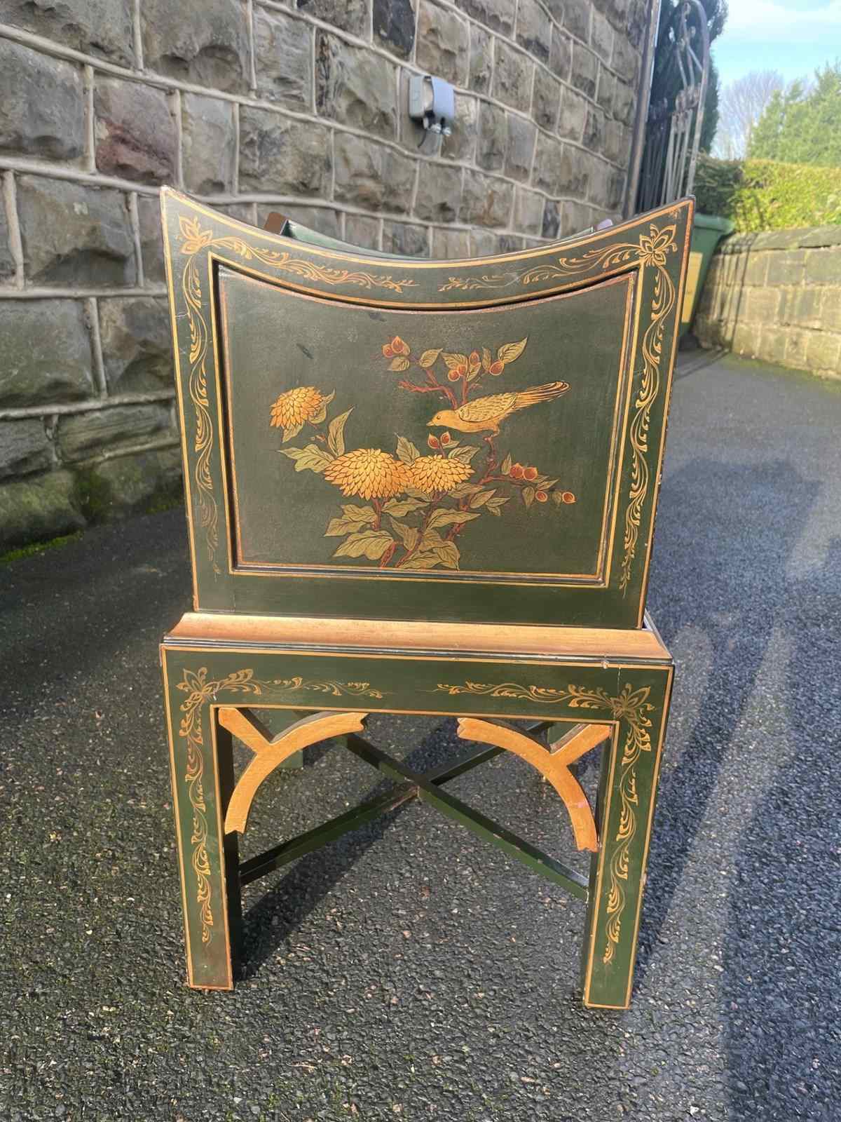 Offered for sale is this decorative green lacquered chinoiserie decorated plant stand.