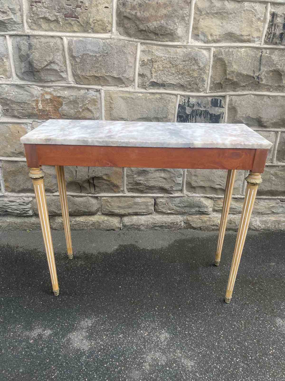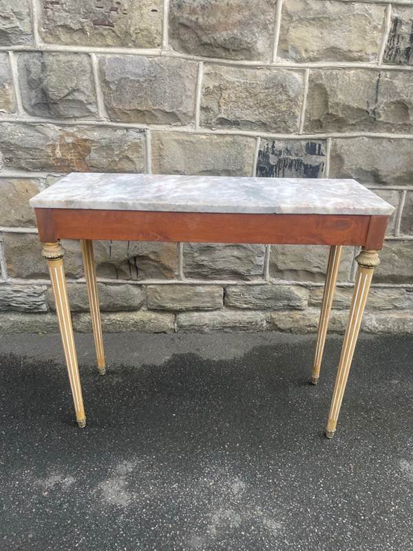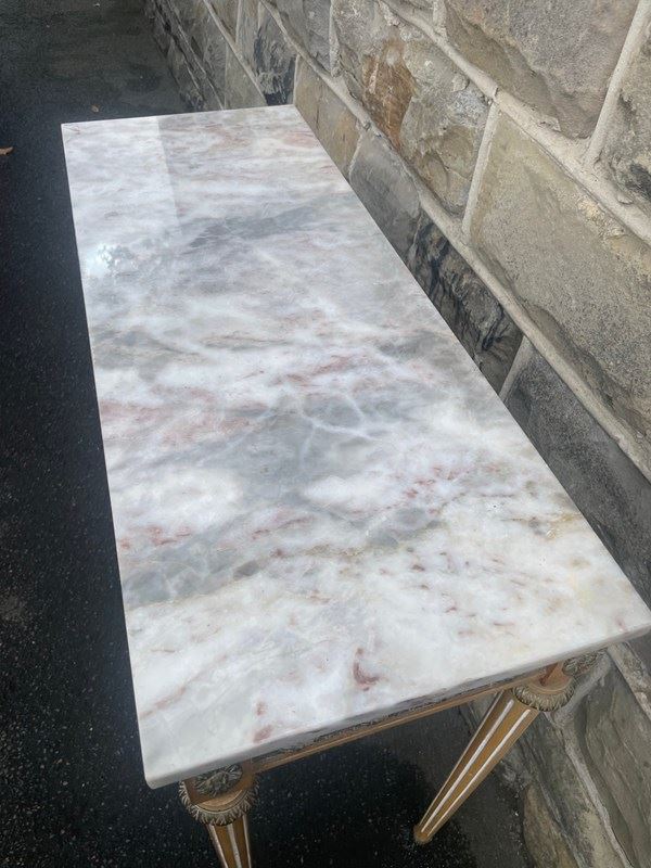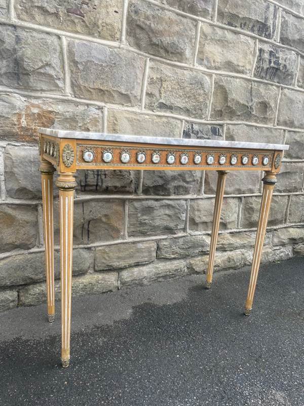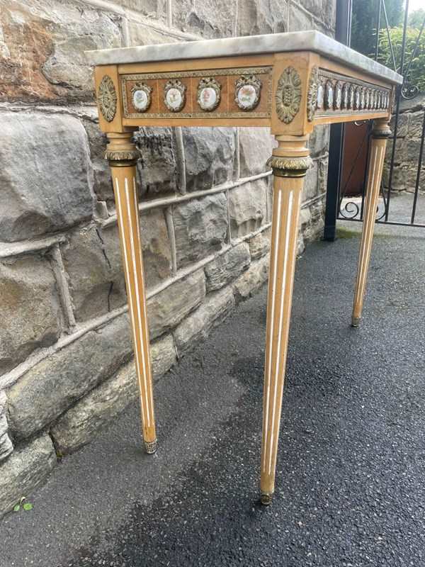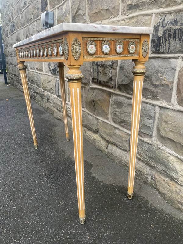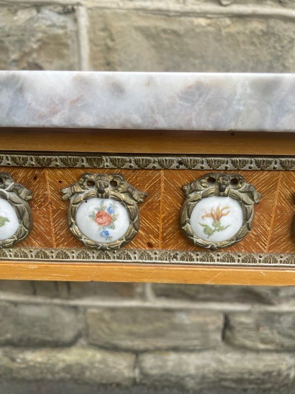 Marble top which sits on the table. The walnut table base with gilt metal embellishments and porcelain plaques around the frieze. Standing on turned reeded walnut legs with gilt metal feet