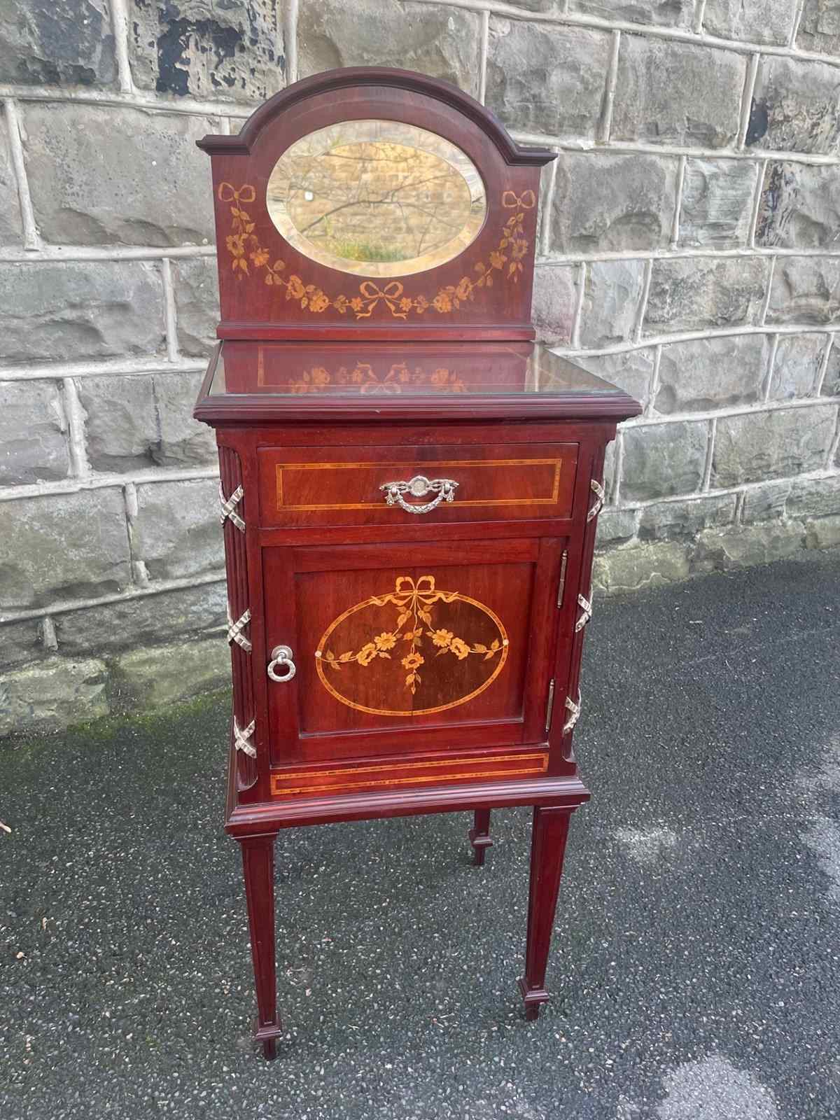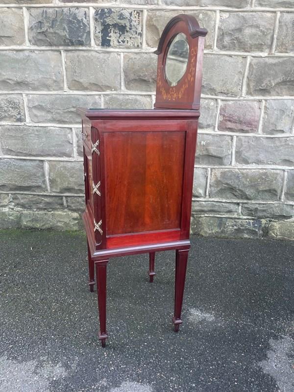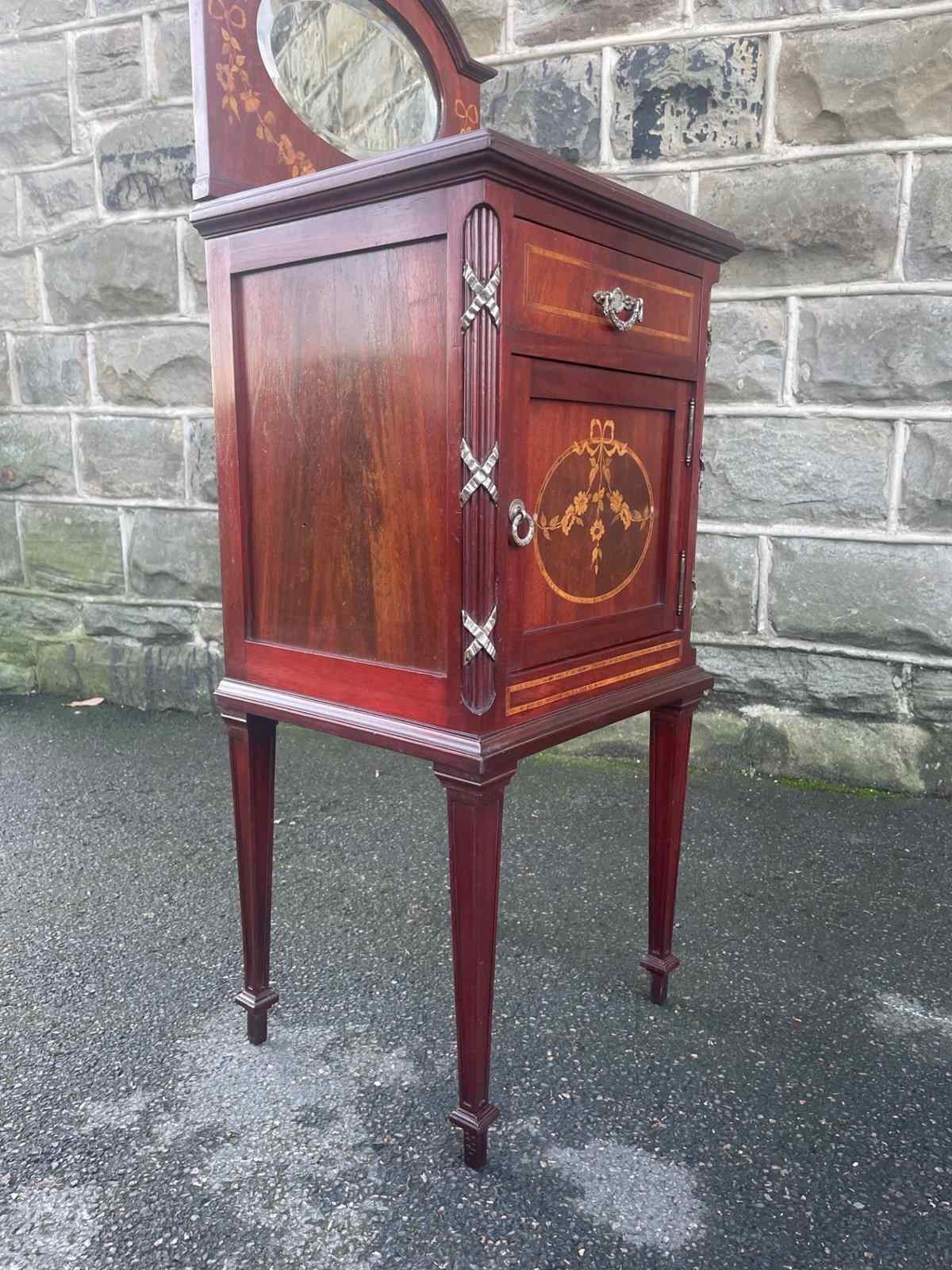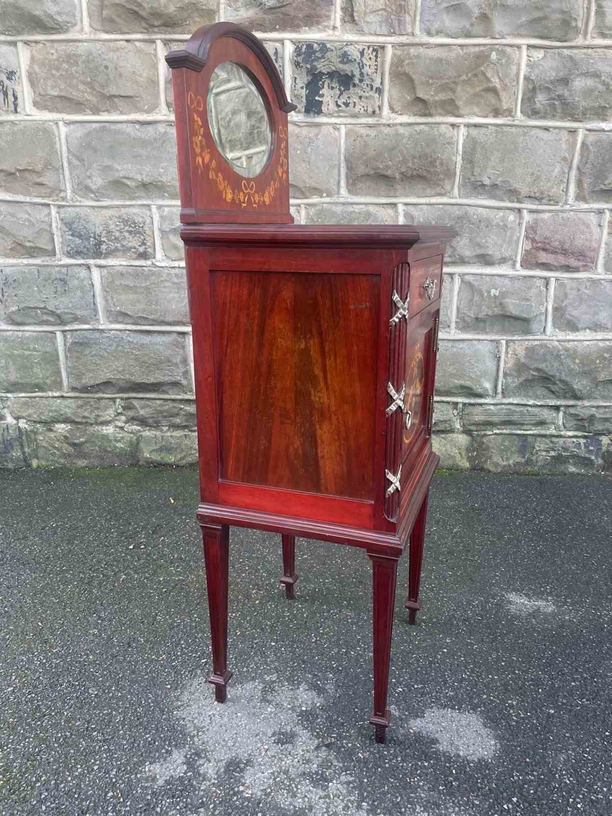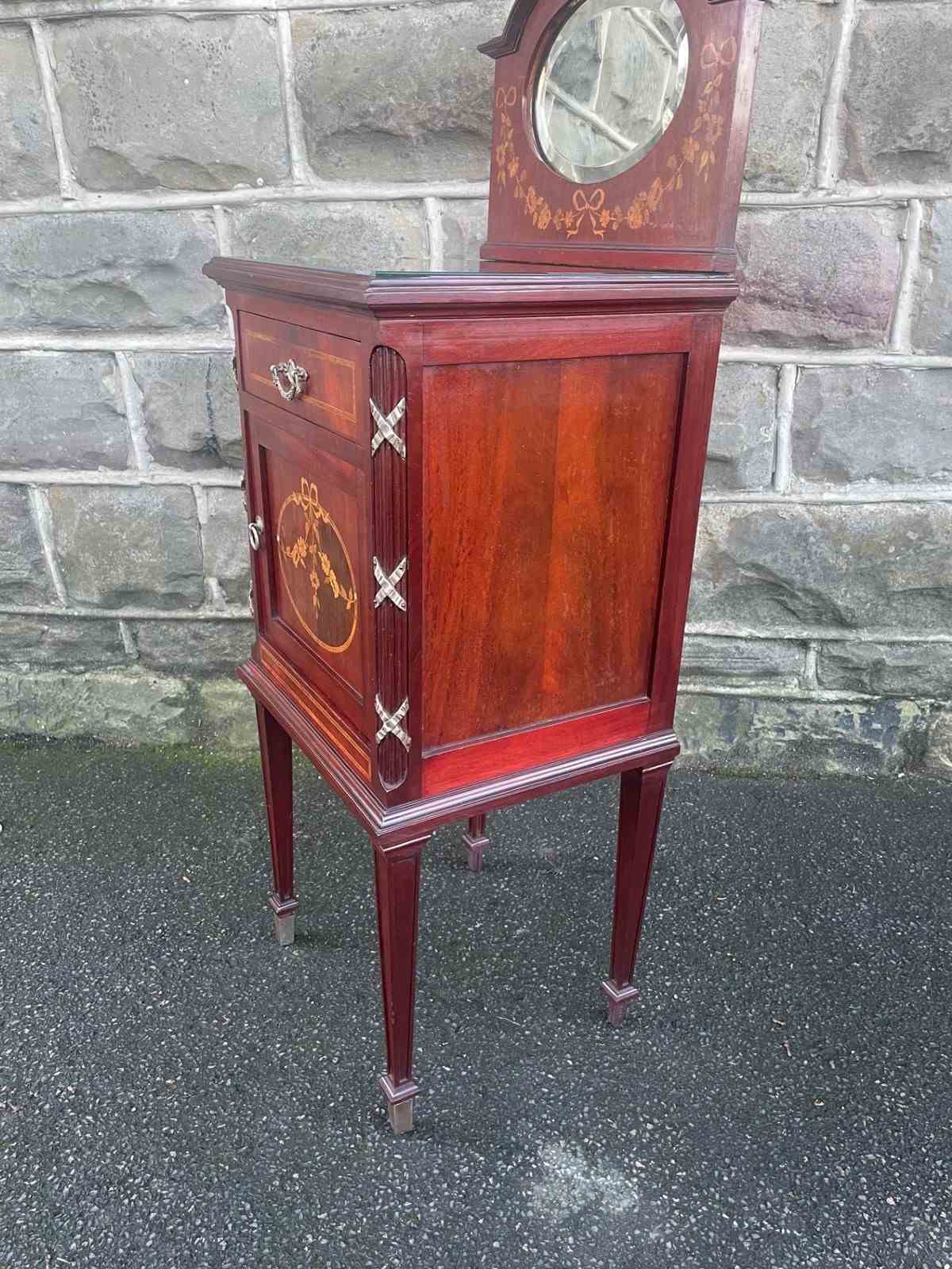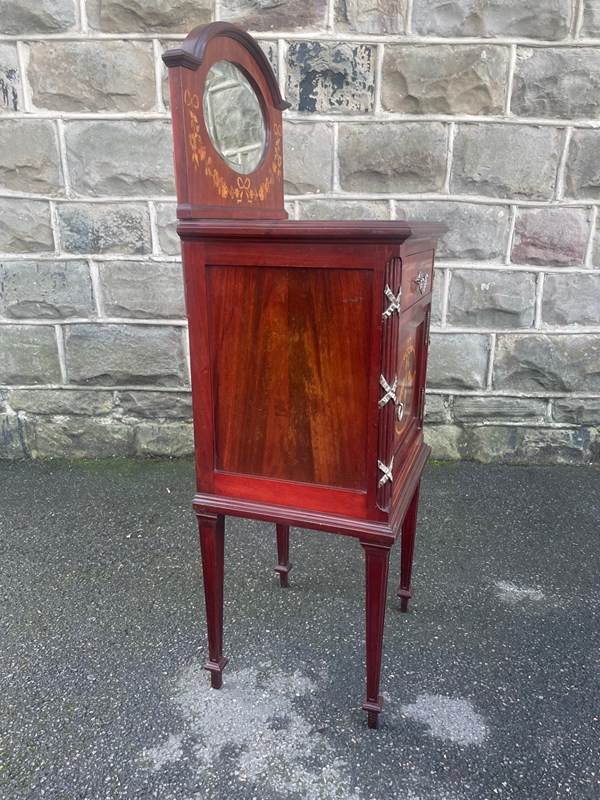In mahogany, shaped mirror back with inlaid decoration. Glass protection top, inlaid satin wood banding around the top, single draw above an inlaid cupboard door. The cupboard retaining its original ceramic liner. Gilt metal mounts to the reeded sides. Standing on square tapering legs with a spade foot. Polished mahogany sides