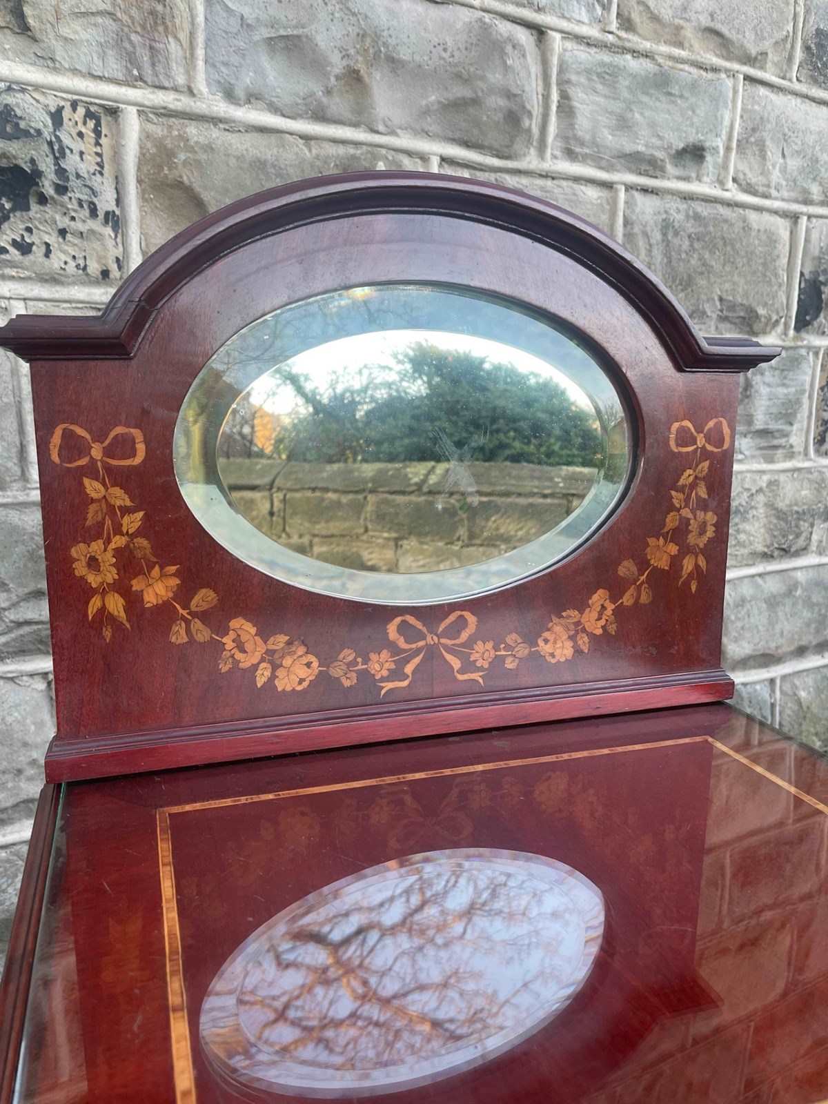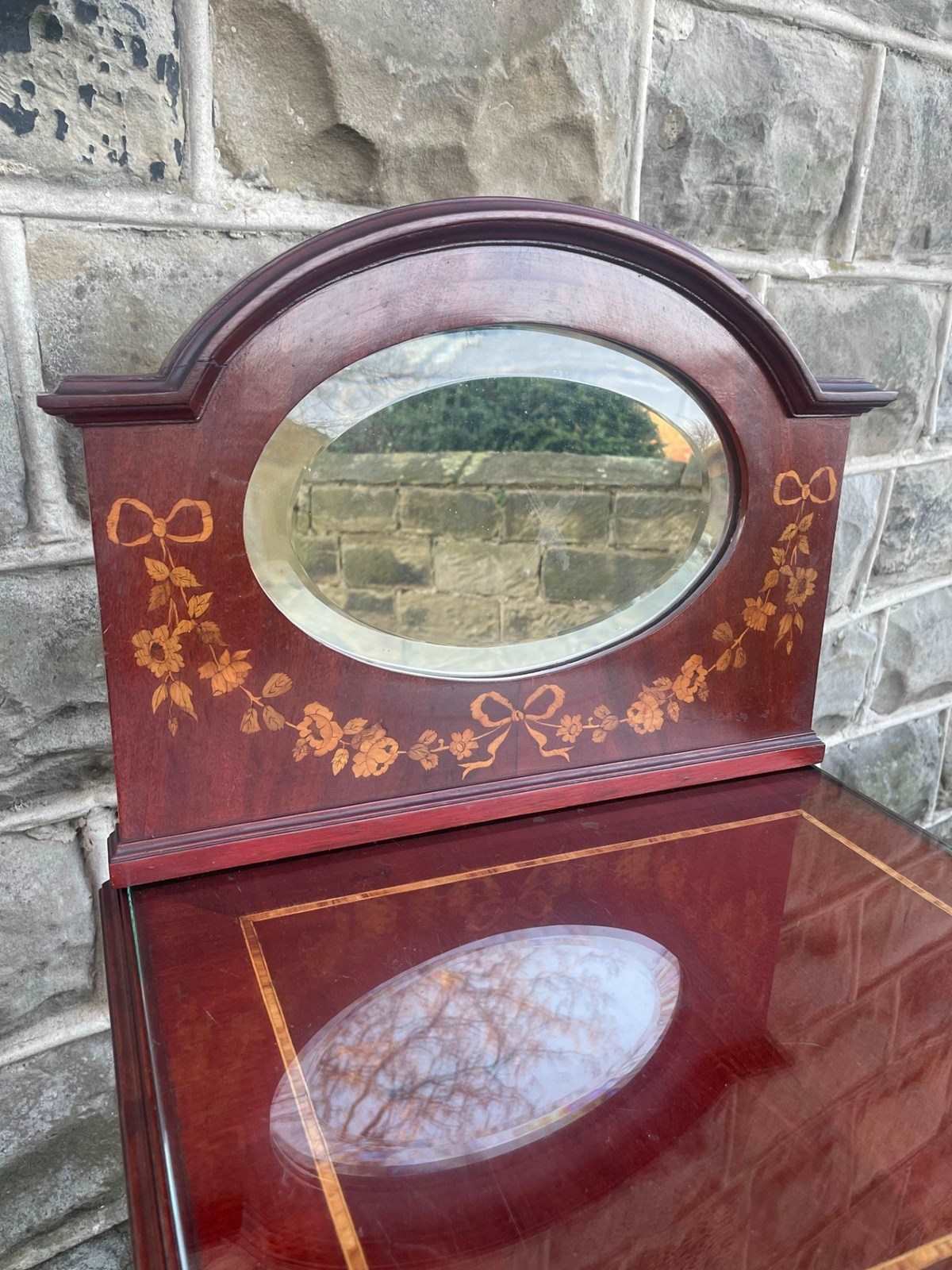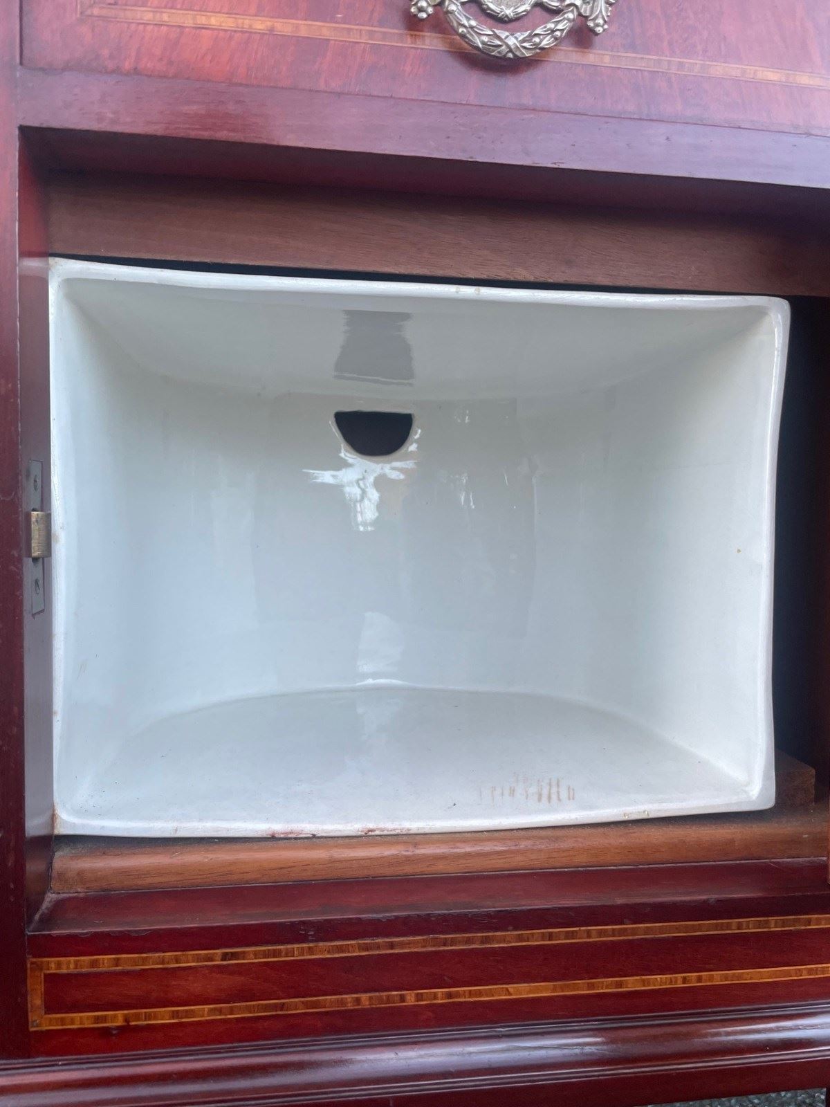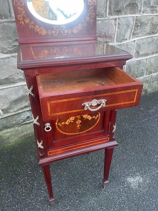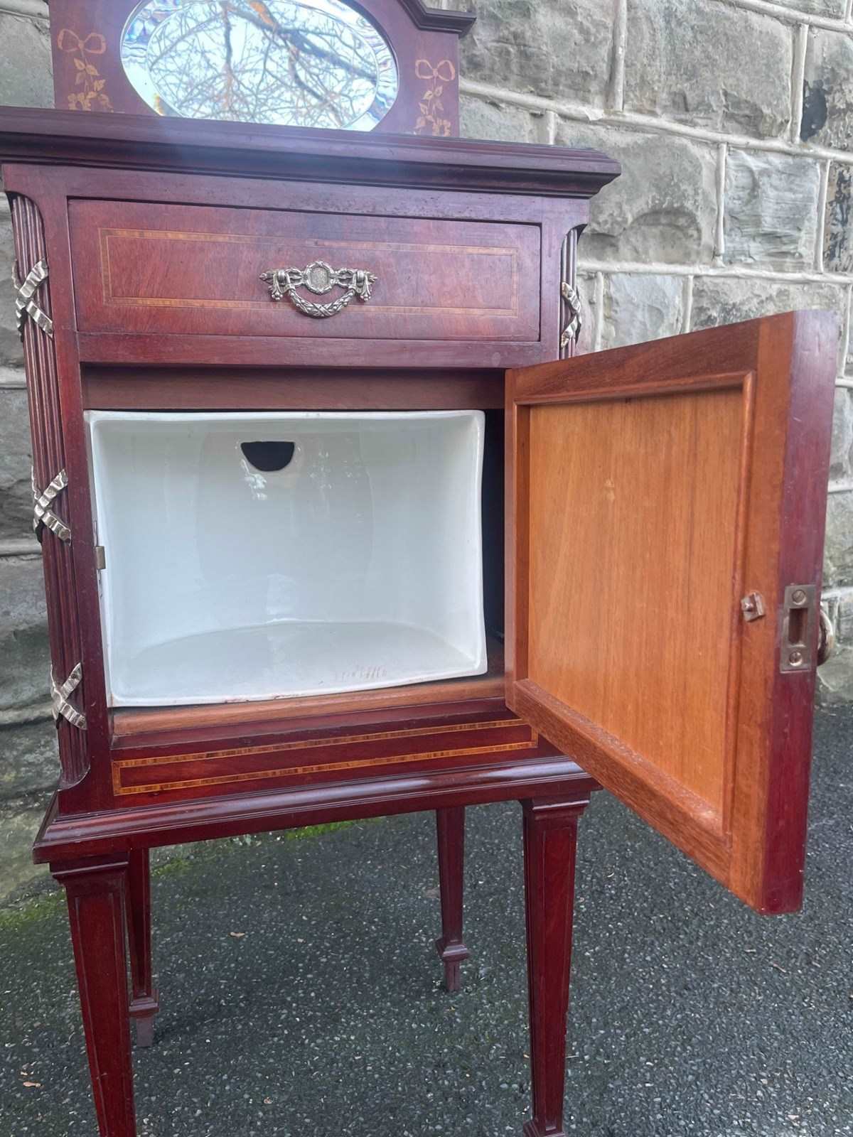 In mahogany, shaped mirror back with inlaid decoration. Glass protection top, inlaid satin wood banding around the top, single draw above an inlaid cupboard door. The cupboard retaining its original ceramic liner. Gilt metal mounts to the reeded sides. Standing on square tapering legs with a spade foot. Polished mahogany sides