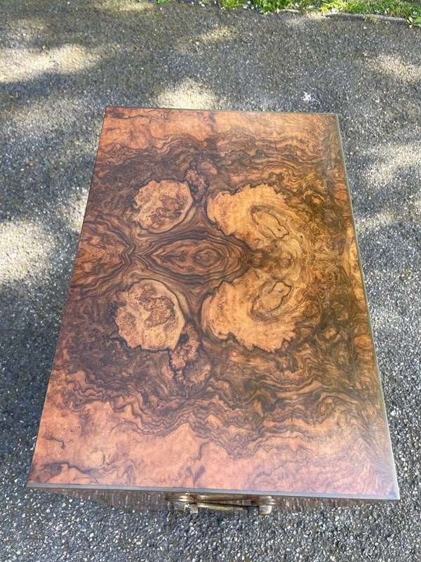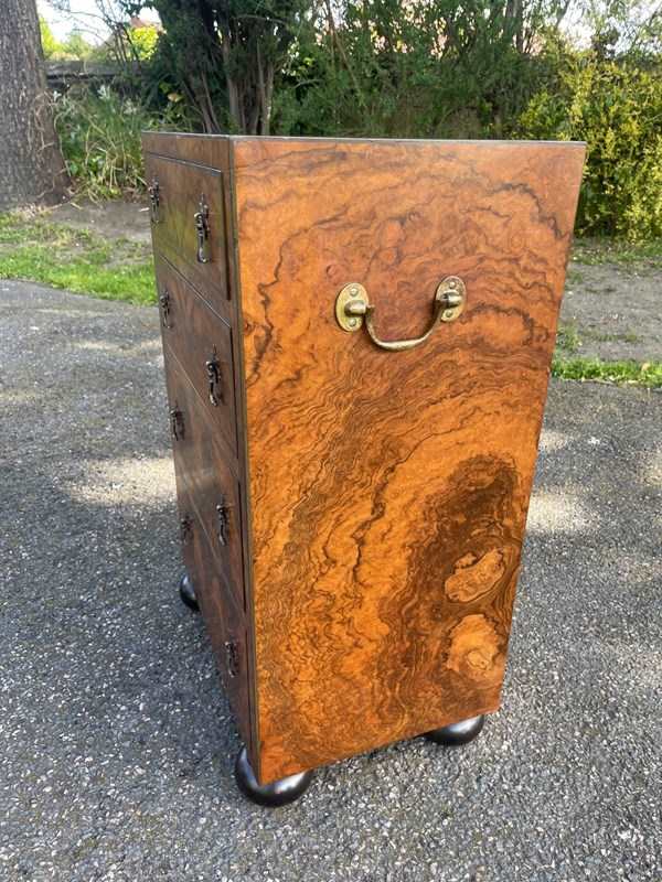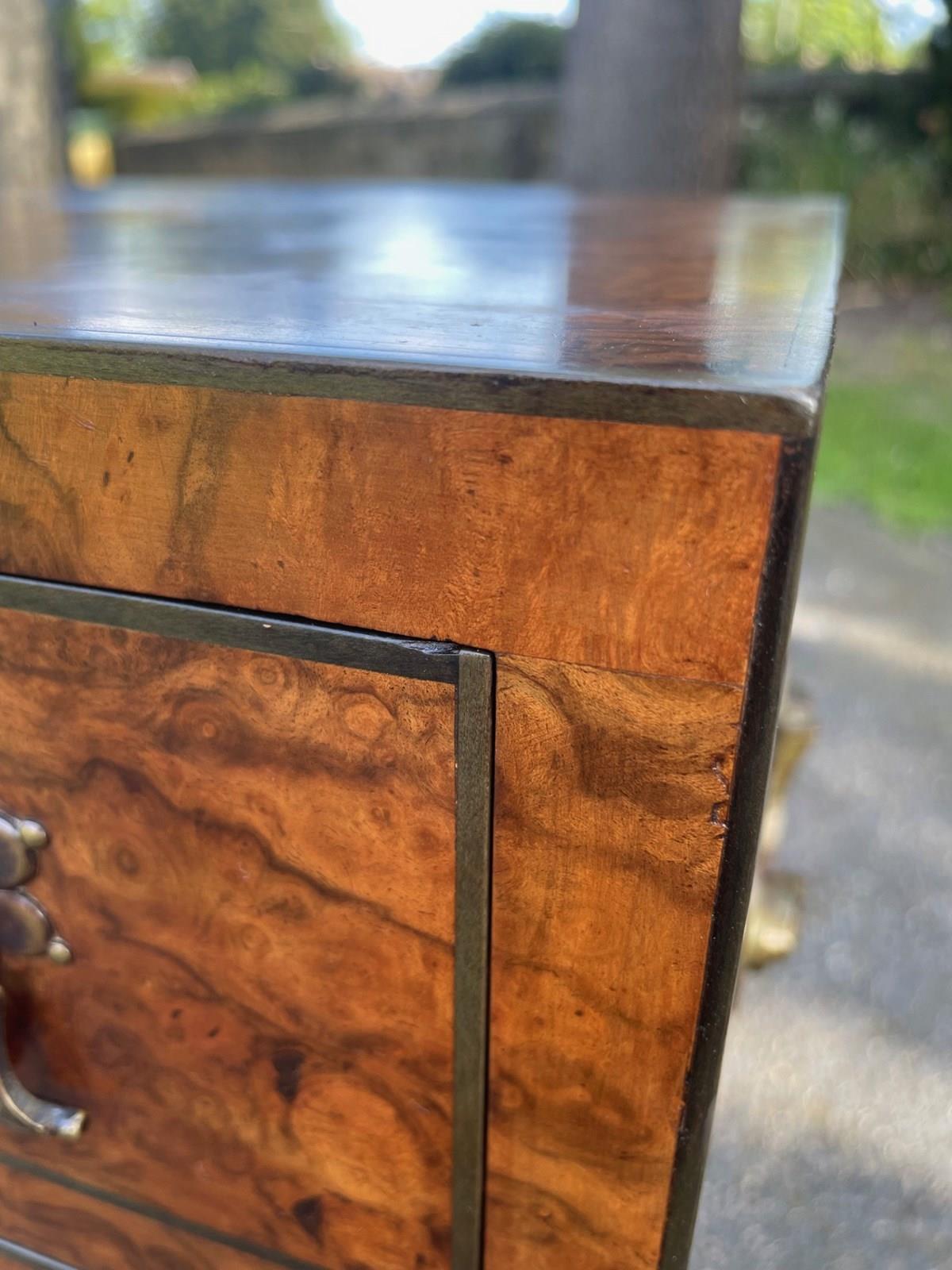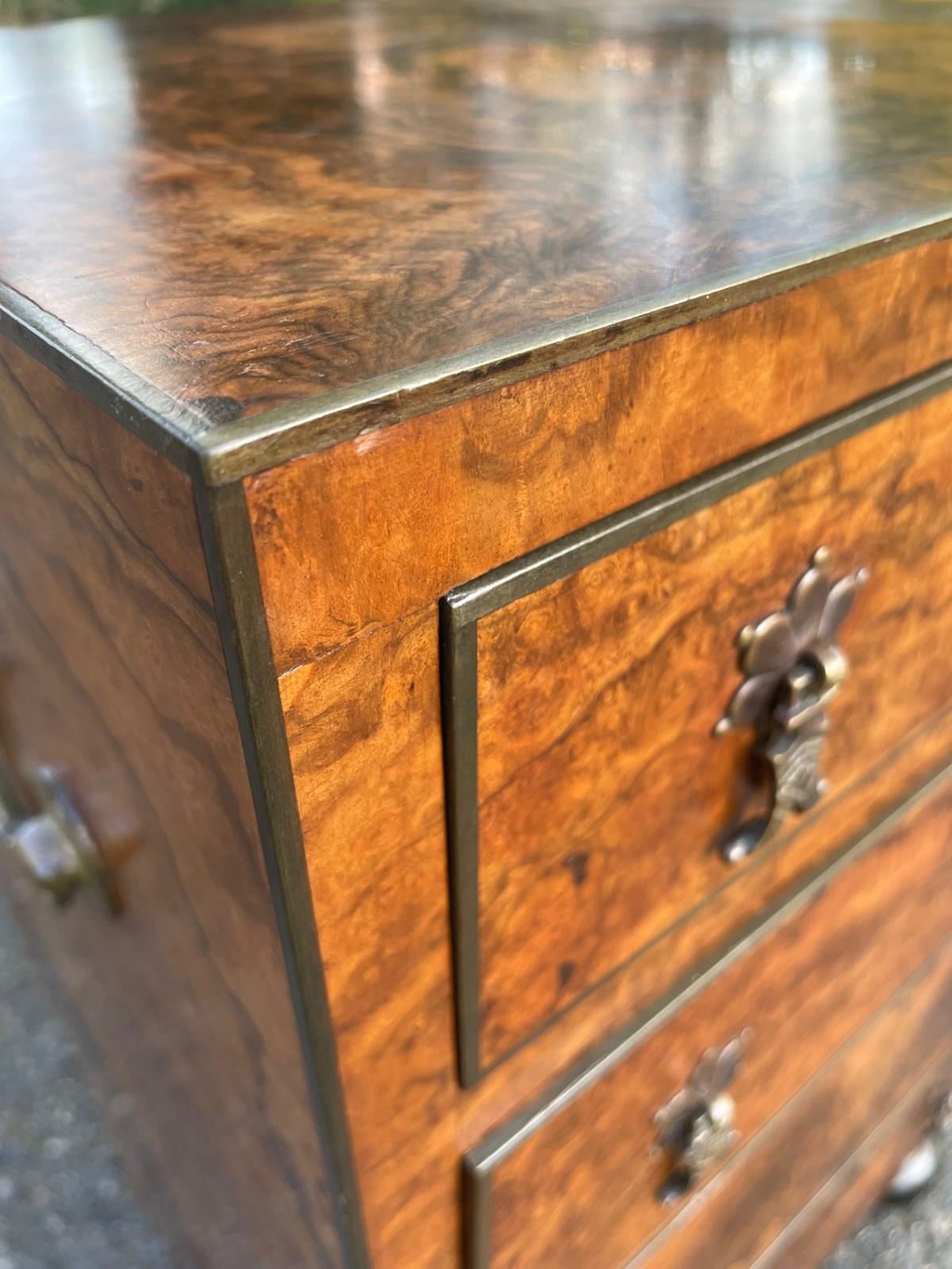 Delightful small size & proportions. In burr walnut having 4 draws with brass drop handles, brass edging around the draws and the chest itself.n Polished burr walnut sides with brass side handles. Standing on bun feet.