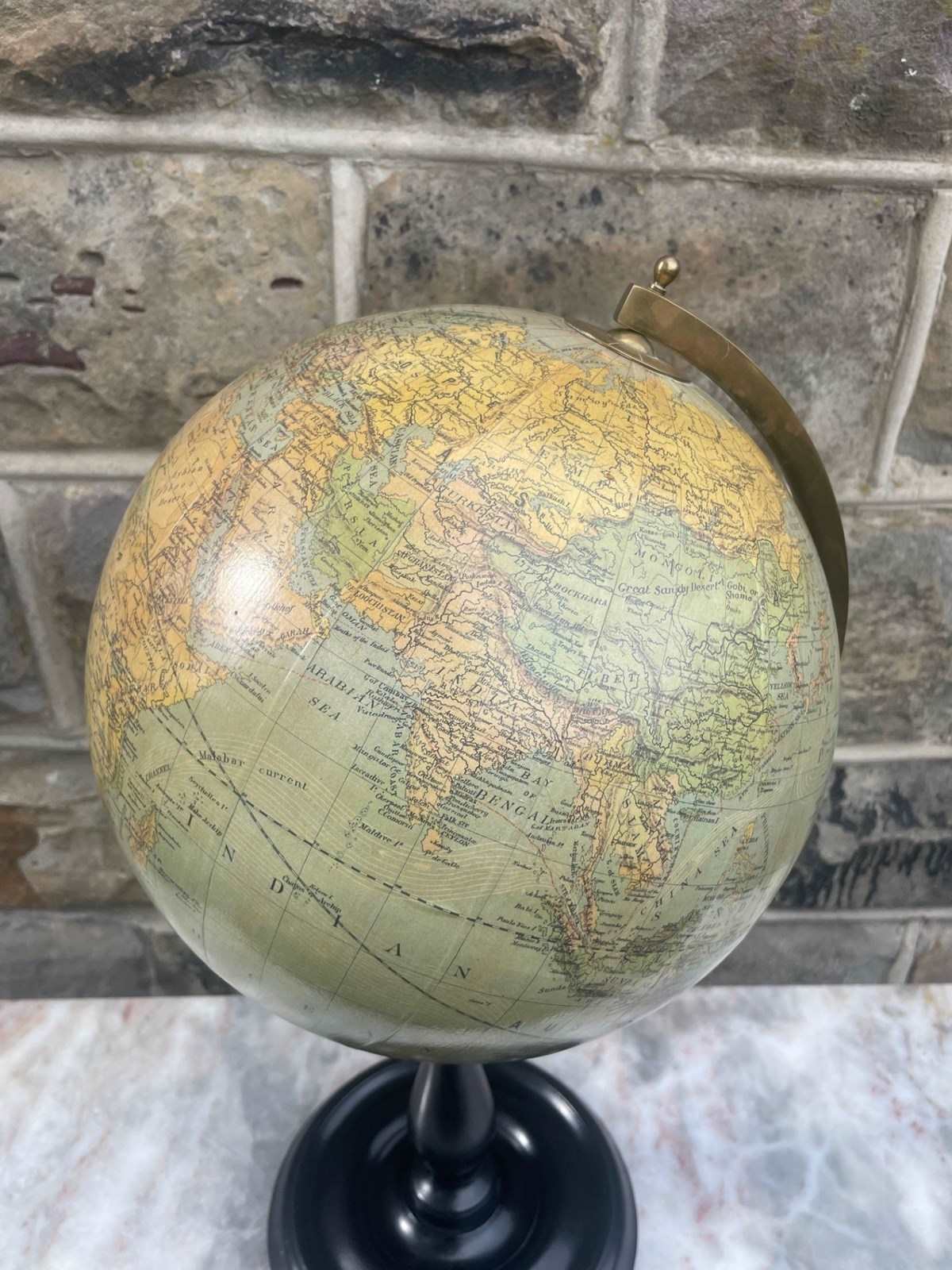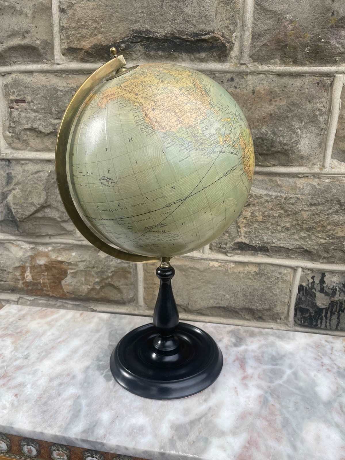Offered for sale is this 12" terrestrial globe on ebonised stand by Greaves & Thomas