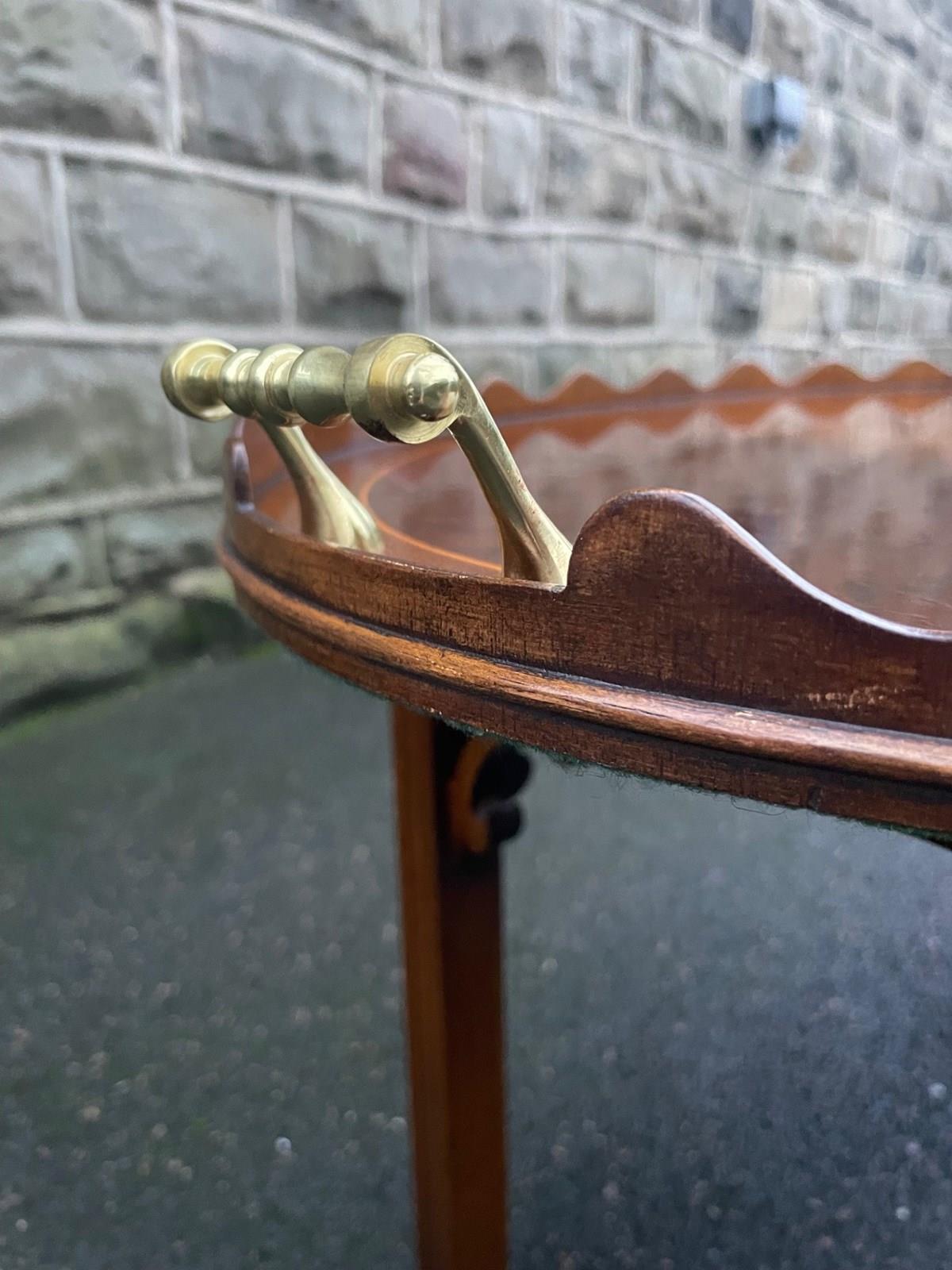 The oval tray in burr walnut with a wavey gallery, brass handles, inlaid centre & border. Sits upon a walnut stand with square lets & ornate corner brackets