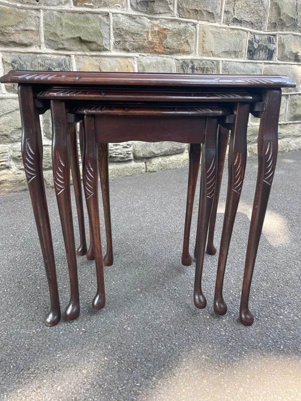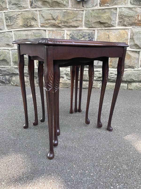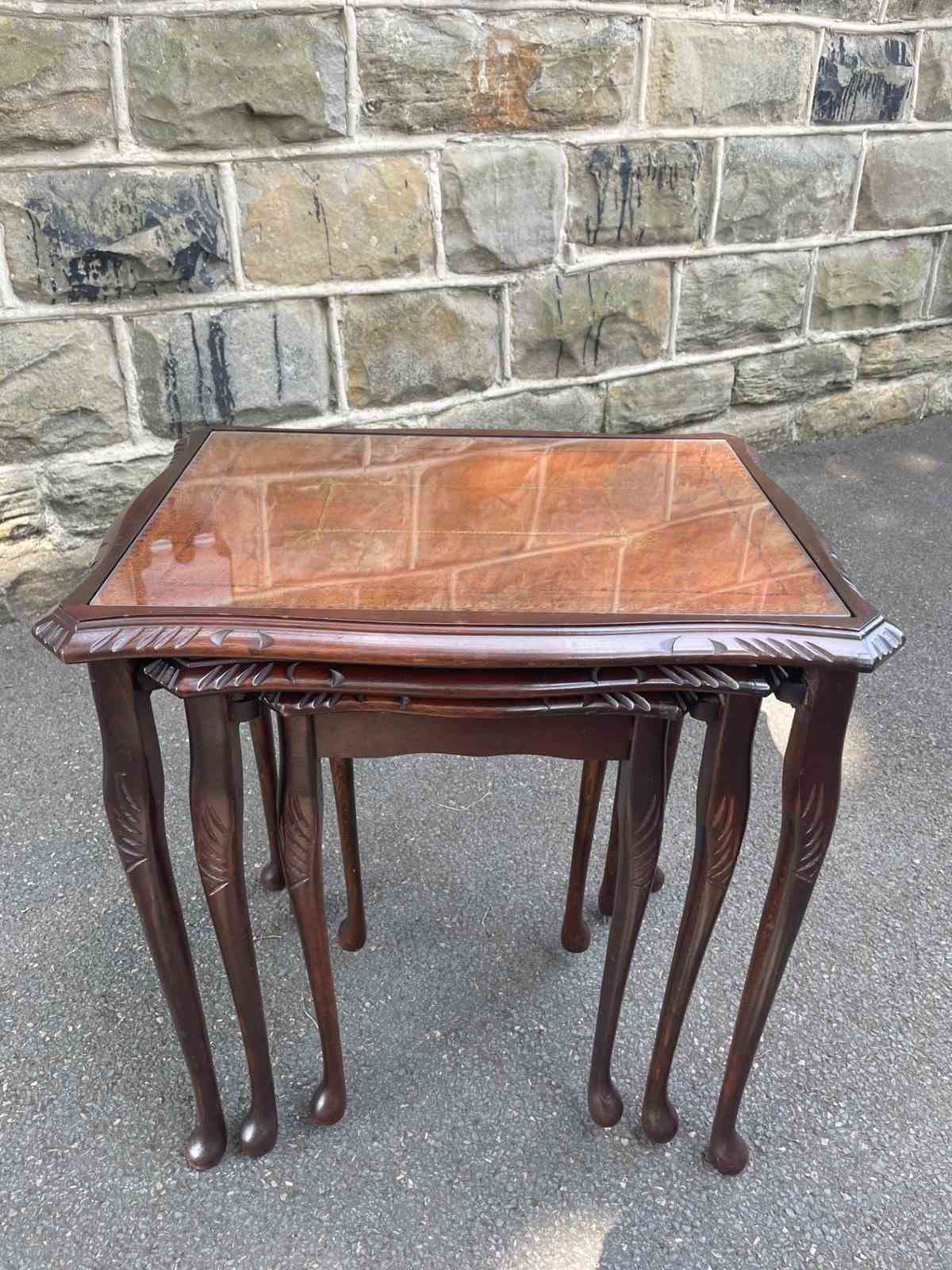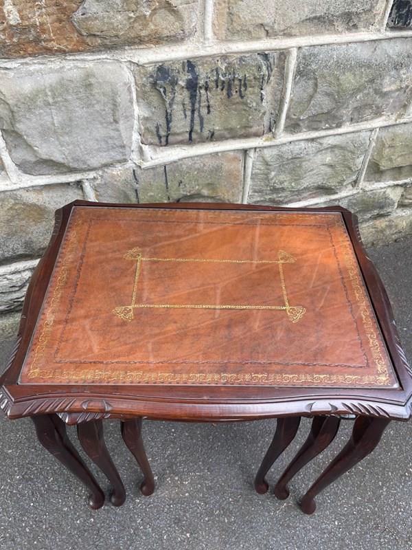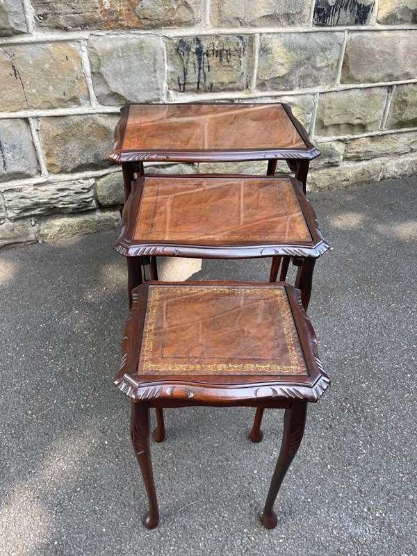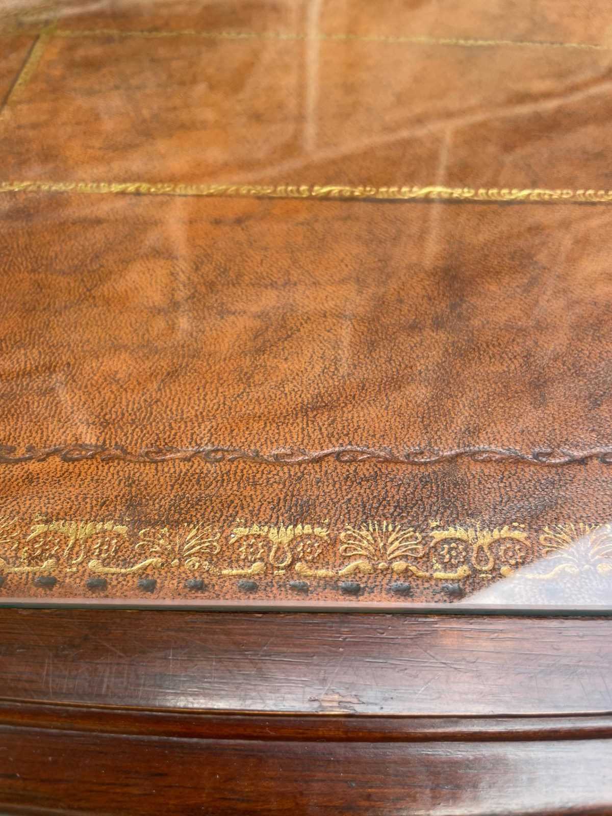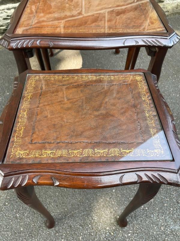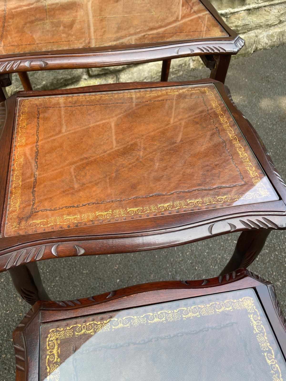 In mahogany, carved edge to the tops, inset tan coloured tooled leather centre with protective plate glass tops. Standing on slender carved cabriole legs with a pad foot.