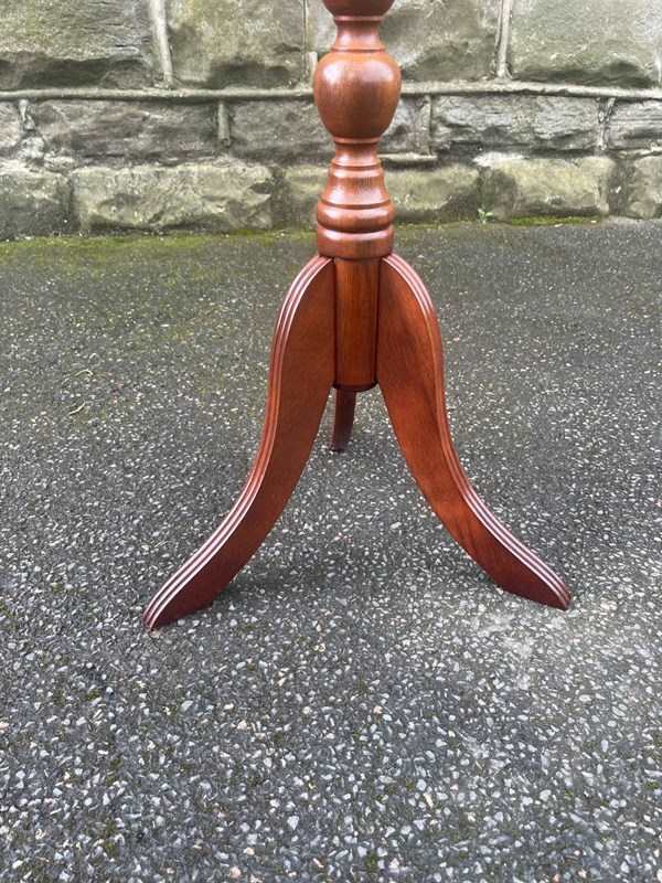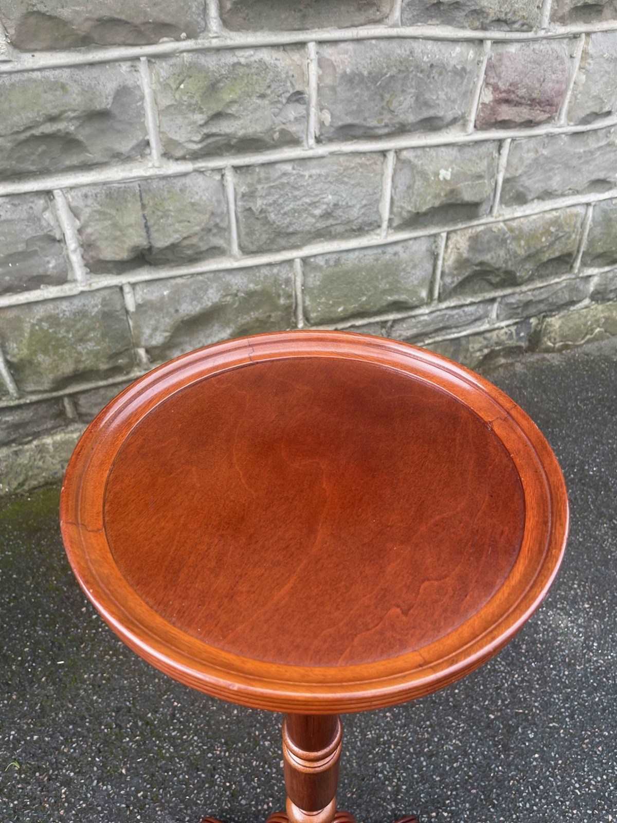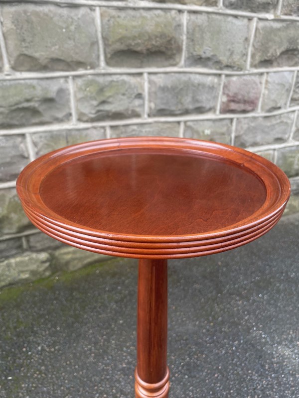Circular mahogany dished top with a turned column standing on 3 shaped legs