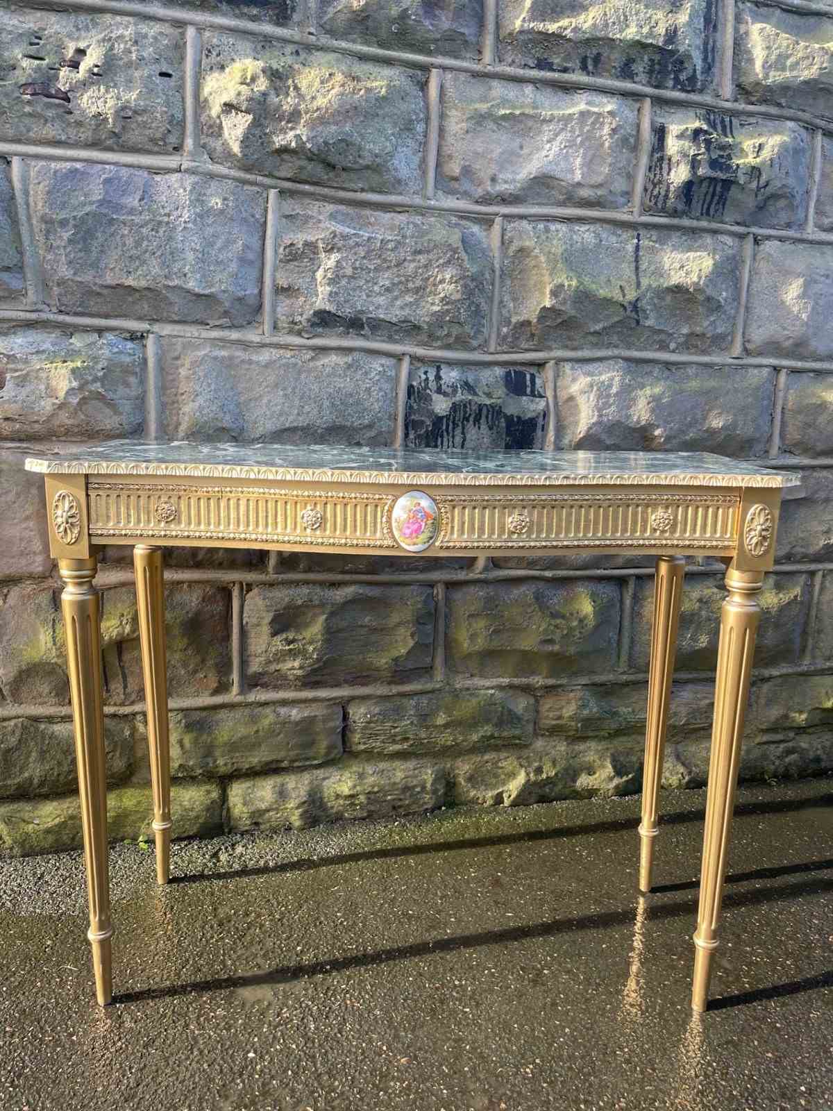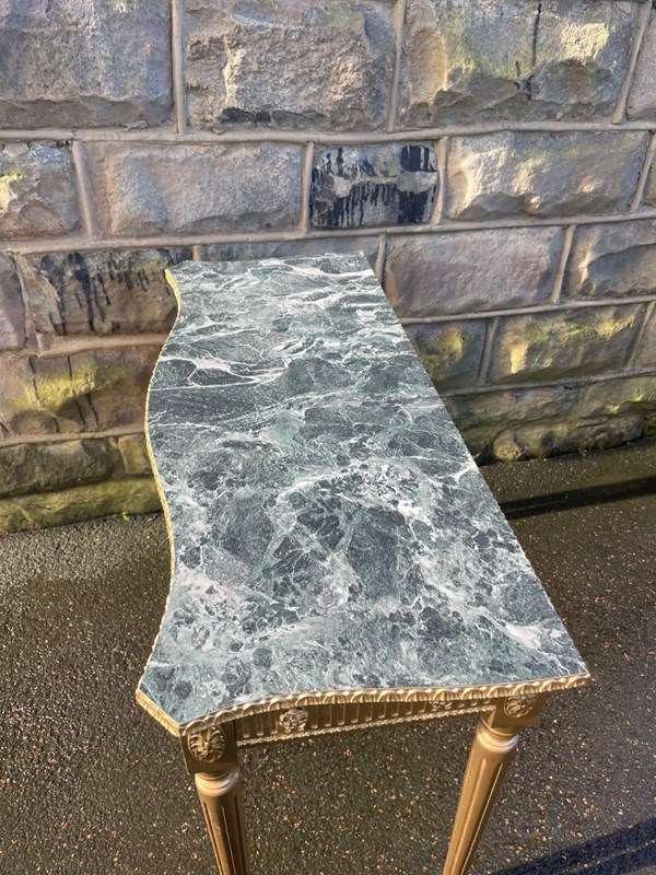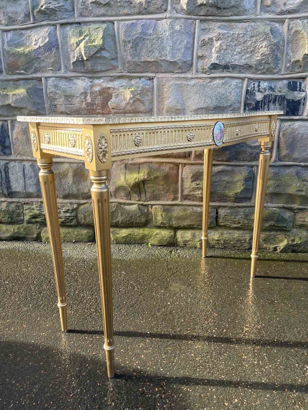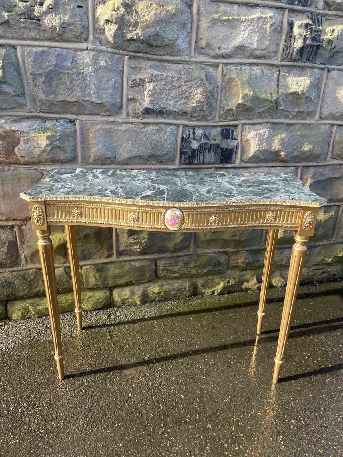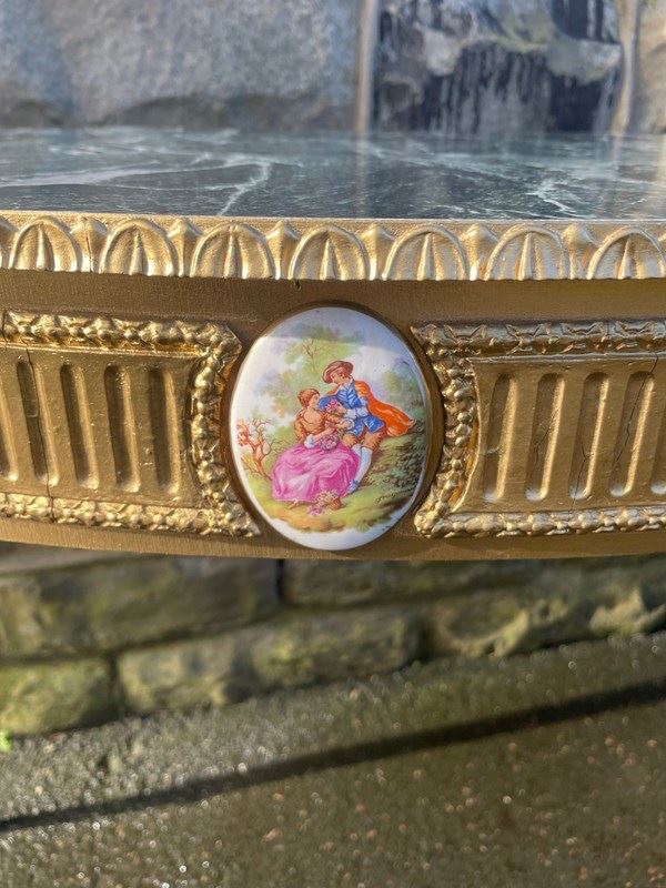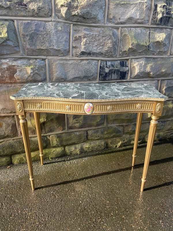 Serpentine front, Faux marble top original gilded finish, turned reeded legs, central porcelain plaque.