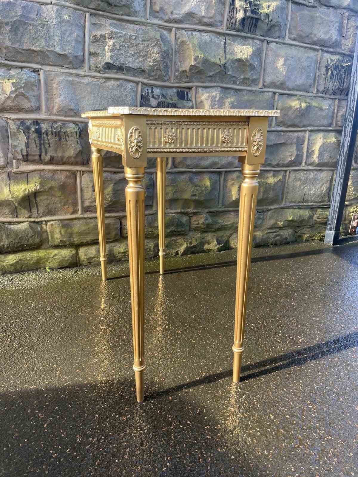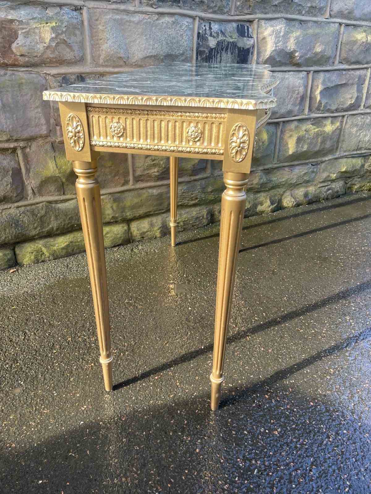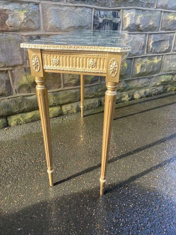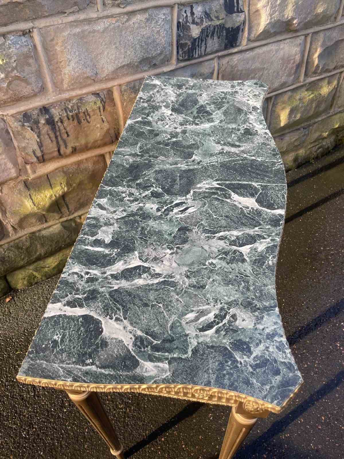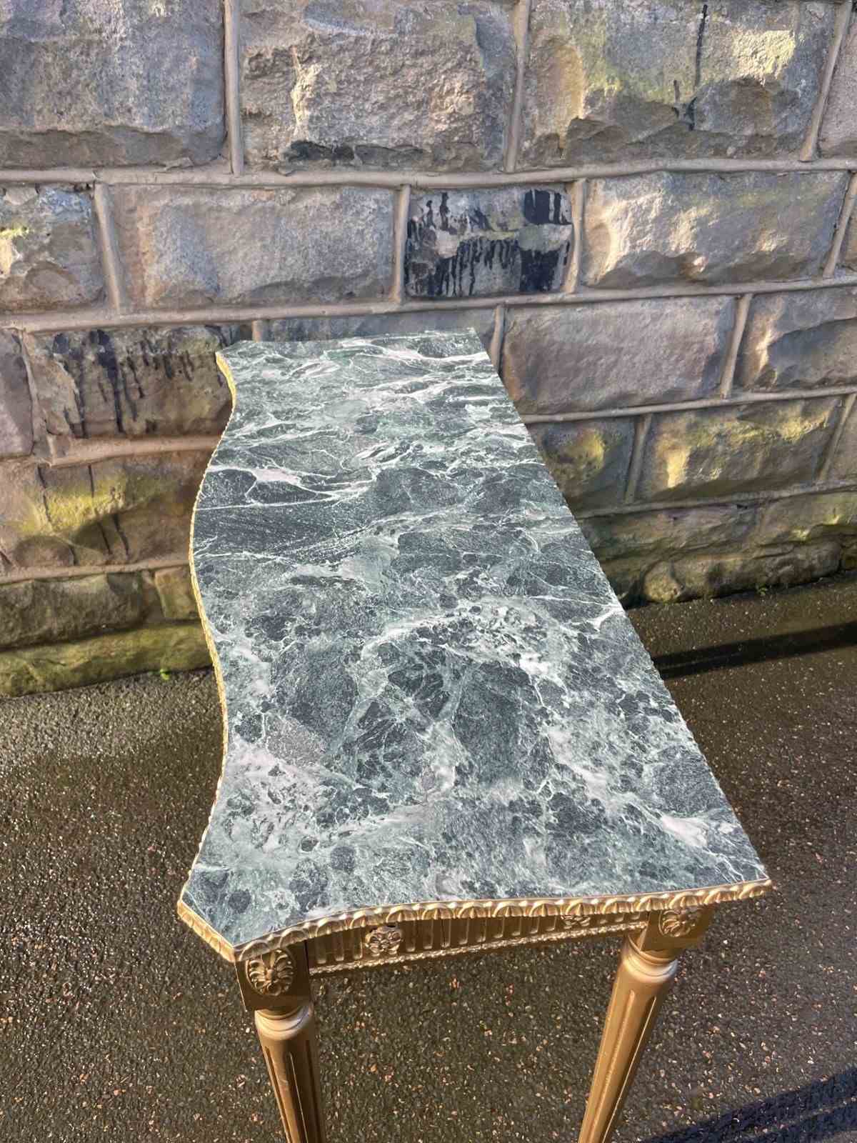 Serpentine front, Faux marble top original gilded finish, turned reeded legs, central porcelain plaque.