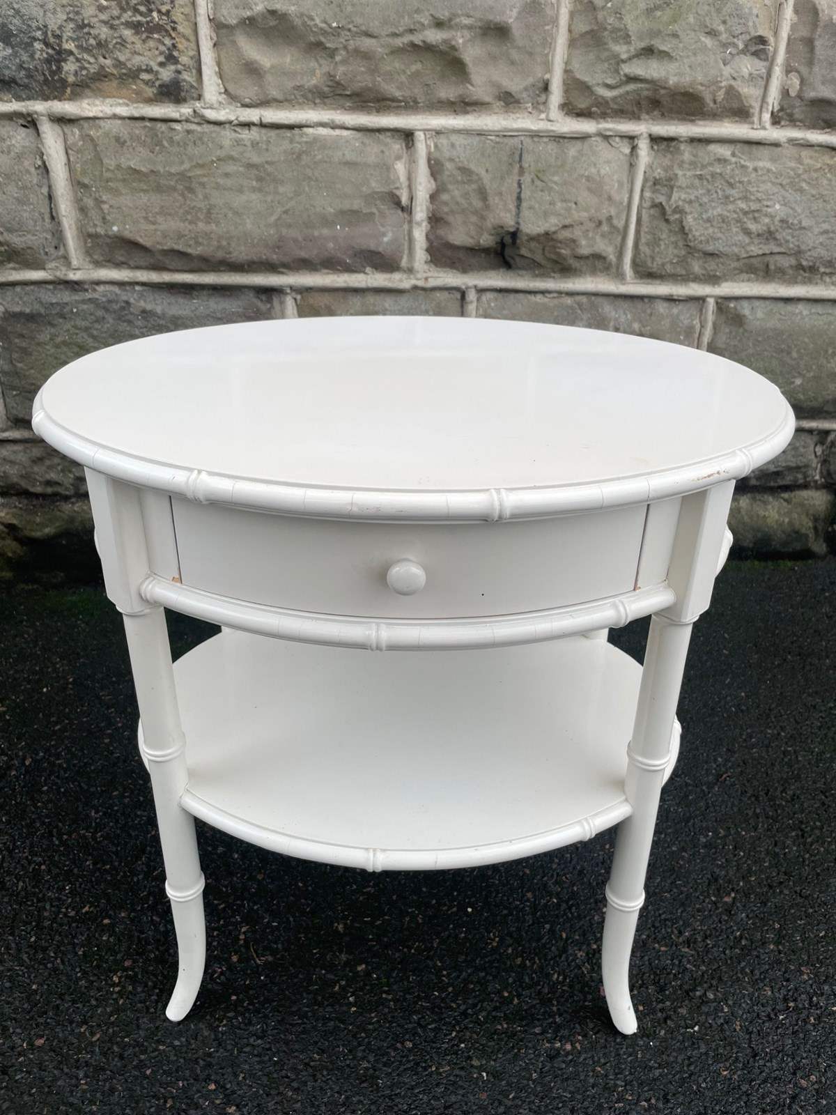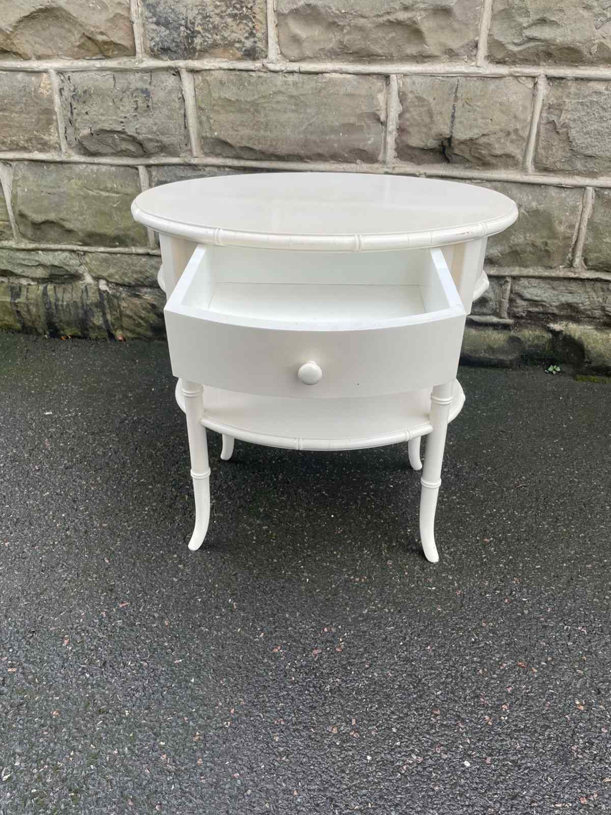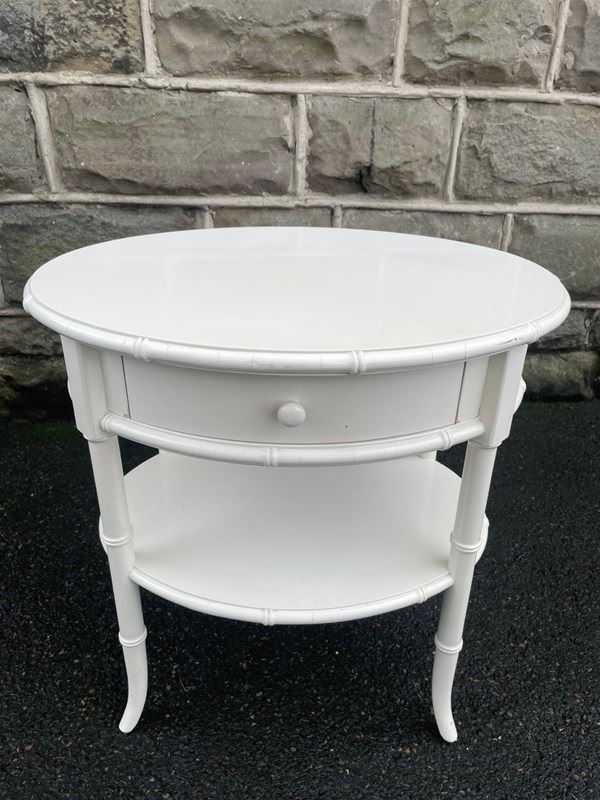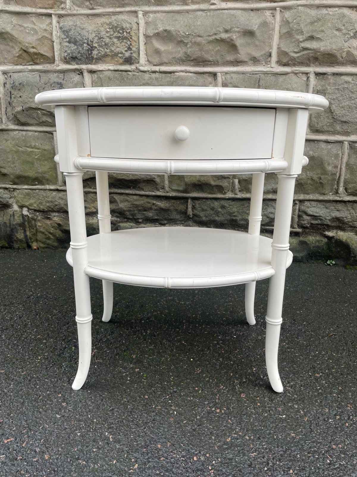 Oval shape in simulated bamboo having a white painted finish. Single draw with under shelf