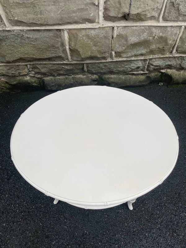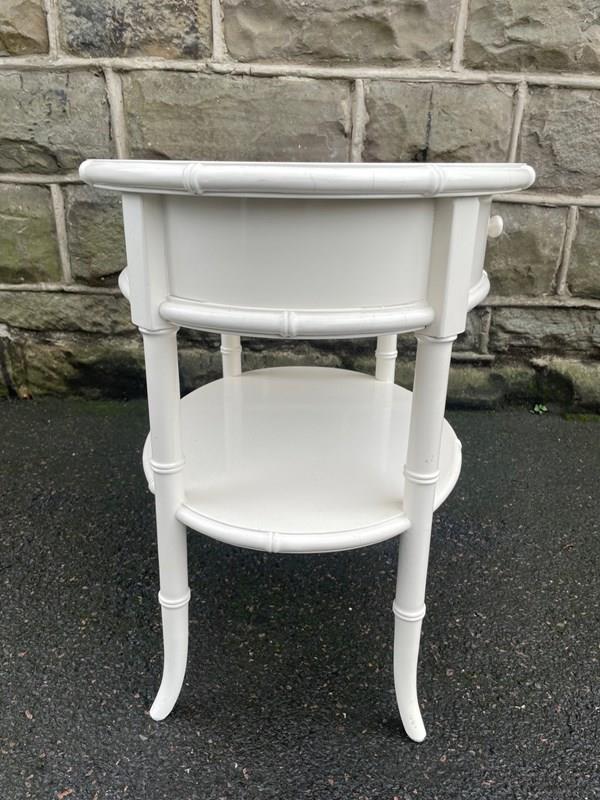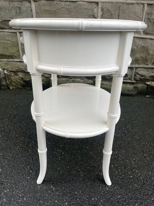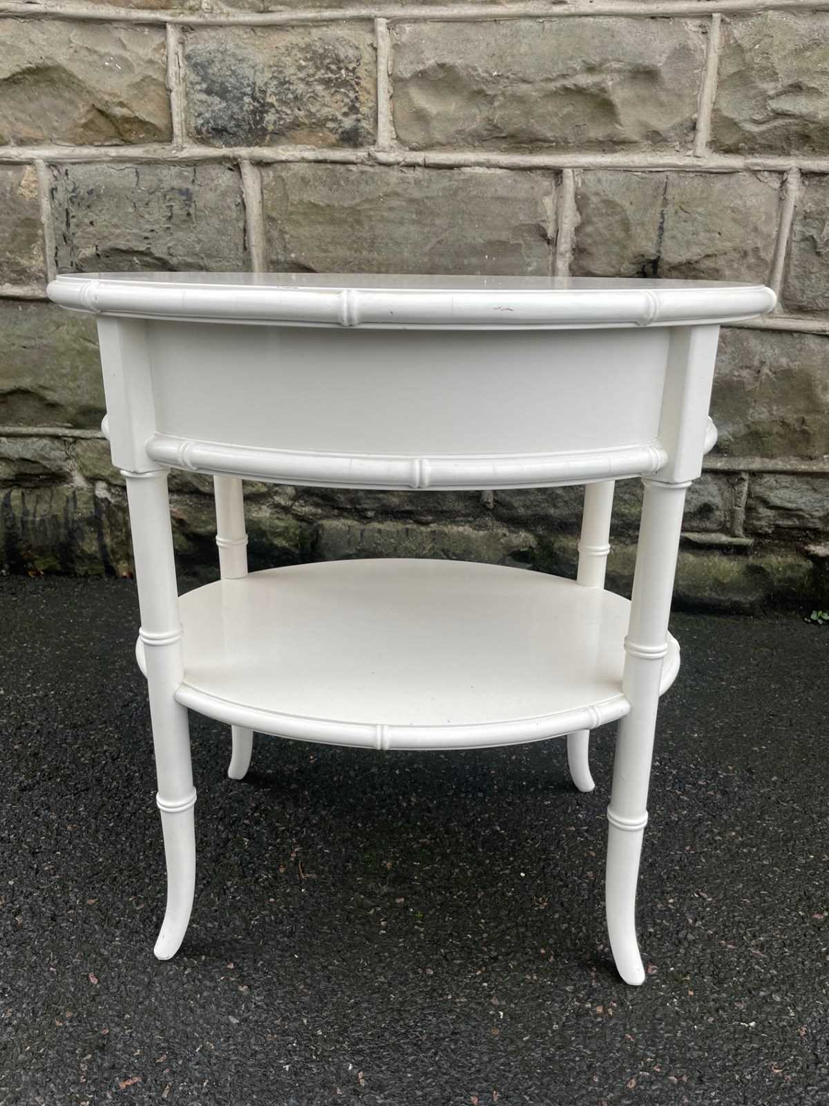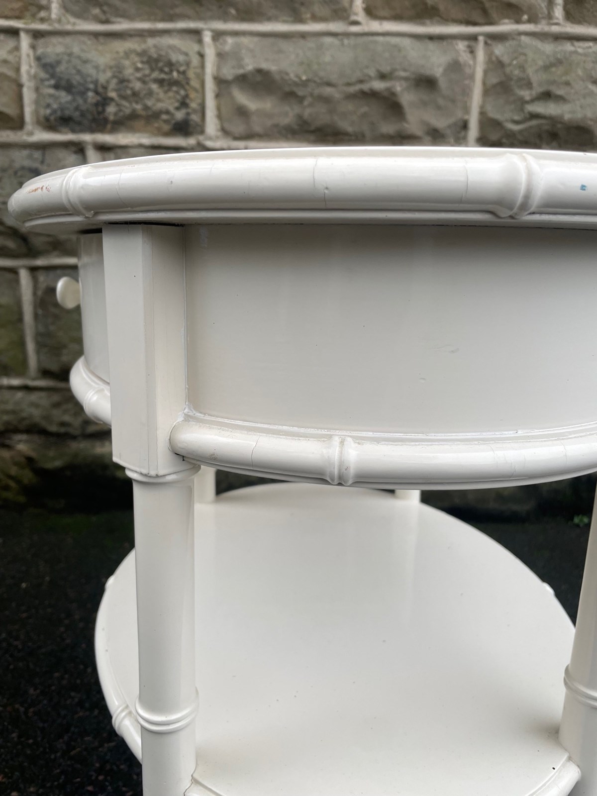 Oval shape in simulated bamboo having a white painted finish. Single draw with under shelf