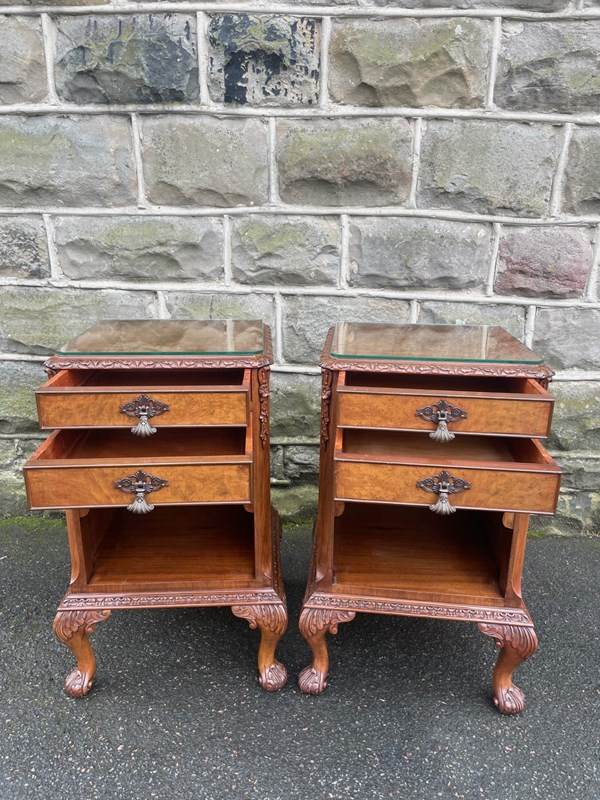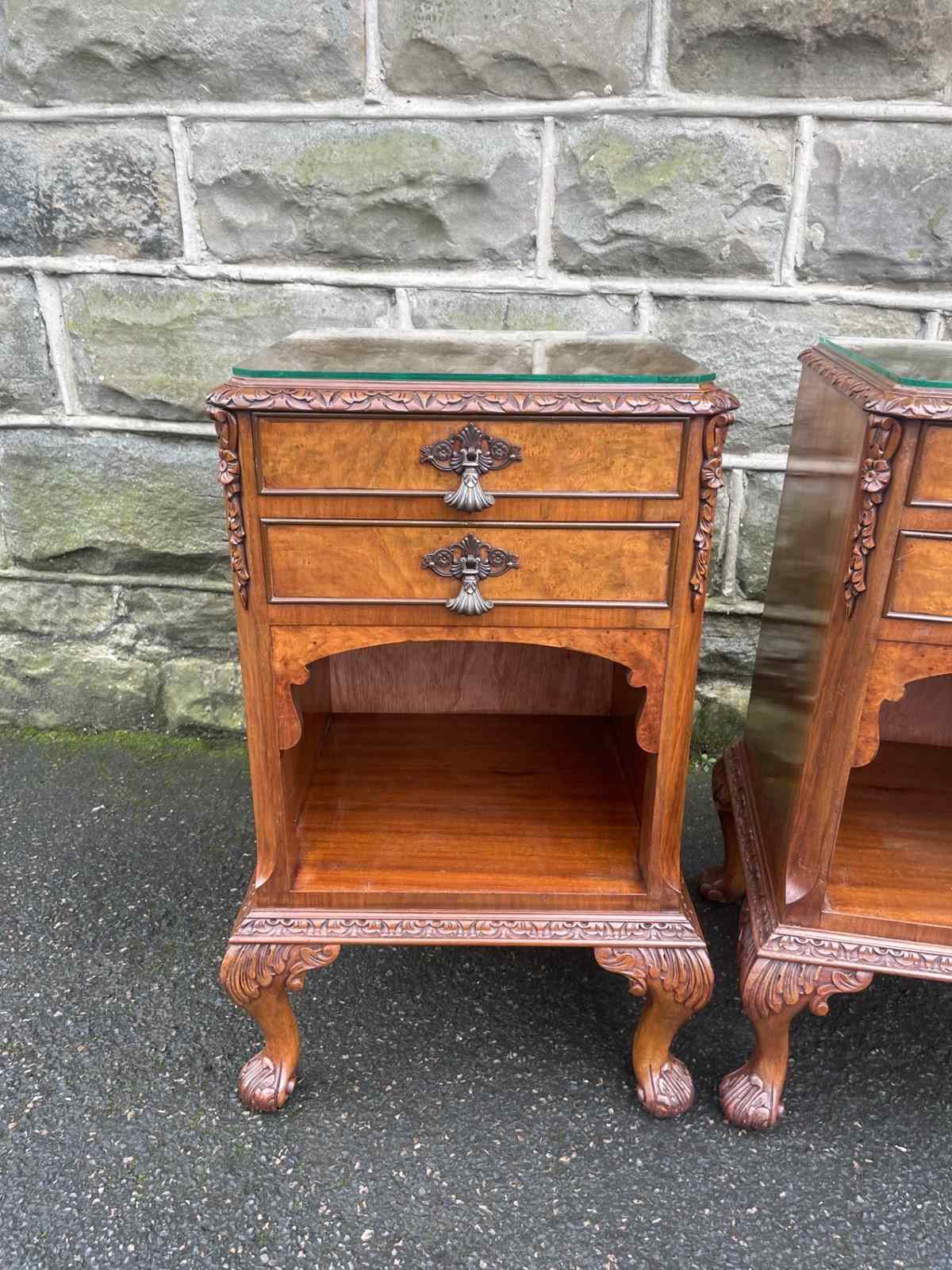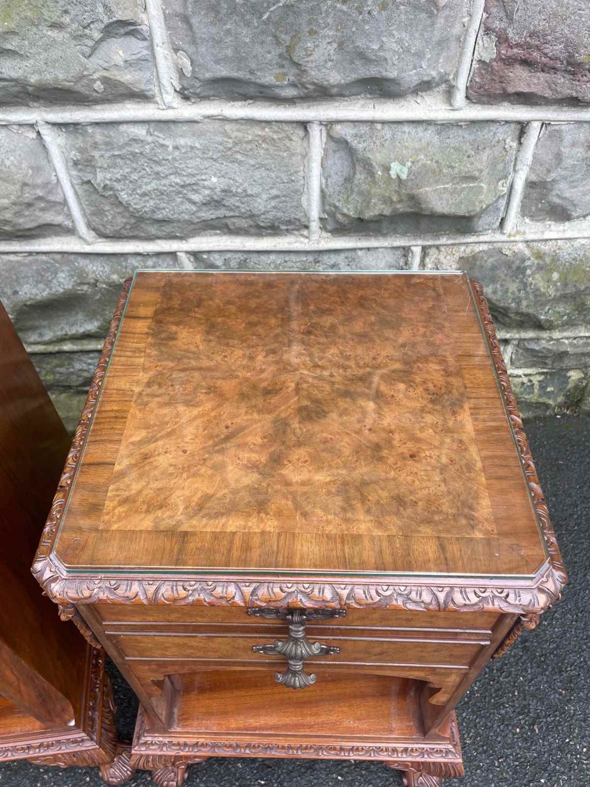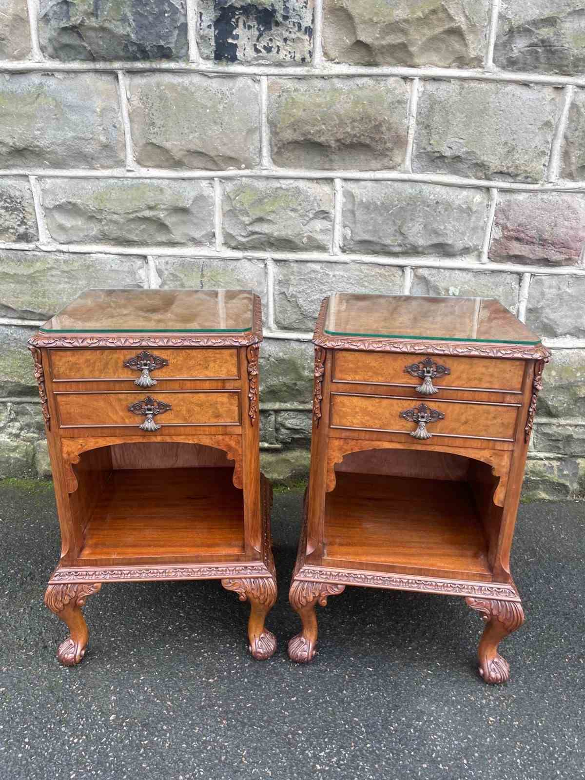 In burr walnut, protective glass tops, 2 draws with open storage area below, polished walnut sides standing on well carved small cabriole feet